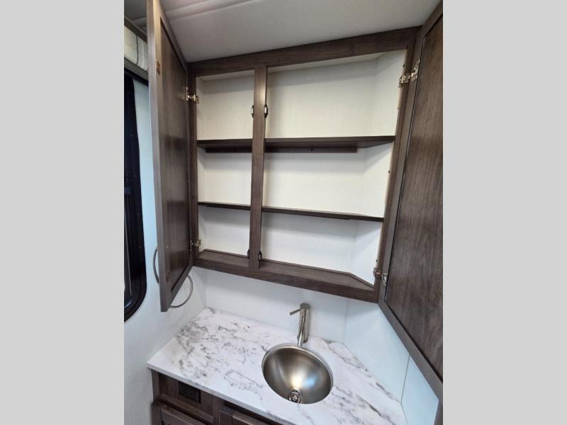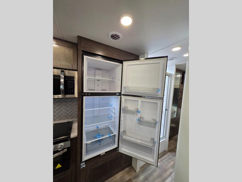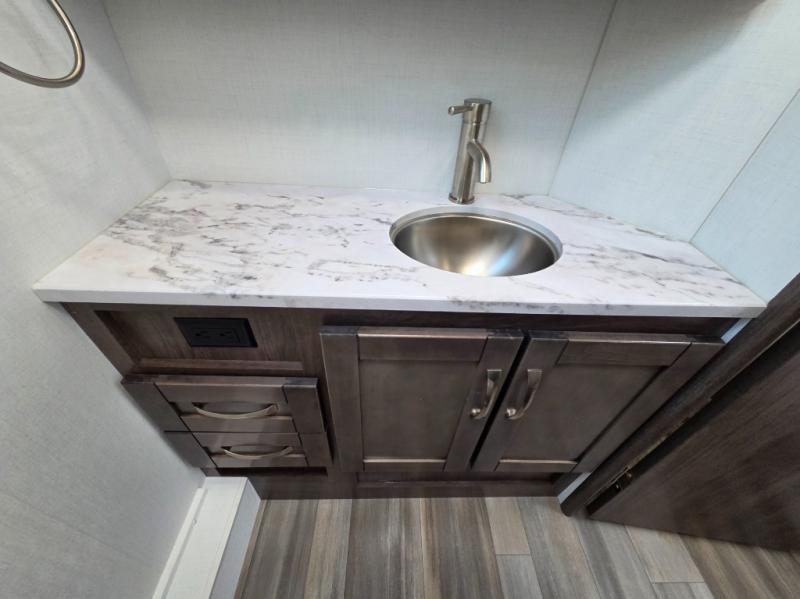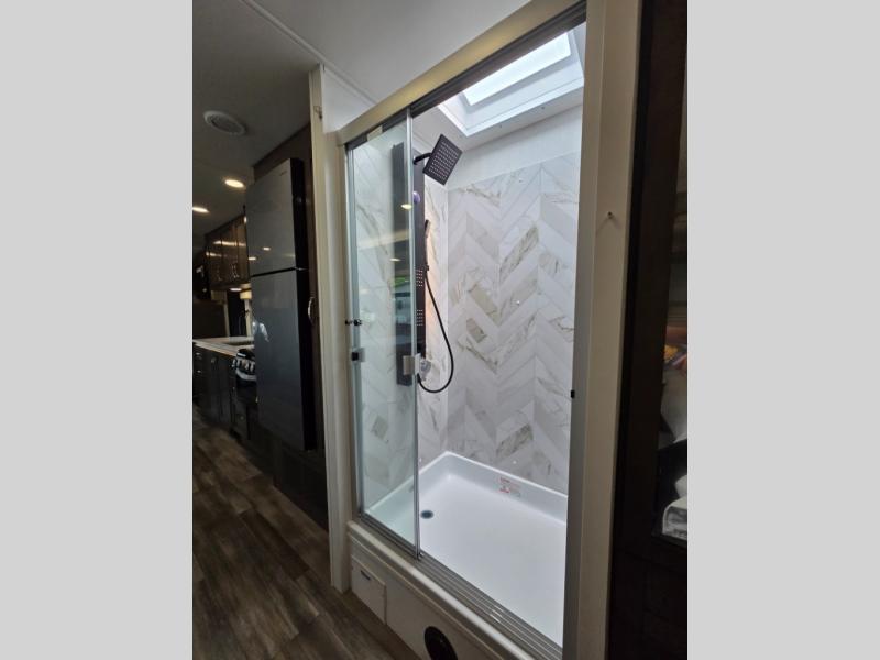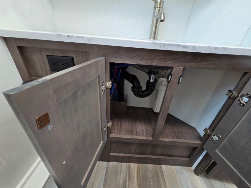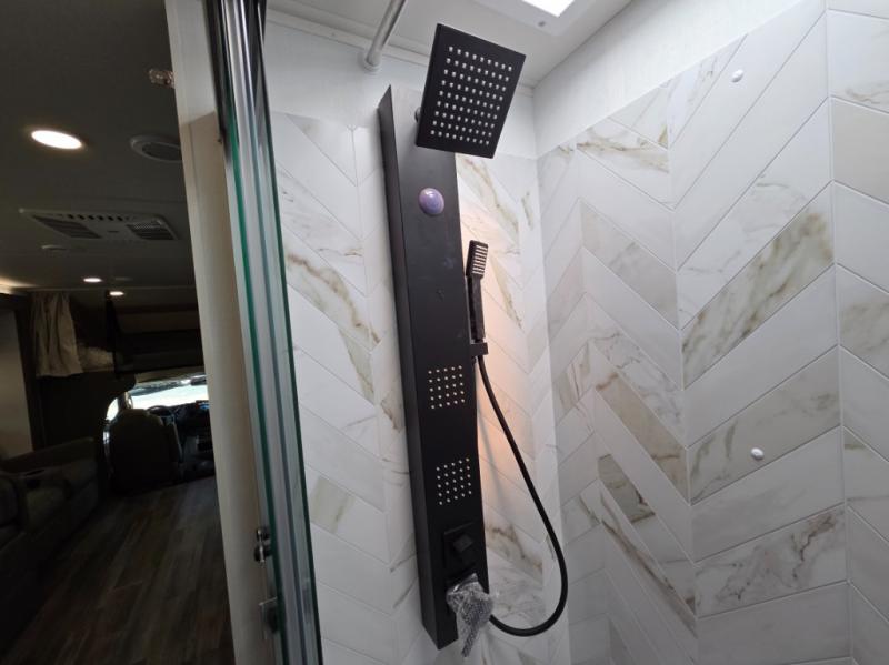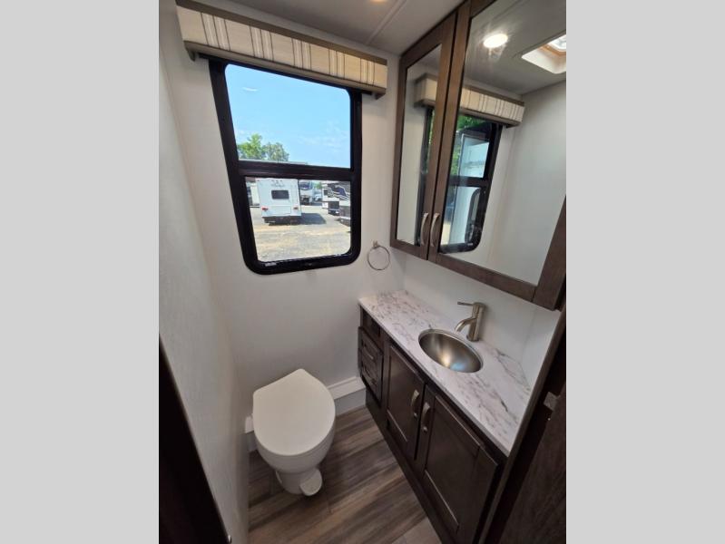 This motorhome includes double slides so you can enjoy more interior space, just like at home! The 42" x 70" booth dinette and 60" tri-fold sofa are in great view of the LED HD Smart TV, and your guests can sleep here, as well as on the cab-over bunk. This Greyhawk kitchen includes a Furrion all-in-one cooktop and oven, a residential-size microwave, and a pantry to store dry goods. You will find a convenient 30" x 36" shower, with the private toilet and sink across the hall so two people can freshen up at once. And don't overlook the rear bedroom with its queen bed slide out, dual bedroom wardrobes, and cabinet!