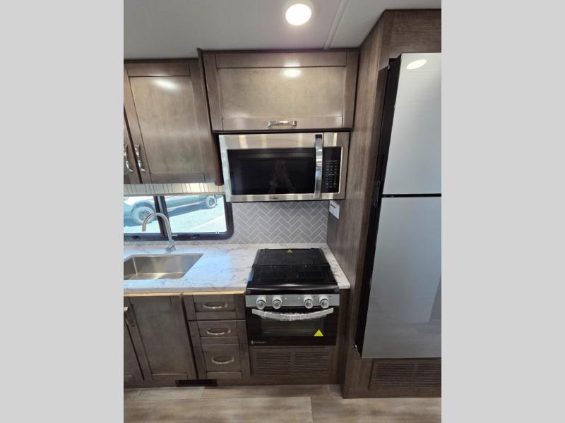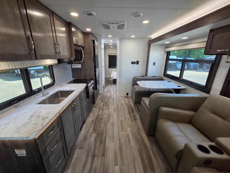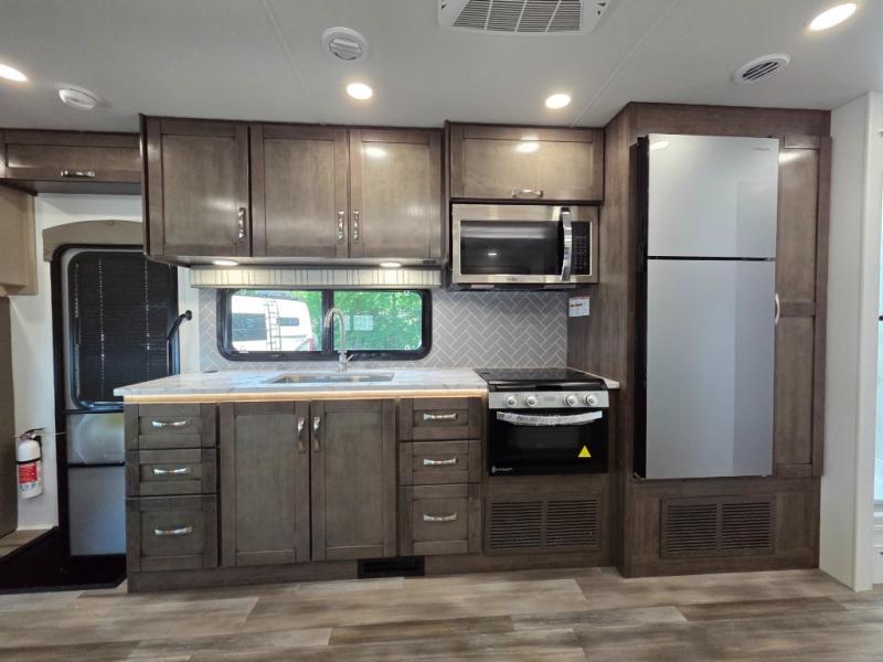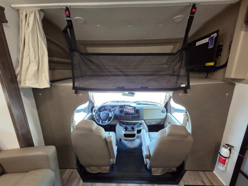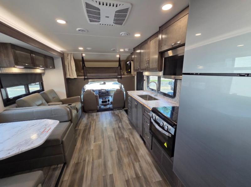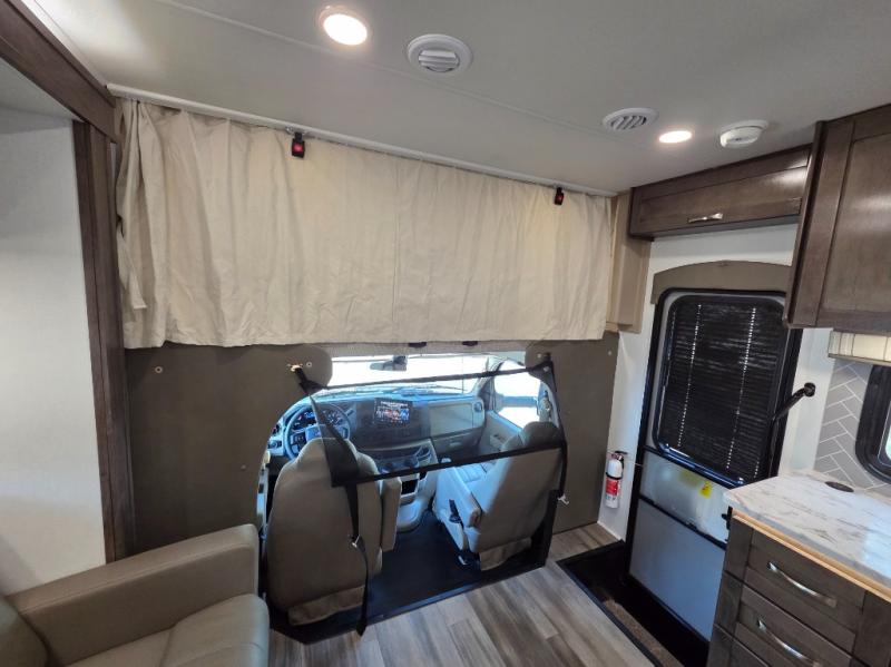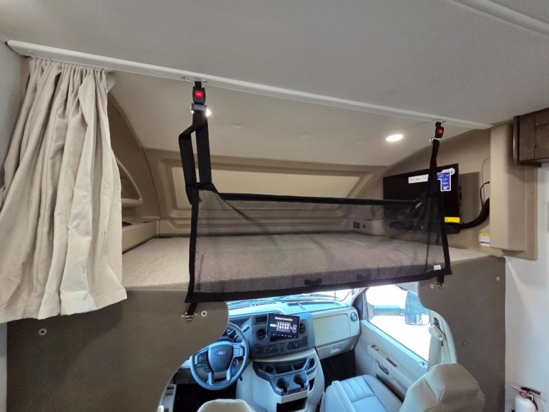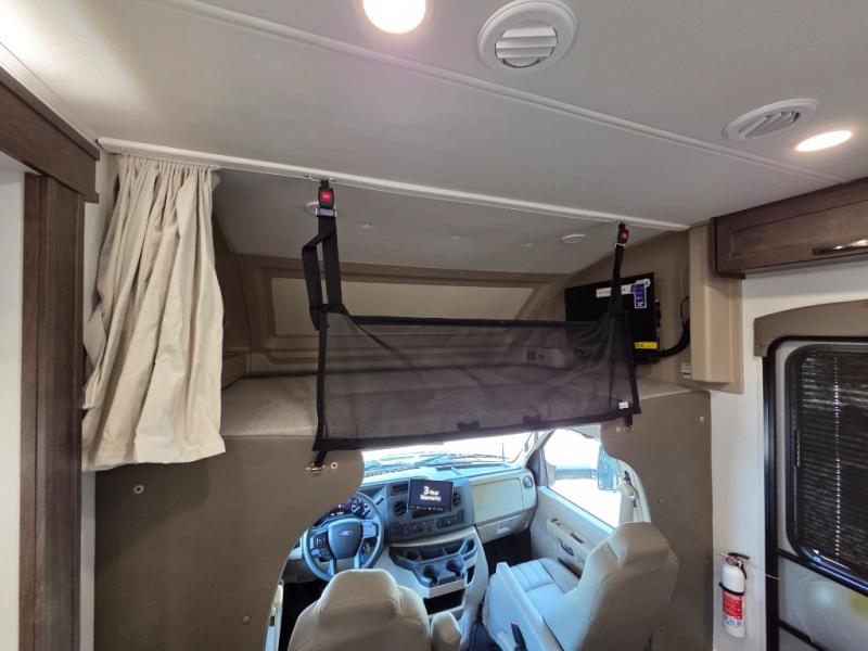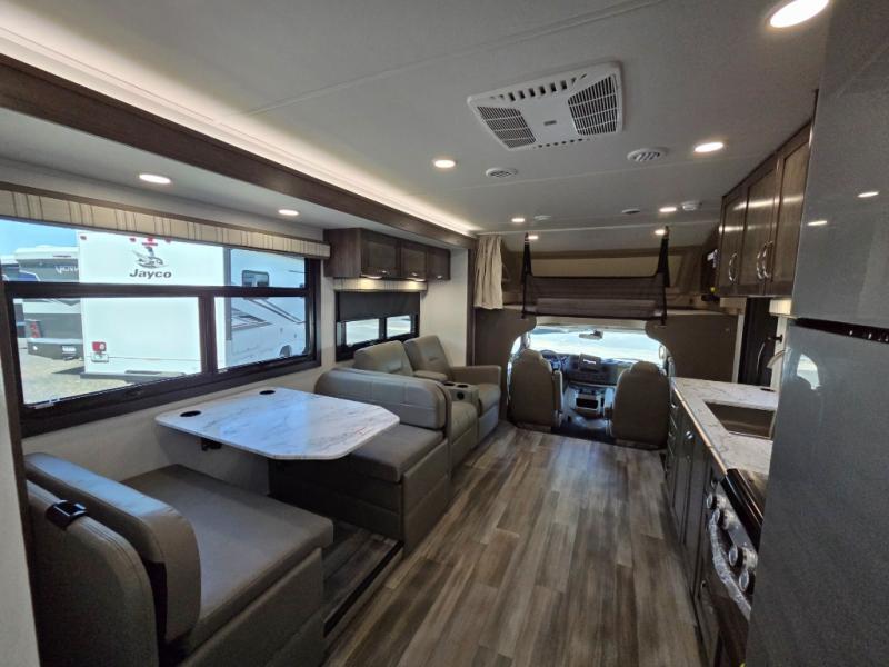 With any Greyhawk Class C gas motorhome by Jayco you will experience smooth sailing thanks to the JRIDE PLUS that comes with Koni shock absorbers, a computer-balanced driveshaft, Hellwig helper springs, and more. The Ford E-450 chassis with a 7.3L V8 325 HP engine will power your excursions, and you'll appreciate the added safety features for your peace of mind. Each model features a Sony infotainment center with Apple CarPlay and Android Auto, backup and side-view cameras, and a tire pressure monitor system the driver is sure to appreciate. Durable construction begins with Stronghold VBL roof, floor and sidewalls, bead-foam insulation, and a one-piece seamless fiberglass front cap. Head inside to find blackout night roller shades, LED-lit pressed countertops, an 84" interior ceiling height, and hardwood cabinet doors and drawers.