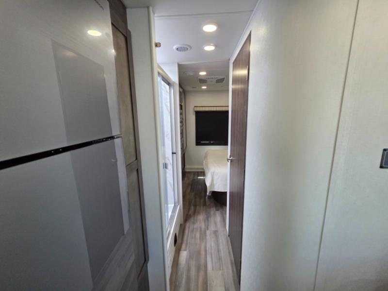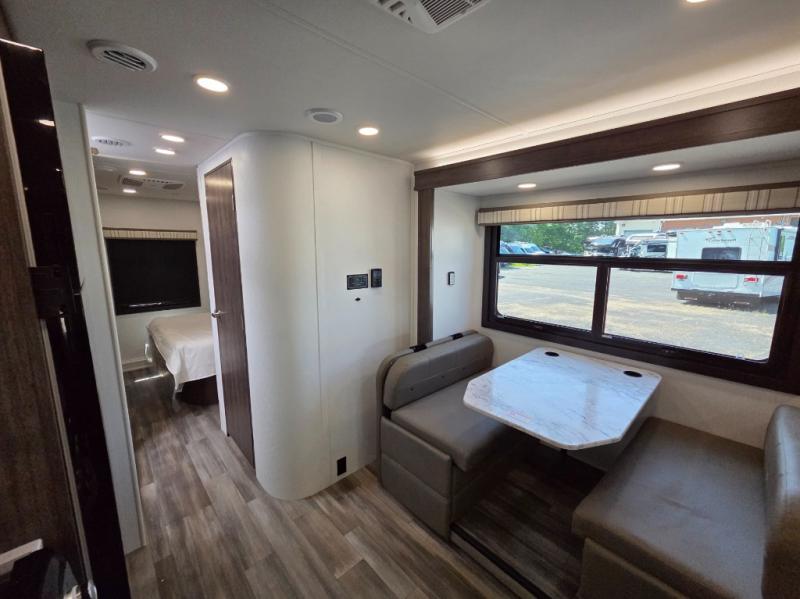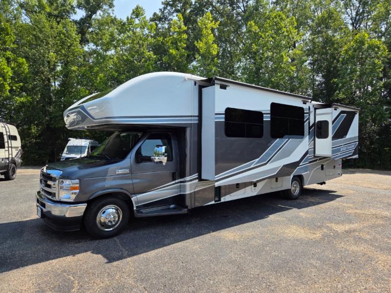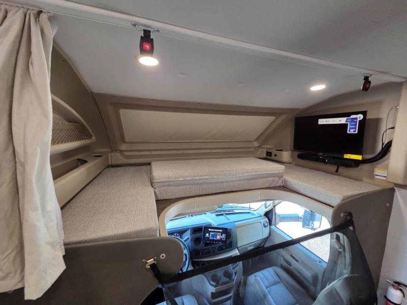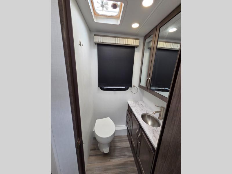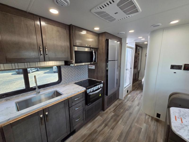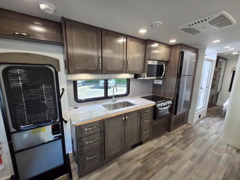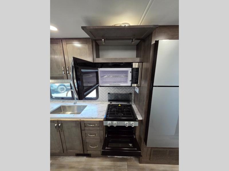 With any Greyhawk Class C gas motorhome by Jayco you will experience smooth sailing thanks to the JRIDE PLUS that comes with Koni shock absorbers, a computer-balanced driveshaft, Hellwig helper springs, and more. The Ford E-450 chassis with a 7.3L V8 325 HP engine will power your excursions, and you'll appreciate the added safety features for your peace of mind. Each model features a Sony infotainment center with Apple CarPlay and Android Auto, backup and side-view cameras, and a tire pressure monitor system the driver is sure to appreciate. Durable construction begins with Stronghold VBL roof, floor and sidewalls, bead-foam insulation, and a one-piece seamless fiberglass front cap. Head inside to find blackout night roller shades, LED-lit pressed countertops, an 84" interior ceiling height, and hardwood cabinet doors and drawers.