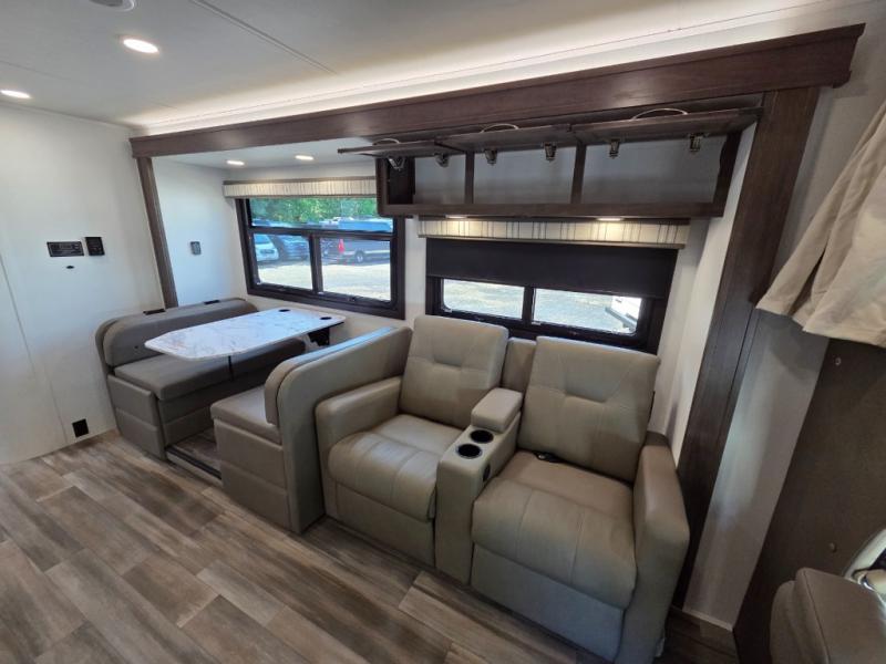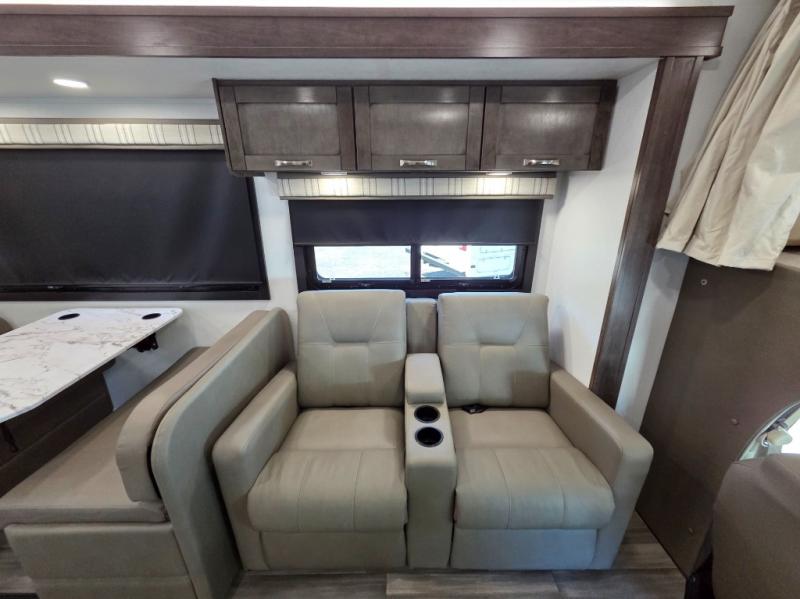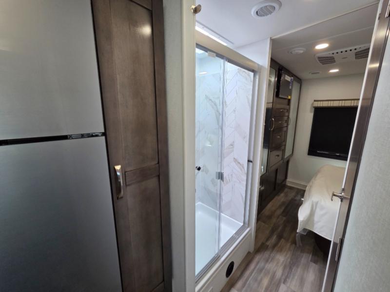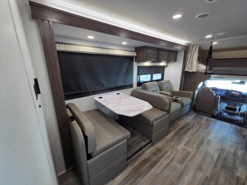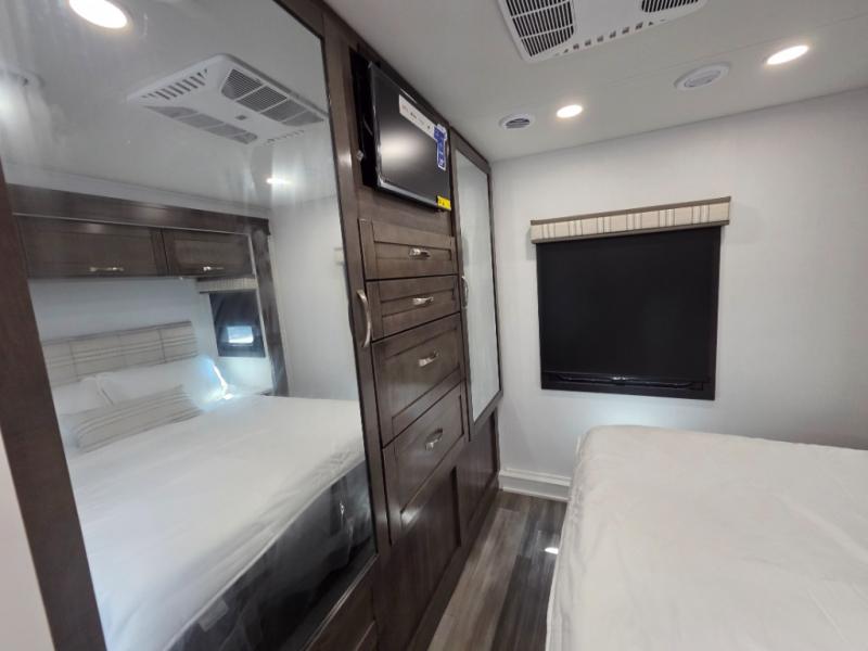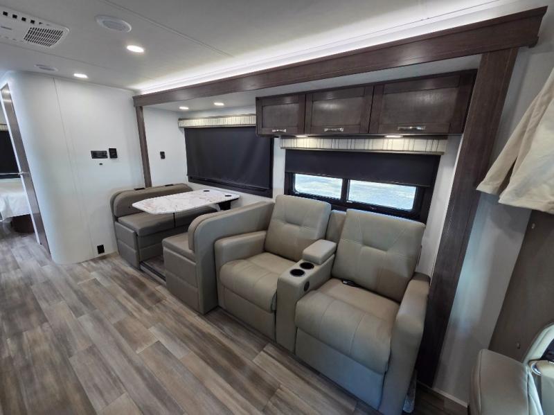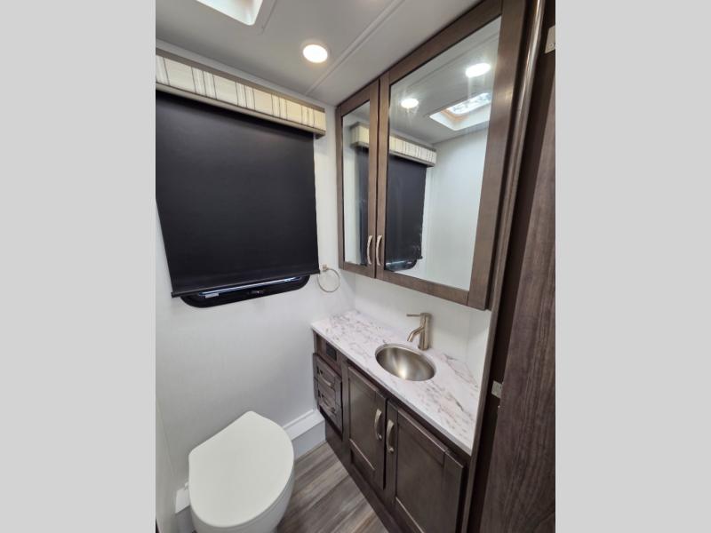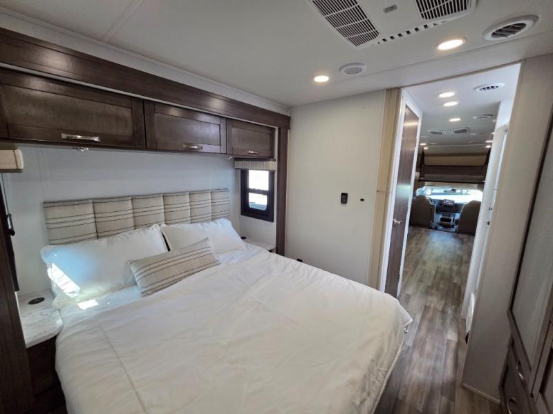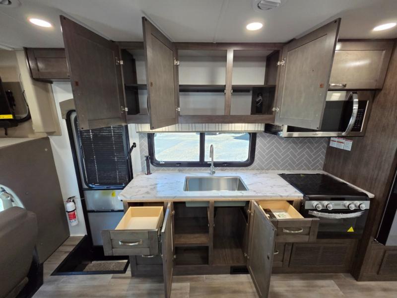 With any Greyhawk Class C gas motorhome by Jayco you will experience smooth sailing thanks to the JRIDE PLUS that comes with Koni shock absorbers, a computer-balanced driveshaft, Hellwig helper springs, and more. The Ford E-450 chassis with a 7.3L V8 325 HP engine will power your excursions, and you'll appreciate the added safety features for your peace of mind. Each model features a Sony infotainment center with Apple CarPlay and Android Auto, backup and side-view cameras, and a tire pressure monitor system the driver is sure to appreciate. Durable construction begins with Stronghold VBL roof, floor and sidewalls, bead-foam insulation, and a one-piece seamless fiberglass front cap. Head inside to find blackout night roller shades, LED-lit pressed countertops, an 84" interior ceiling height, and hardwood cabinet doors and drawers.