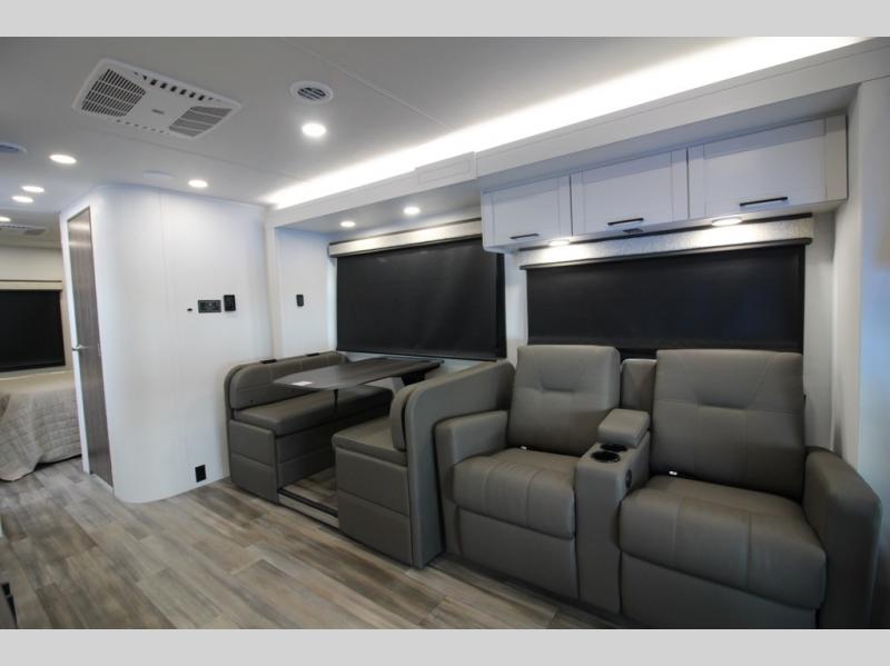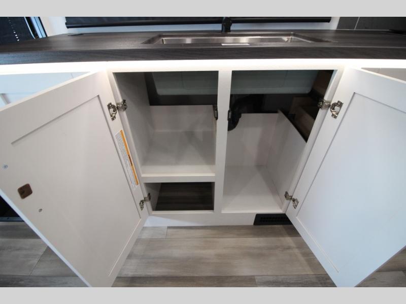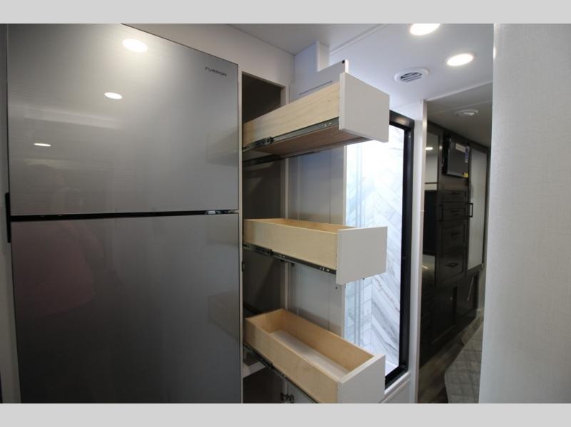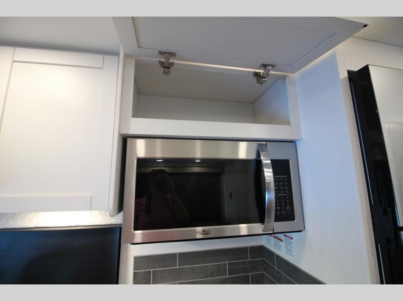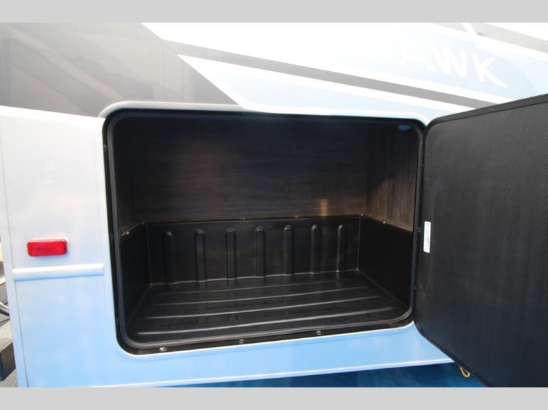 This motorhome includes double slides so you can enjoy more interior space, just like at home! The 42" x 70" booth dinette and 60" tri-fold sofa are in great view of the LED HD Smart TV, and your guests can sleep here, as well as on the cab-over bunk. This Greyhawk kitchen includes a Furrion all-in-one cooktop and oven, a residential-size microwave, and a pantry to store dry goods. You will find a convenient 30" x 36" shower, with the private toilet and sink across the hall so two people can freshen up at once. And don't overlook the rear bedroom with its queen bed slide out, dual bedroom wardrobes, and cabinet!