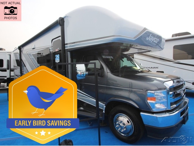 With any Greyhawk Class C gas motorhome by Jayco you will experience smooth sailing thanks to the JRIDE PLUS that comes with Koni shock absorbers, a computer-balanced driveshaft, Hellwig helper springs, and more. The Ford E-450 chassis with a 7.3L V8 325 HP engine will power your excursions, and you'll appreciate the added safety features for your peace of mind. Each model features a Sony infotainment center with Apple CarPlay and Android Auto, backup and side-view cameras, and a tire pressure monitor system the driver is sure to appreciate. Durable construction begins with Stronghold VBL roof, floor and sidewalls, bead-foam insulation, and a one-piece seamless fiberglass front cap. Head inside to find blackout night roller shades, LED-lit pressed countertops, an 84" interior ceiling height, and hardwood cabinet doors and drawers.