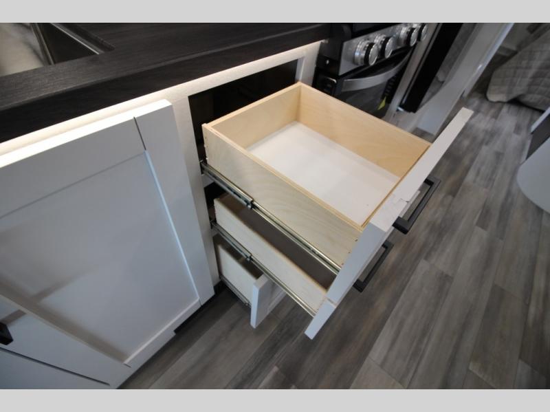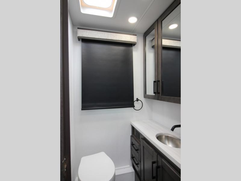 This motorhome includes double slides so you can enjoy more interior space, just like at home! The 42" x 70" booth dinette and 60" tri-fold sofa are in great view of the LED HD Smart TV, and your guests can sleep here, as well as on the cab-over bunk. This Greyhawk kitchen includes a Furrion all-in-one cooktop and oven, a residential-size microwave, and a pantry to store dry goods. You will find a convenient 30" x 36" shower, with the private toilet and sink across the hall so two people can freshen up at once. And don't overlook the rear bedroom with its queen bed slide out, dual bedroom wardrobes, and cabinet!