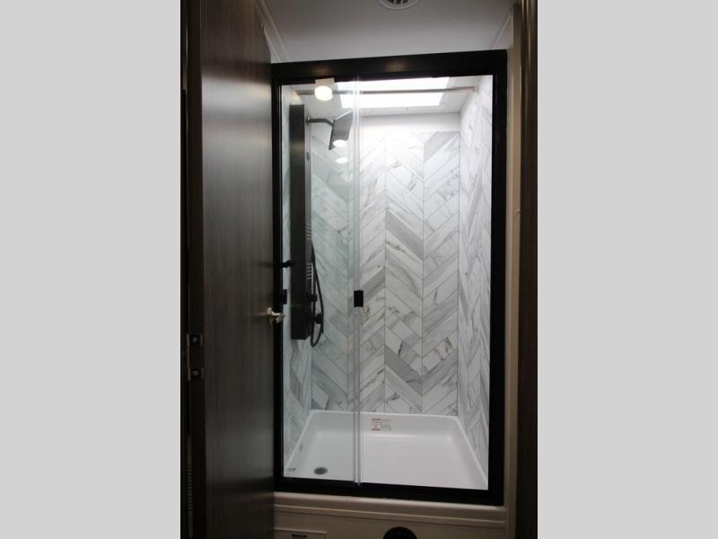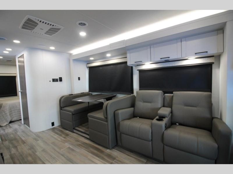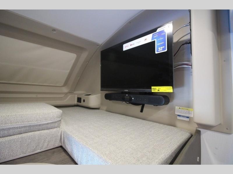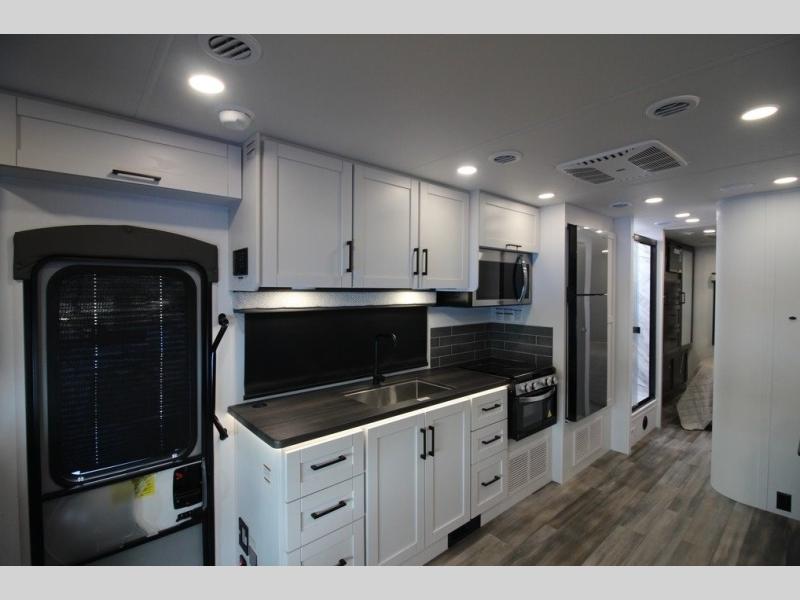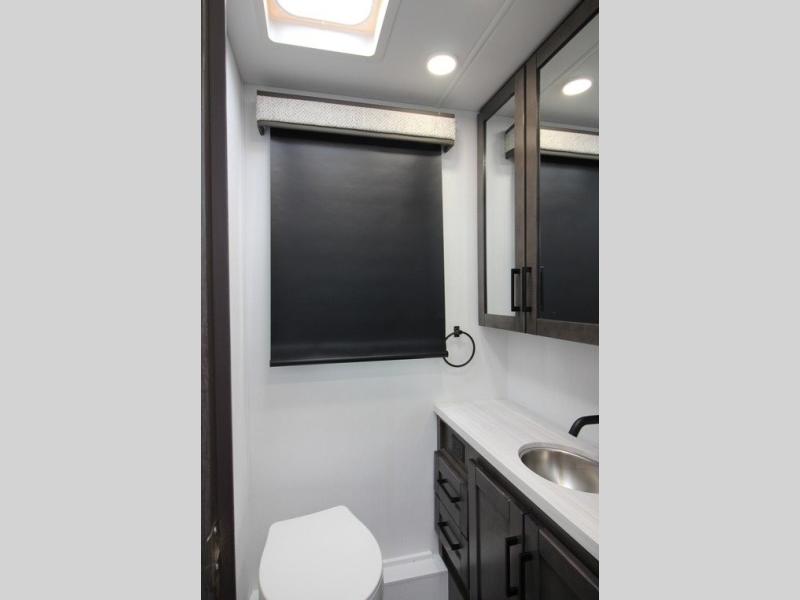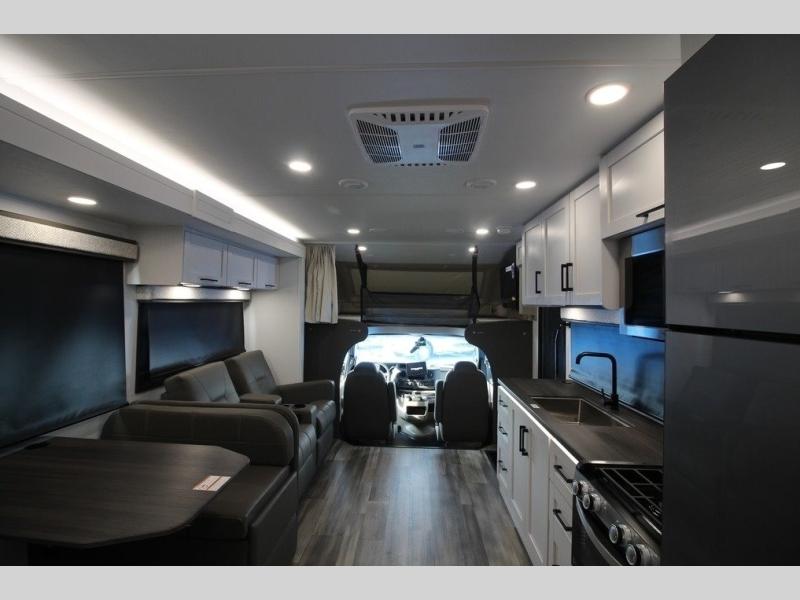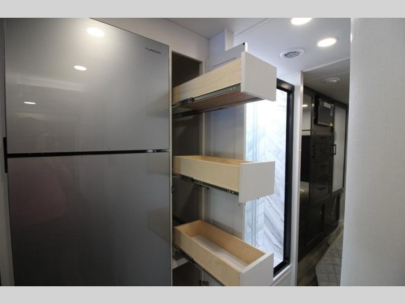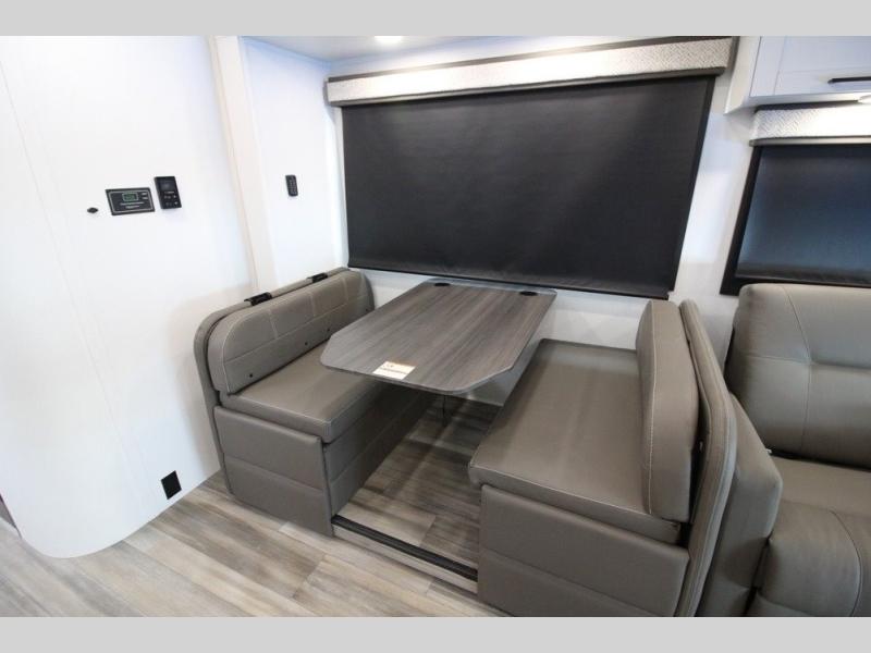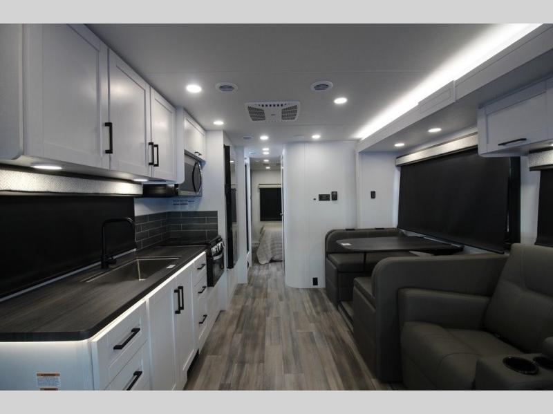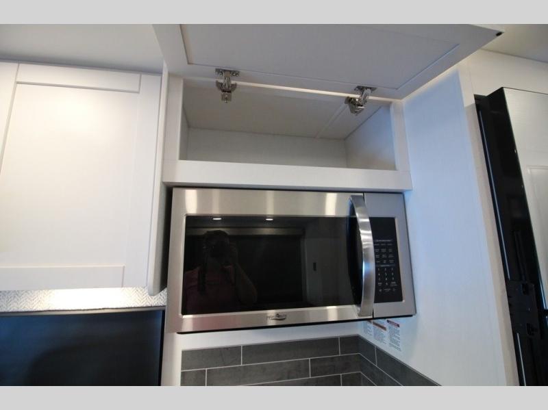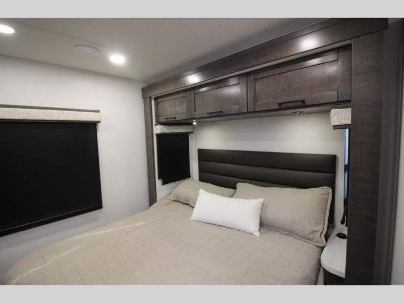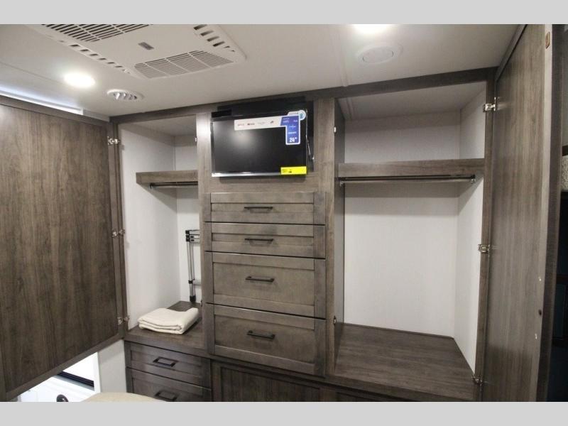 This motorhome includes double slides so you can enjoy more interior space, just like at home! The 42" x 70" booth dinette and 60" tri-fold sofa are in great view of the LED HD Smart TV, and your guests can sleep here, as well as on the cab-over bunk. This Greyhawk kitchen includes a Furrion all-in-one cooktop and oven, a residential-size microwave, and a pantry to store dry goods. You will find a convenient 30" x 36" shower, with the private toilet and sink across the hall so two people can freshen up at once. And don't overlook the rear bedroom with its queen bed slide out, dual bedroom wardrobes, and cabinet!