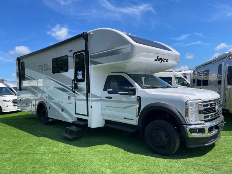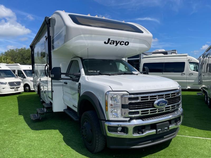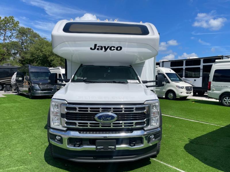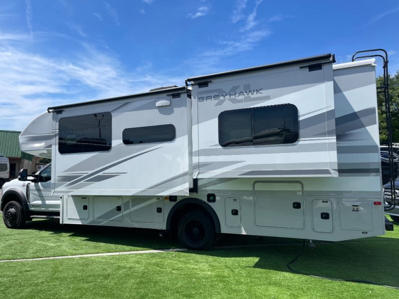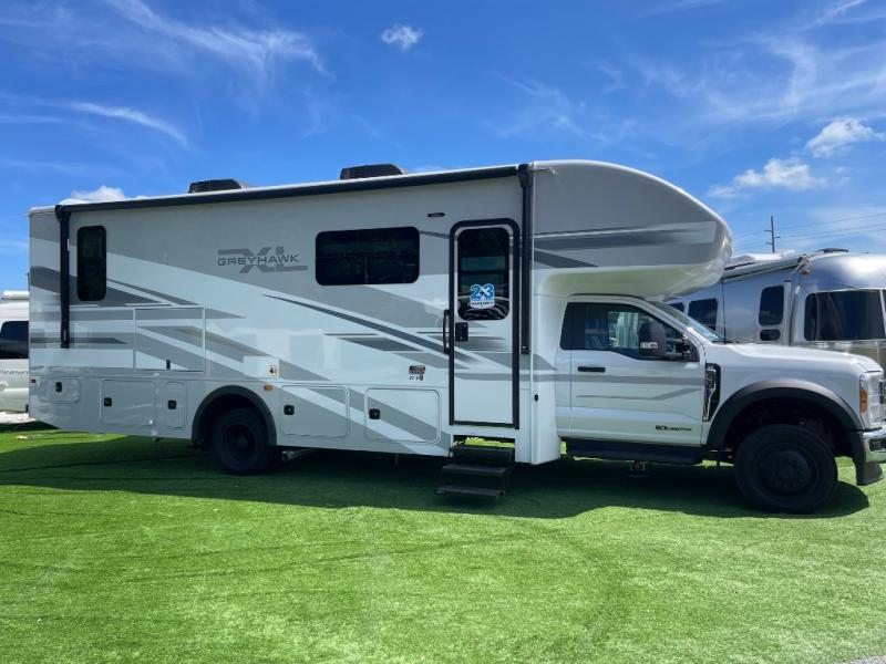 the Jayco Greyhawk XL 32U Super C features a king bed, full kitchen, bunk over cab, and outdoor entertainment, all built on a rugged Ford F-550 4x4 diesel chassis. Call Today! 352.787.7744