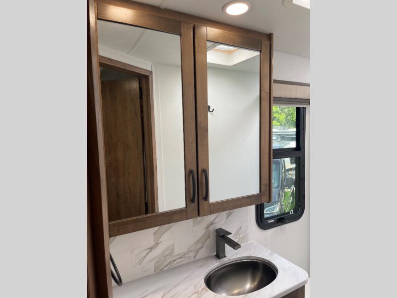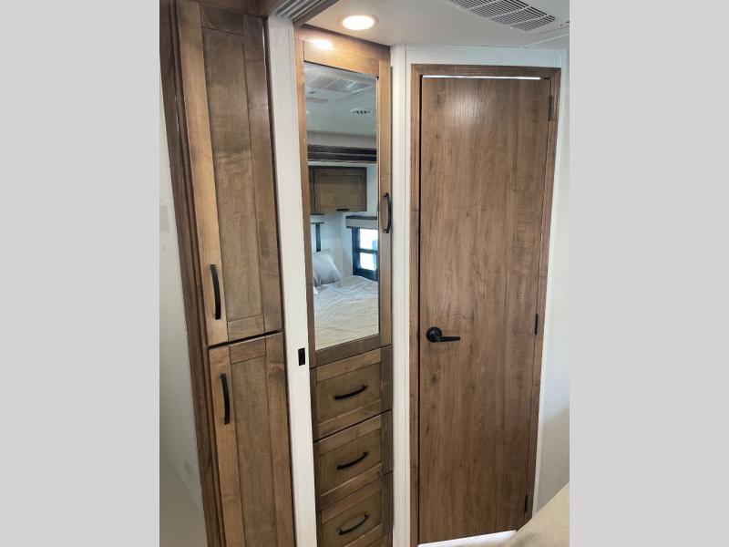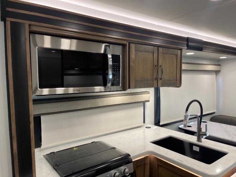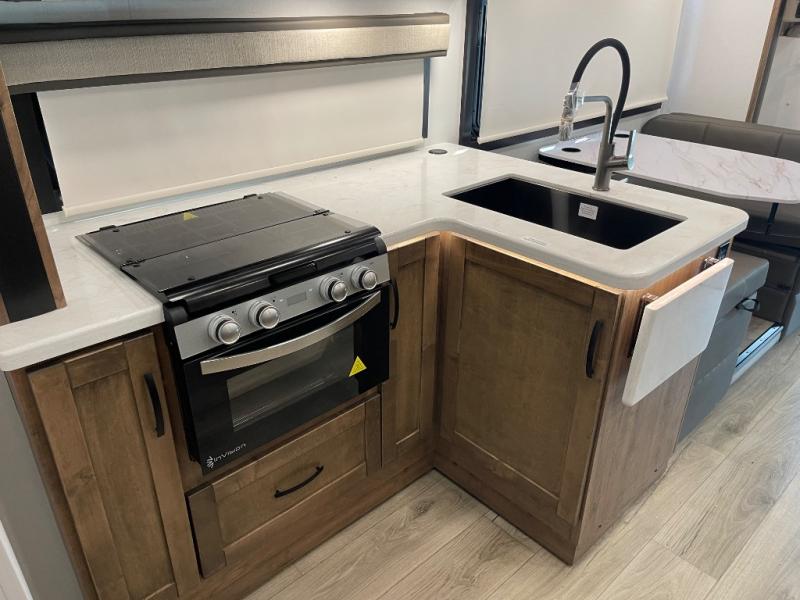 Stylish Interiors – Solid surface countertops, decorative backsplash, blackout roller shades, and hardwood cabinetry offer a residential touch.
