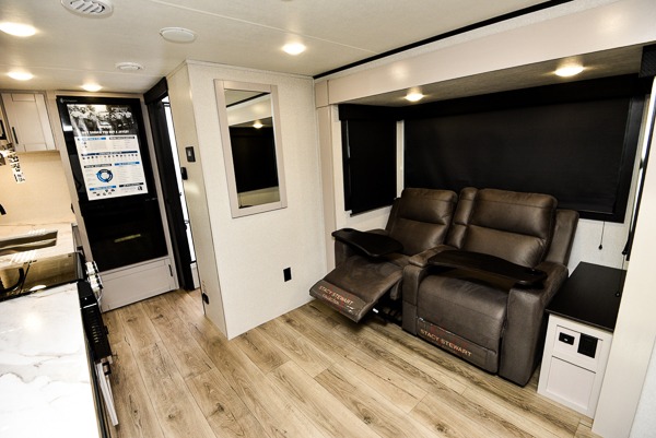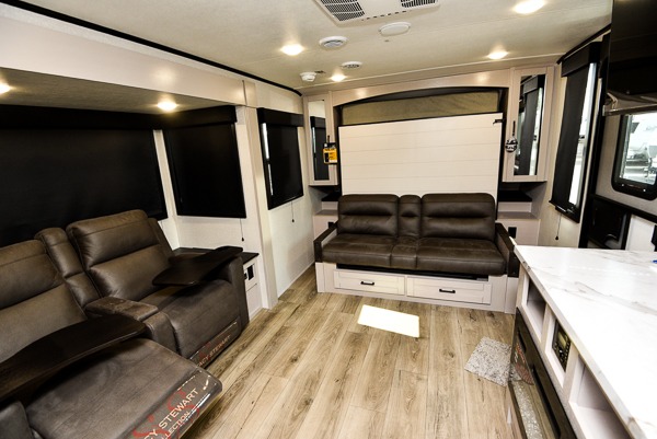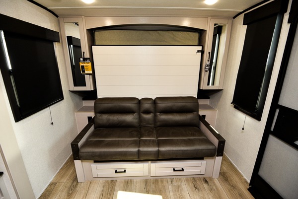 This travel trailer offers a lot of possibilities! During the day, relax in the spacious front living area with a jackknife sofa plus a pair of theater seats, both positioned for a great view of the entertainment center. A fully equipped kitchen with stainless steel double bowl sink, microwave, and three-burner range makes meals easy, and the theater seats have swing-out trays for you to dine. At night, pull down the 60" x 75" Murphy bed for a great night's sleep! wardrobes on either side of the bed provide plenty of storage for your clothing. The rear corner bath is convenient and private, and offers a linen closet plus a medicine cabinet for additional storage capability. Outside you will be sheltered from the sun beneath the 15' awning, and there is an LP Quick Connect if you want to hook up your personal grill.