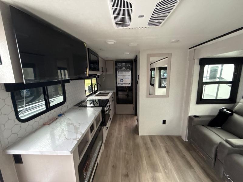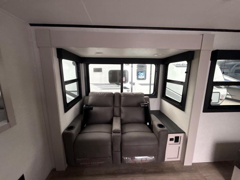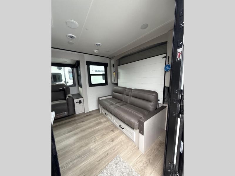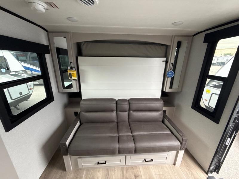 This travel trailer offers a lot of possibilities! During the day, relax in the spacious front living area with a jackknife sofa plus a pair of theater seats, both positioned for a great view of the entertainment center. A fully equipped kitchen with stainless steel double bowl sink, microwave, and three-burner range makes meals easy, and the theater seats have swing-out trays for you to dine. At night, pull down the 60" x 75" Murphy bed for a great night's sleep! wardrobes on either side of the bed provide plenty of storage for your clothing. The rear corner bath is convenient and private, and offers a linen closet plus a medicine cabinet for additional storage capability. Outside you will be sheltered from the sun beneath the 15' awning, and there is an LP Quick Connect if you want to hook up your personal grill.