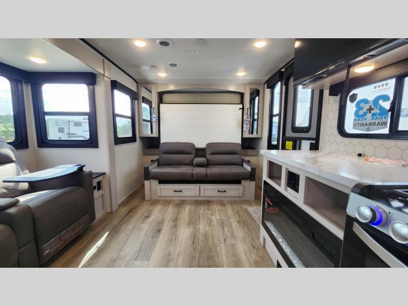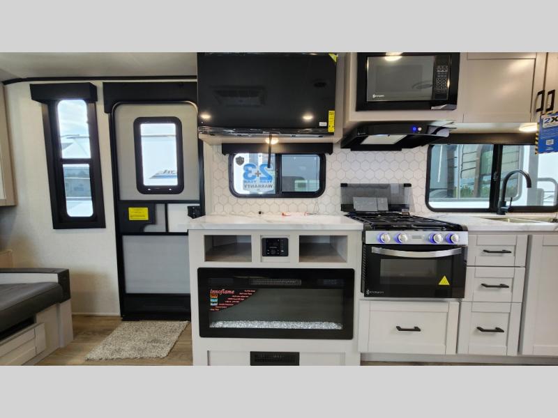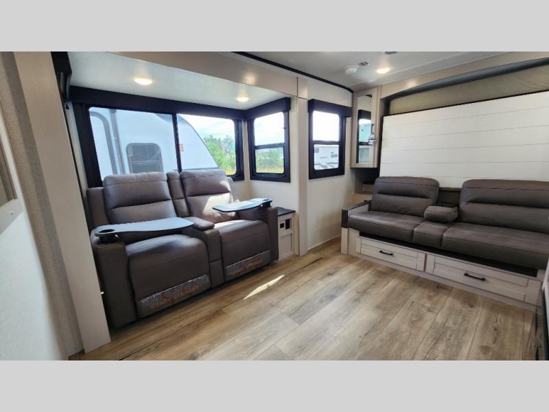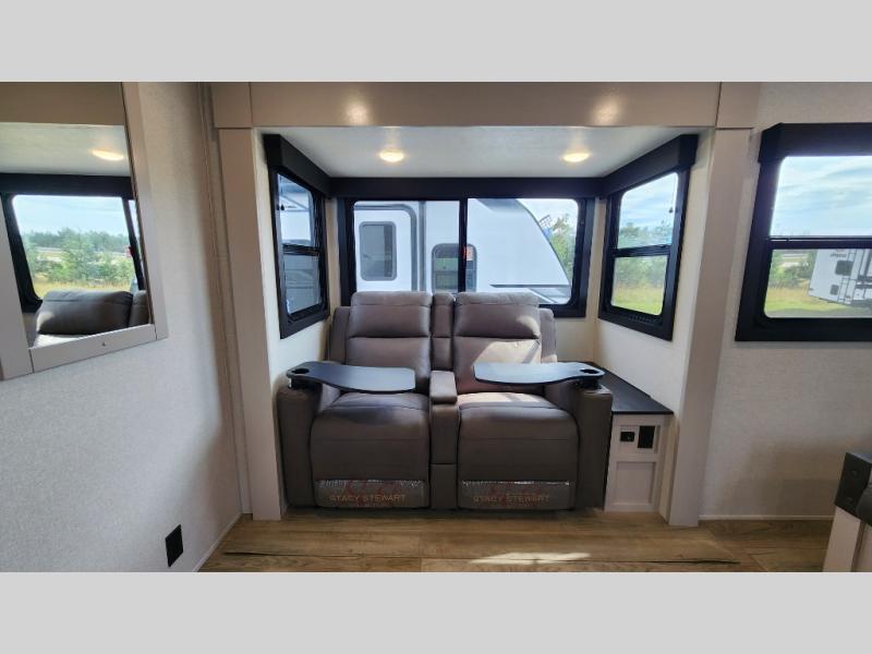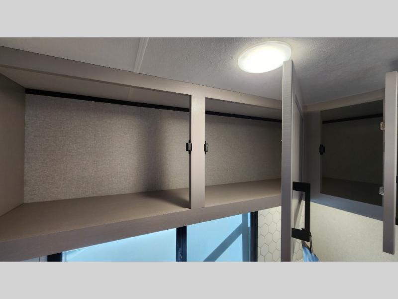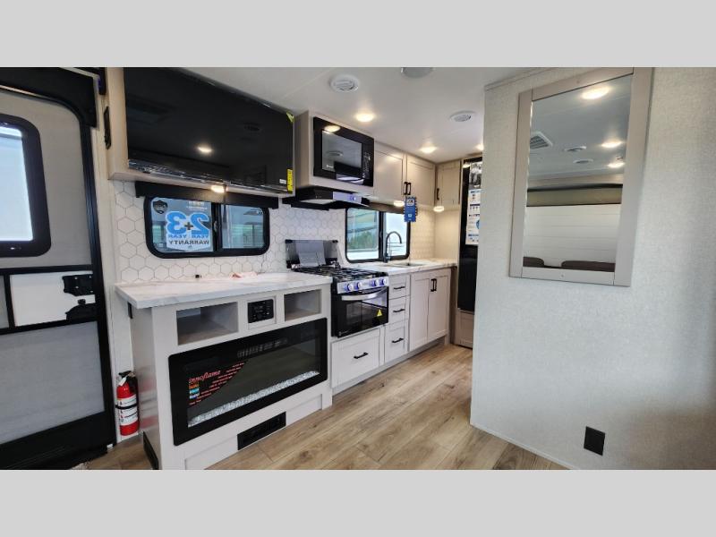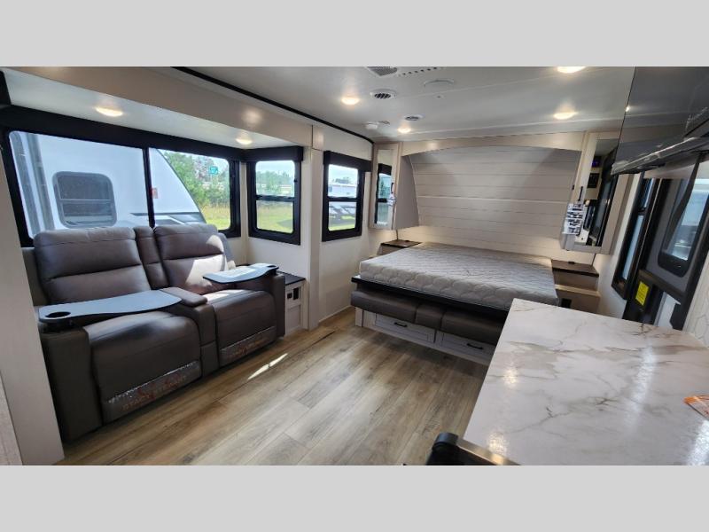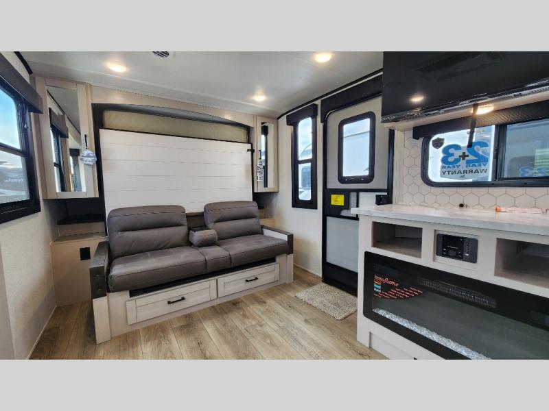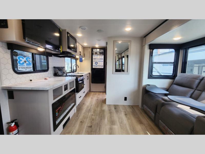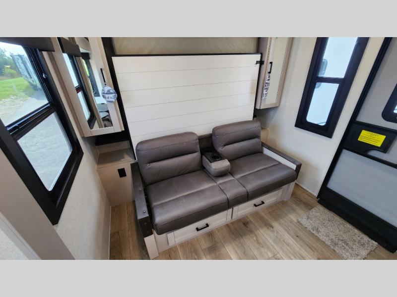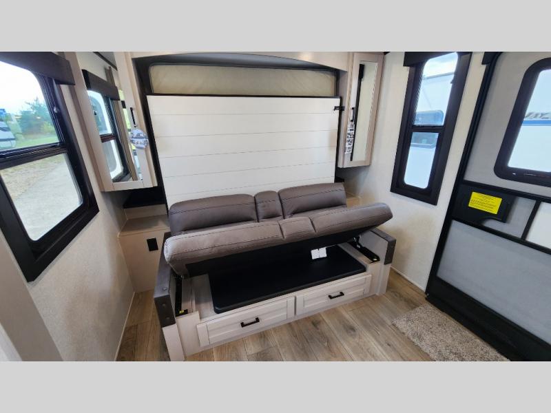 This travel trailer offers a lot of possibilities! During the day, relax in the spacious front living area with a jackknife sofa plus a pair of theater seats, both positioned for a great view of the entertainment center. A fully equipped kitchen with stainless steel double bowl sink, microwave, and three-burner range makes meals easy, and the theater seats have swing-out trays for you to dine. At night, pull down the 60" x 75" Murphy bed for a great night's sleep! wardrobes on either side of the bed provide plenty of storage for your clothing. The rear corner bath is convenient and private, and offers a linen closet plus a medicine cabinet for additional storage capability. Outside you will be sheltered from the sun beneath the 15' awning, and there is an LP Quick Connect if you want to hook up your personal grill.