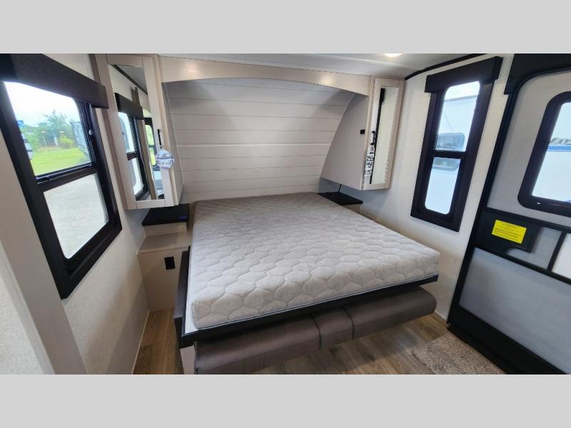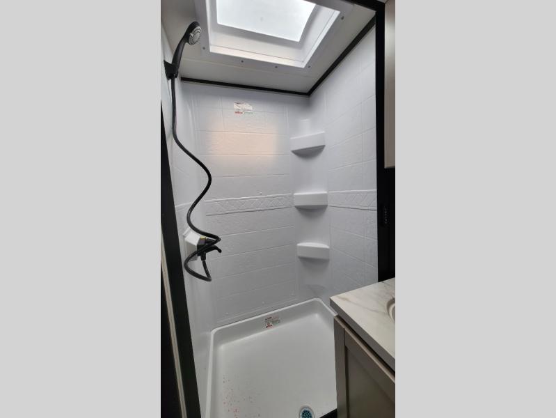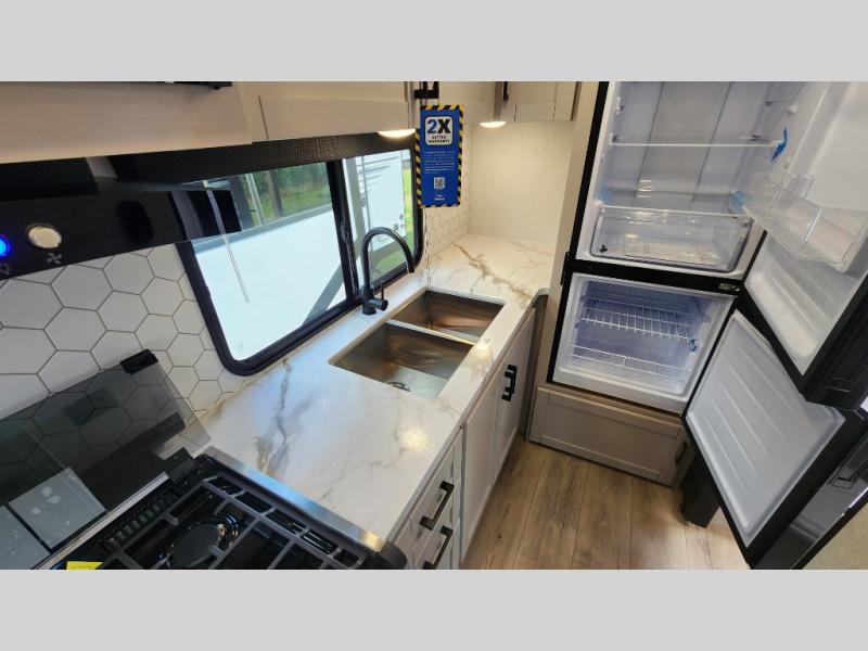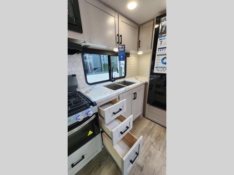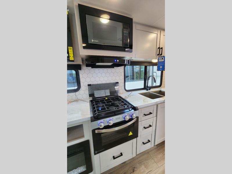 With any Jay Feather travel trailer by Jayco, you will enjoy lightweight towing, convenient exterior amenities, and at-home comforts inside! The Overlander 1 Solar Package included within the Jay Sport Package comes with a 200W solar panel and a 30-amp digital controller so you can enjoy some off-grid camping. There is also a modern graphics package with a dual-colored sidewall, LCI Solid Step fold-down aluminum tread steps on the main entry door, and Climate Shield 0 -100° F tested weather insulation package that will allow you to camp in all sorts of climates. The Customer Value Package will make time outdoors easier than ever with a power tongue jack and a Rock Solid stabilizer system, plus American-made nitro-filled Goodyear tires with self-adjusting electric brakes. More exterior features include a Keyed-Alike locking system, marine grade exterior speakers, a Magnum Truss roof system, and the list goes on! And we haven't even touched on the interior comforts, like the residential style seamless countertops and vinyl flooring throughout, decorative backsplash, handcrafted hardwood door/drawer fronts, and multiple USB charging ports to keep you going!
