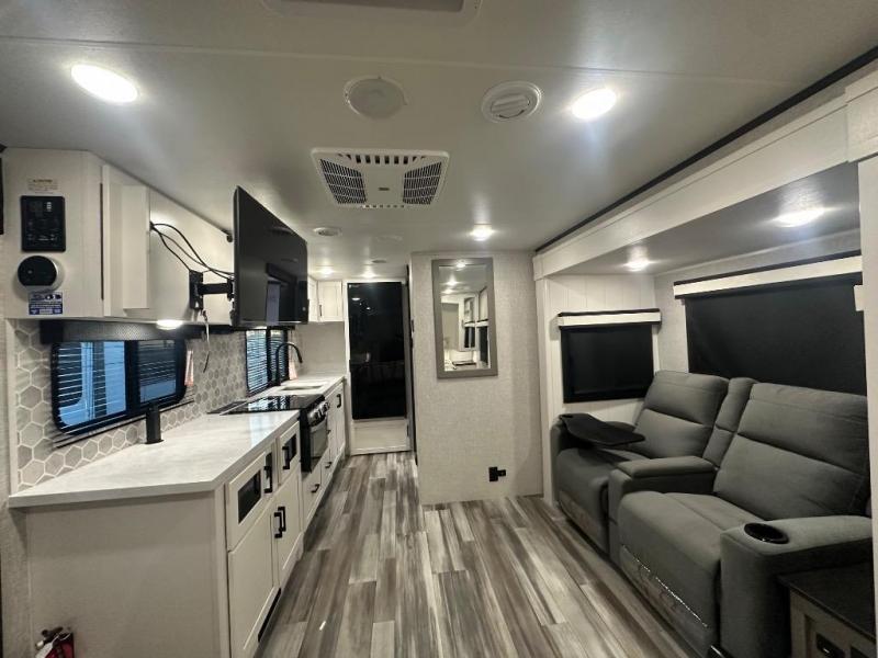 This travel trailer offers a lot of possibilities! During the day, relax in the spacious front living area with a jackknife sofa plus a pair of theater seats, both positioned for a great view of the entertainment center. A fully equipped kitchen with stainless steel double bowl sink, microwave, and three-burner range makes meals easy, and the theater seats have swing-out trays for you to dine. At night, pull down the 60" x 75" Murphy bed for a great night's sleep! wardrobes on either side of the bed provide plenty of storage for your clothing. The rear corner bath is convenient and private, and offers a linen closet plus a medicine cabinet for additional storage capability. Outside you will be sheltered from the sun beneath the 15' awning, and there is an LP Quick Connect if you want to hook up your personal grill.