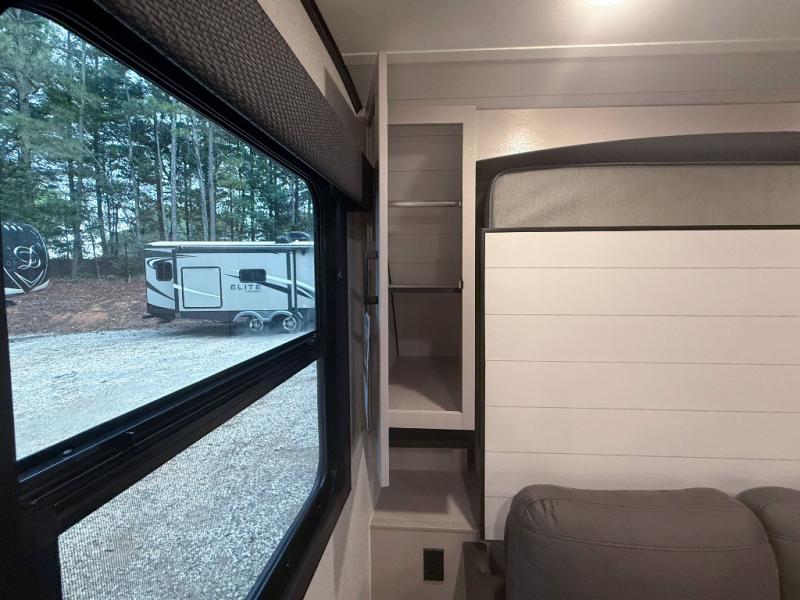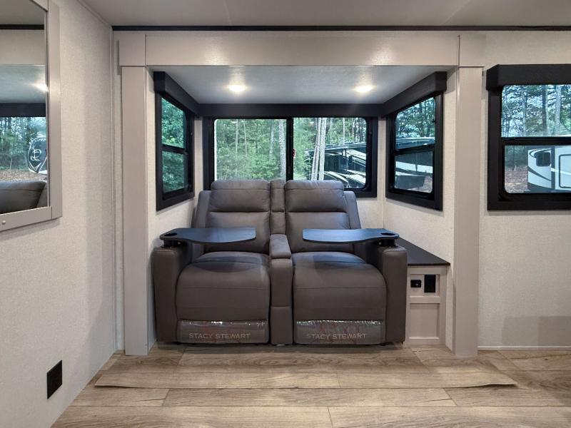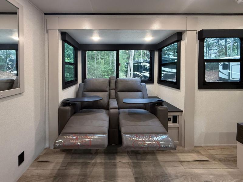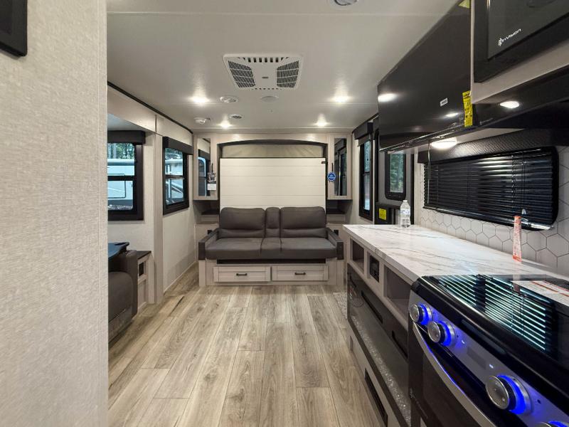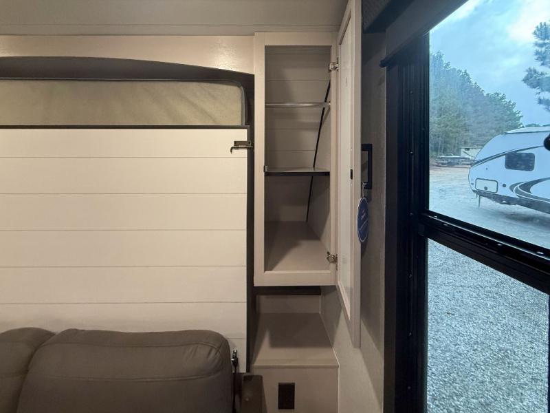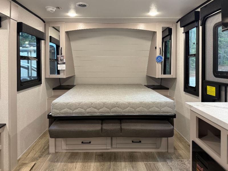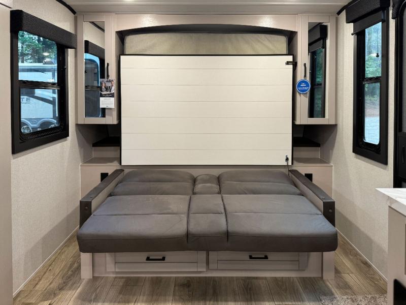 This travel trailer offers a lot of possibilities! During the day, relax in the spacious front living area with a jackknife sofa plus a pair of theater seats, both positioned for a great view of the entertainment center. A fully equipped kitchen with stainless steel double bowl sink, microwave, and three-burner range makes meals easy, and the theater seats have swing-out trays for you to dine. At night, pull down the 60" x 75" Murphy bed for a great night's sleep! wardrobes on either side of the bed provide plenty of storage for your clothing. The rear corner bath is convenient and private, and offers a linen closet plus a medicine cabinet for additional storage capability. Outside you will be sheltered from the sun beneath the 15' awning, and there is an LP Quick Connect if you want to hook up your personal grill.