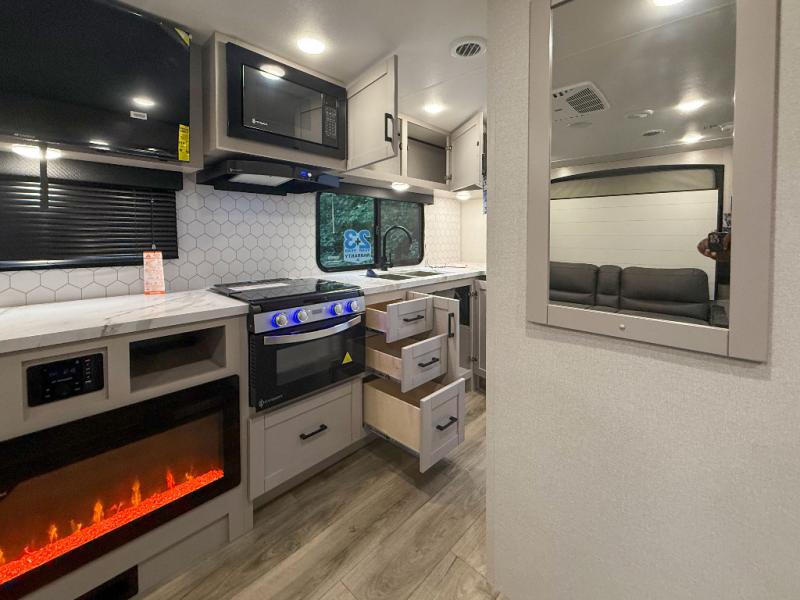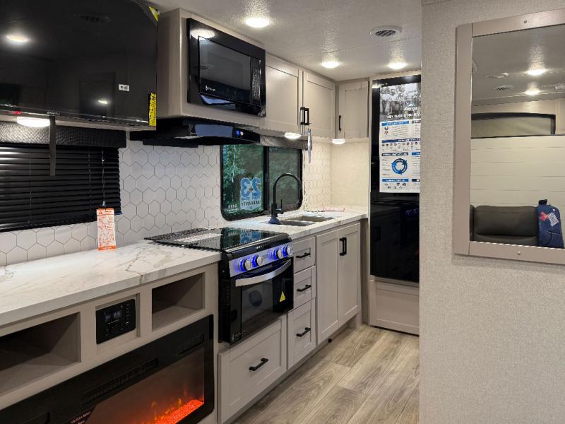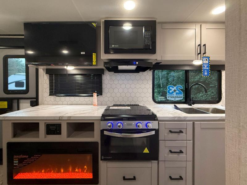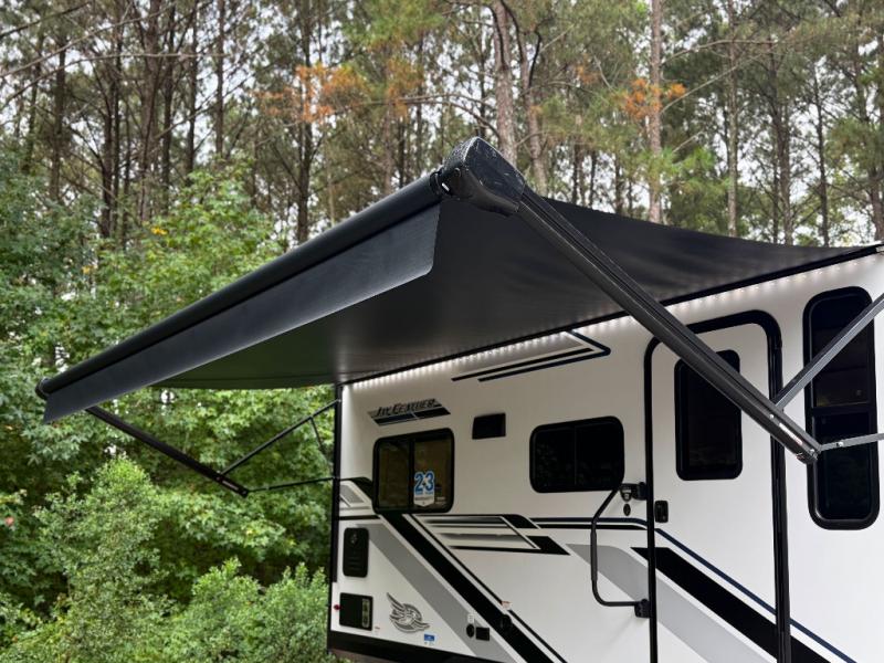 With any Jay Feather travel trailer by Jayco, you will enjoy lightweight towing, convenient exterior amenities, and at-home comforts inside! The Overlander 1 Solar Package included within the Jay Sport Package comes with a 200W solar panel and a 30-amp digital controller so you can enjoy some off-grid camping. There is also a modern graphics package with a dual-colored sidewall, LCI Solid Step fold-down aluminum tread steps on the main entry door, and Climate Shield 0 -100° F tested weather insulation package that will allow you to camp in all sorts of climates. The Customer Value Package will make time outdoors easier than ever with a power tongue jack and a Rock Solid stabilizer system, plus American-made nitro-filled Goodyear tires with self-adjusting electric brakes. More exterior features include a Keyed-Alike locking system, marine grade exterior speakers, a Magnum Truss roof system, and the list goes on! And we haven't even touched on the interior comforts, like the residential style seamless countertops and vinyl flooring throughout, decorative backsplash, handcrafted hardwood door/drawer fronts, and multiple USB charging ports to keep you going!