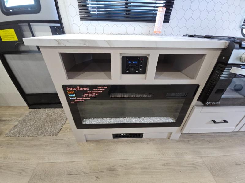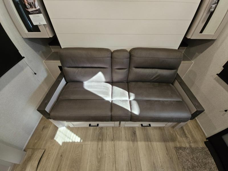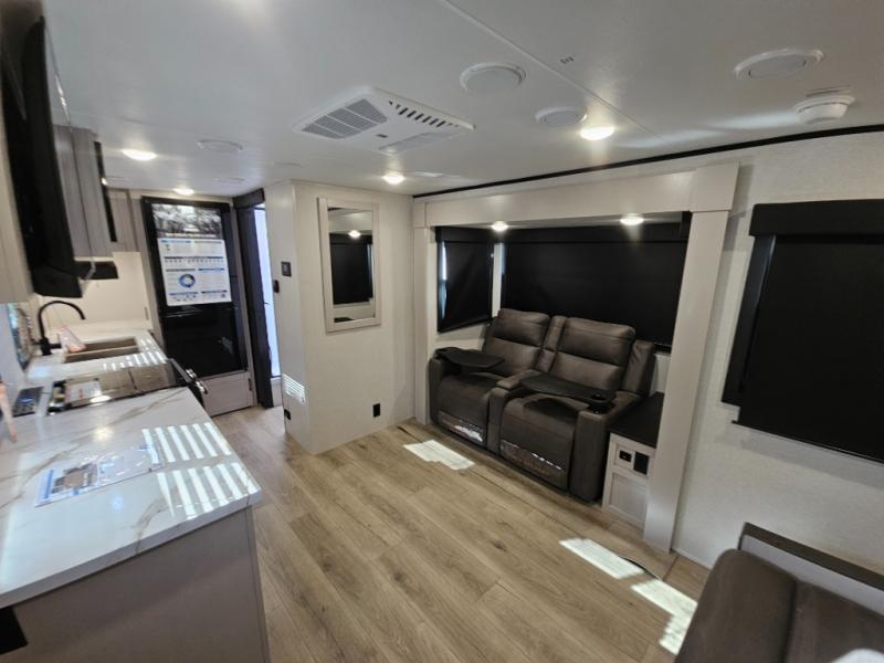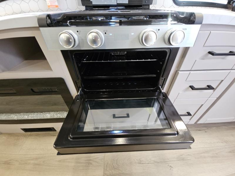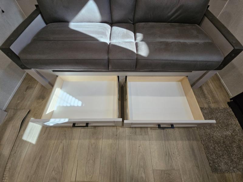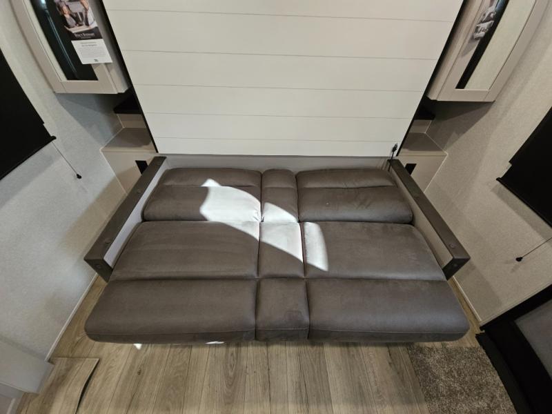 This travel trailer offers a lot of possibilities! During the day, relax in the spacious front living area with a jackknife sofa plus a pair of theater seats, both positioned for a great view of the entertainment center. A fully equipped kitchen with stainless steel double bowl sink, microwave, and three-burner range makes meals easy, and the theater seats have swing-out trays for you to dine. At night, pull down the 60" x 75" Murphy bed for a great night's sleep! wardrobes on either side of the bed provide plenty of storage for your clothing. The rear corner bath is convenient and private, and offers a linen closet plus a medicine cabinet for additional storage capability. Outside you will be sheltered from the sun beneath the 15' awning, and there is an LP Quick Connect if you want to hook up your personal grill.