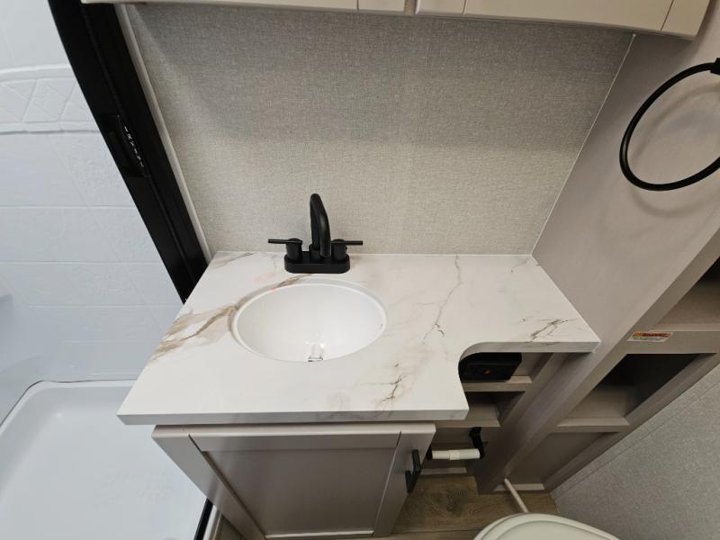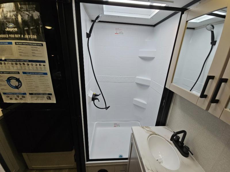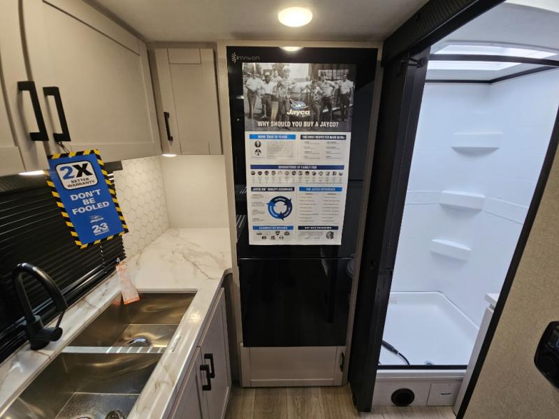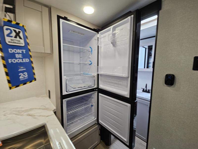 With any Jay Feather travel trailer by Jayco, you will enjoy lightweight towing, convenient exterior amenities, and at-home comforts inside! The Overlander 1 Solar Package included within the Jay Sport Package comes with a 200W solar panel and a 30-amp digital controller so you can enjoy some off-grid camping. There is also a modern graphics package with a dual-colored sidewall, LCI Solid Step fold-down aluminum tread steps on the main entry door, and Climate Shield 0 -100° F tested weather insulation package that will allow you to camp in all sorts of climates. The Customer Value Package will make time outdoors easier than ever with a power tongue jack and a Rock Solid stabilizer system, plus American-made nitro-filled Goodyear tires with self-adjusting electric brakes. More exterior features include a Keyed-Alike locking system, marine grade exterior speakers, a Magnum Truss roof system, and the list goes on! And we haven't even touched on the interior comforts, like the residential style seamless countertops and vinyl flooring throughout, decorative backsplash, handcrafted hardwood door/drawer fronts, and multiple USB charging ports to keep you going!