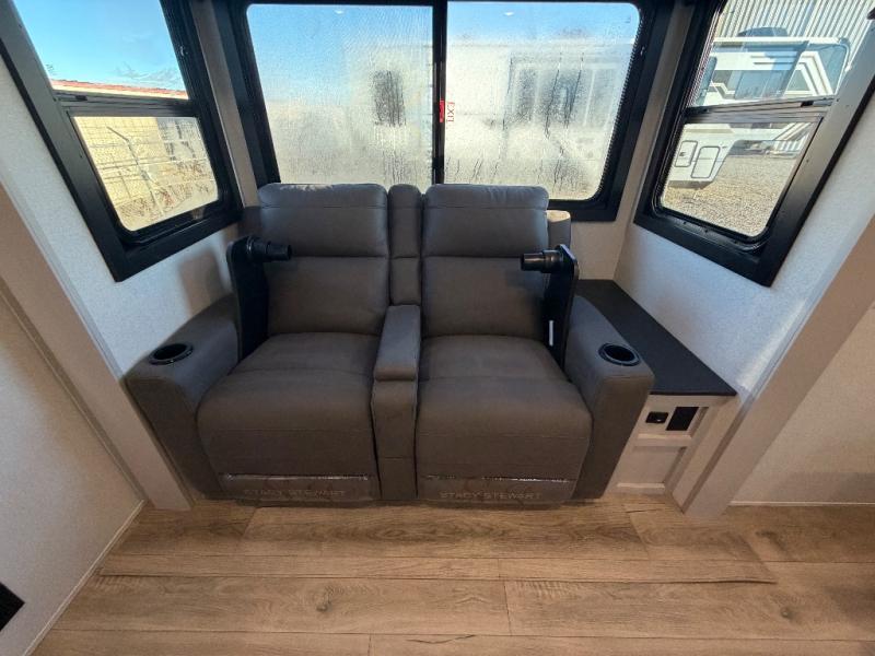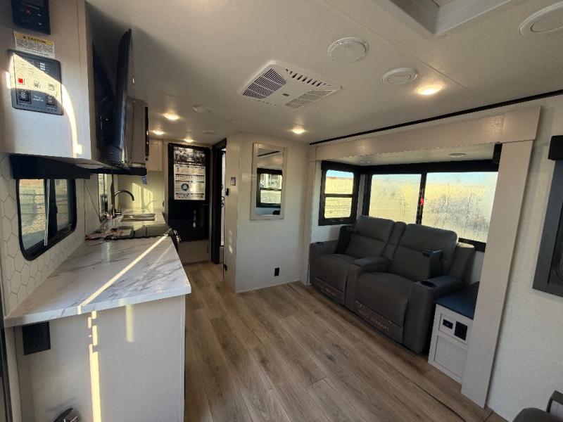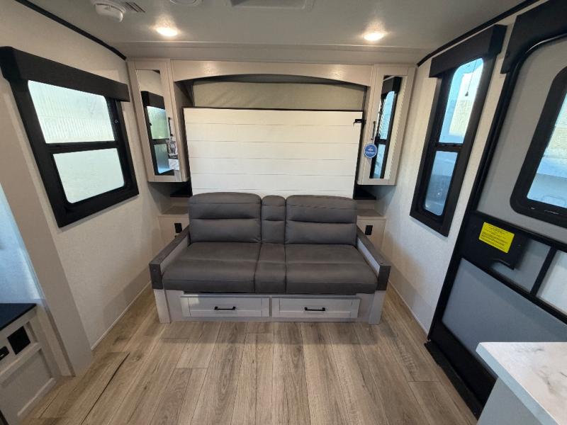 This travel trailer offers a lot of possibilities! During the day, relax in the spacious front living area with a jackknife sofa plus a pair of theater seats, both positioned for a great view of the entertainment center. A fully equipped kitchen with stainless steel sink, microwave, and three-burner range makes meals easy, and the theater seats have swing-out trays for you to dine. At night, pull down the Murphy bed for a great night's sleep! wardrobes on either side of the bed provide plenty of storage for your clothing. The rear corner bath is convenient and private,and offers a linen closet plus a medicine cabinet for additional storage capability. Outside you will be sheltered from the sun beneath the 15' awning, and there is an LP Quick Connect if you want to hook up your personal grill.