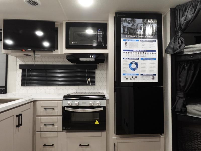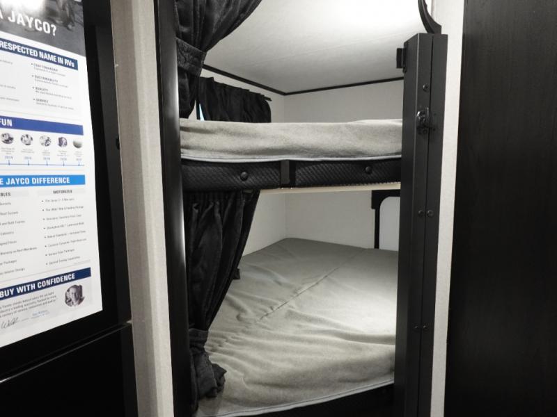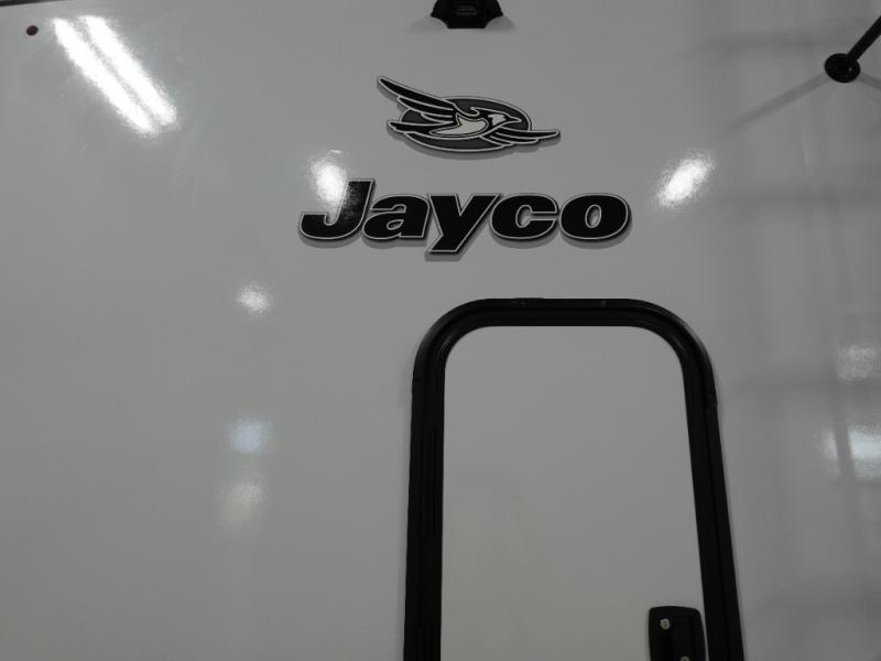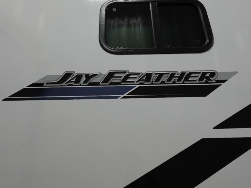 With any Jay Feather travel trailer by Jayco, you will enjoy lightweight towing, convenient exterior amenities, and at-home comforts inside! The Overlander 1 Solar Package included within the Jay Sport Package comes with a 200W solar panel and a 30-amp digital controller so you can enjoy some off-grid camping. There is also a modern graphics package with a dual-colored sidewall, LCI Solid Step fold-down aluminum tread steps on the main entry door, and Climate Shield 0 -100° F tested weather insulation package that will allow you to camp in all sorts of climates. The Customer Value Package will make time outdoors easier than ever with a power tongue jack and a Rock Solid stabilizer system, plus American-made nitro-filled Goodyear tires with self-adjusting electric brakes. More exterior features include a Keyed-Alike locking system, marine grade exterior speakers, a Magnum Truss roof system, and the list goes on! And we haven't even touched on the interior comforts, like the residential style seamless countertops and vinyl flooring throughout, decorative backsplash, handcrafted hardwood door/drawer fronts, and multiple USB charging ports to keep you going!