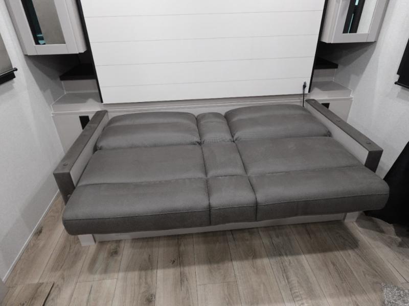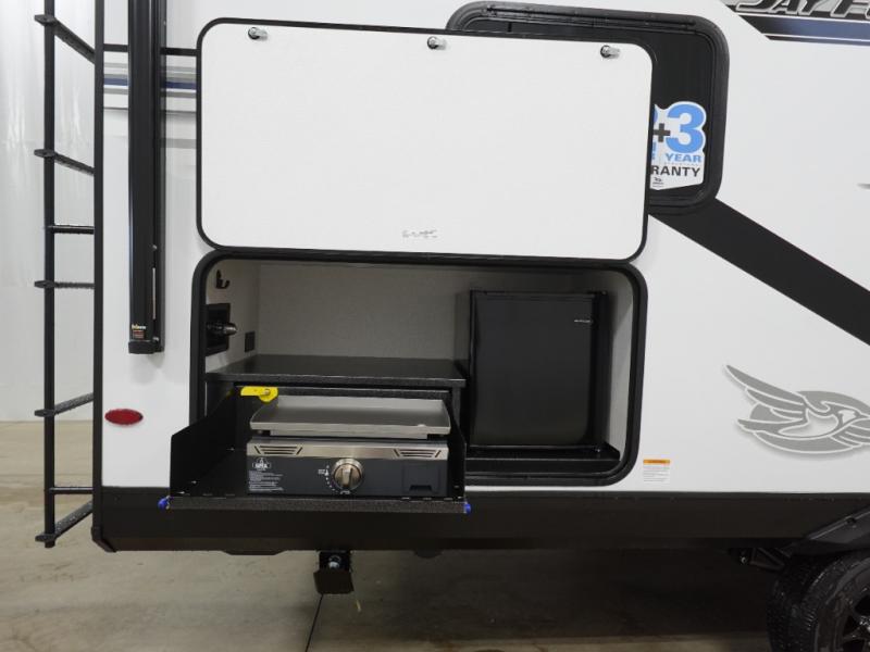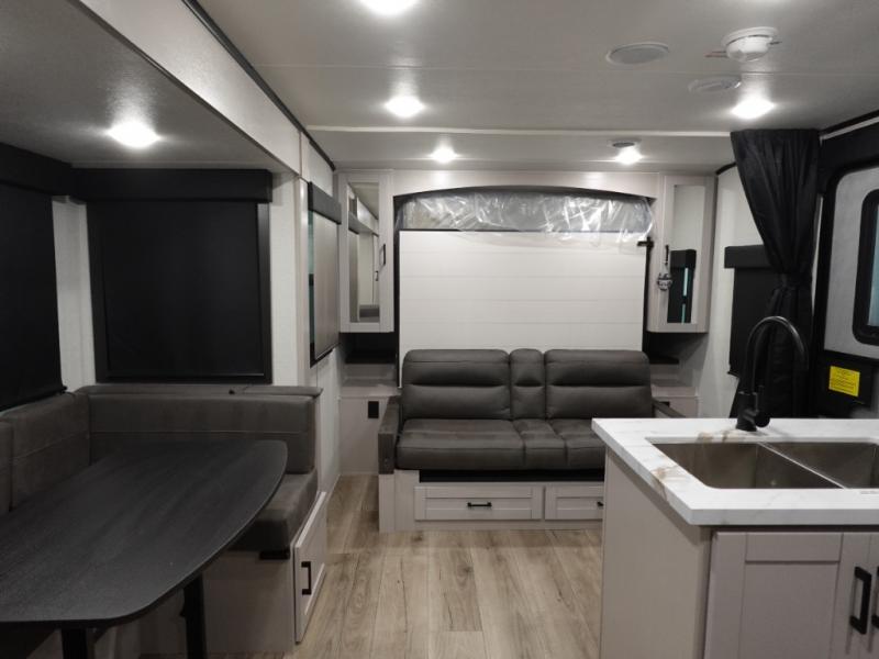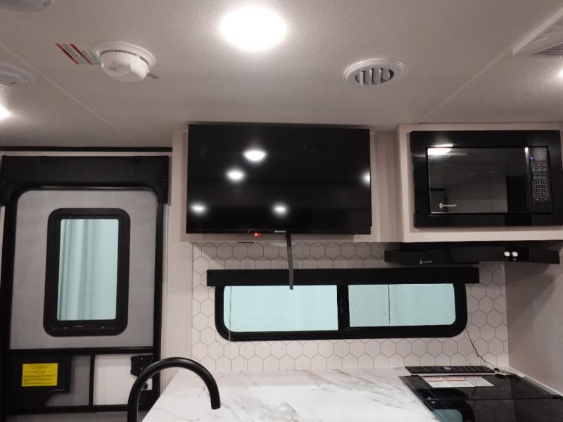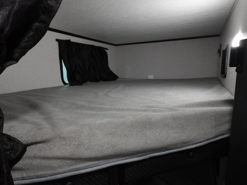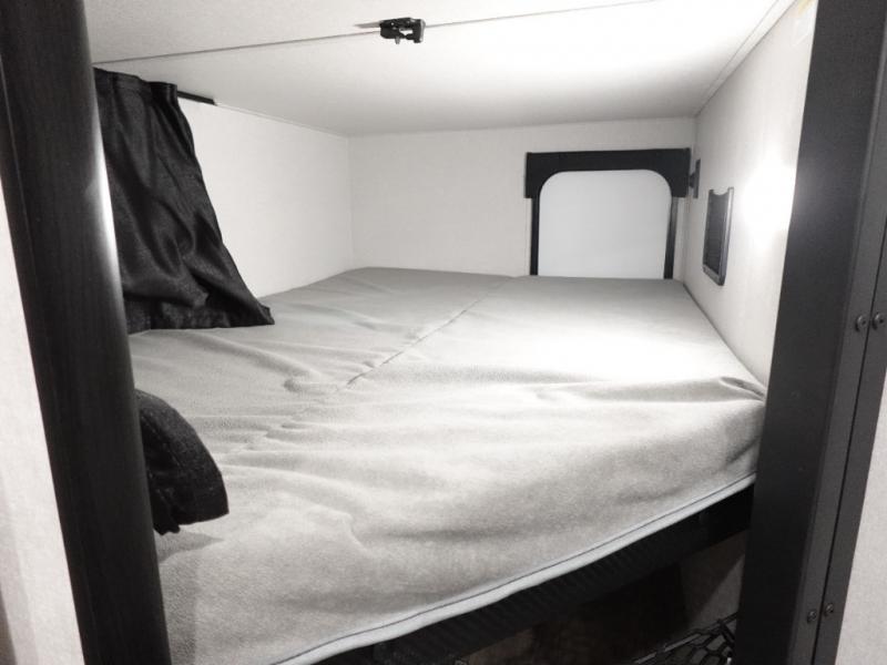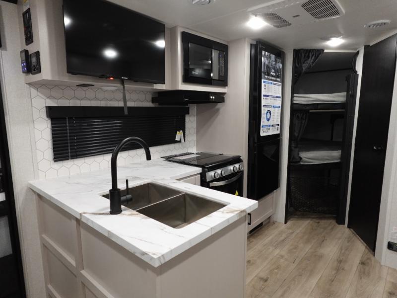 You'll be surprised how easy it will be to camp in this travel trailer for seven! The double-size bunks include flip-up storage and an exterior cargo door so you can easily pack in gear, plus there is front exterior storage as well. A Murphy bed up front means you can enjoy comfortable sleeping space at night, and cozy seating space during the day on the jack knife sofa. You'll also find a U-shaped dinette slide where you can dine together, and the pantry within the slide can hold snacks for everyone! This model includes an L-shaped kitchen counter, a microwave oven and three burner range to cook meals, plus an 11 cu. ft. 12V refrigerator for perishables! You may just find yourselves outdoor most of the time since there is a 19' power awning with LED lights and an outside kitchen!
