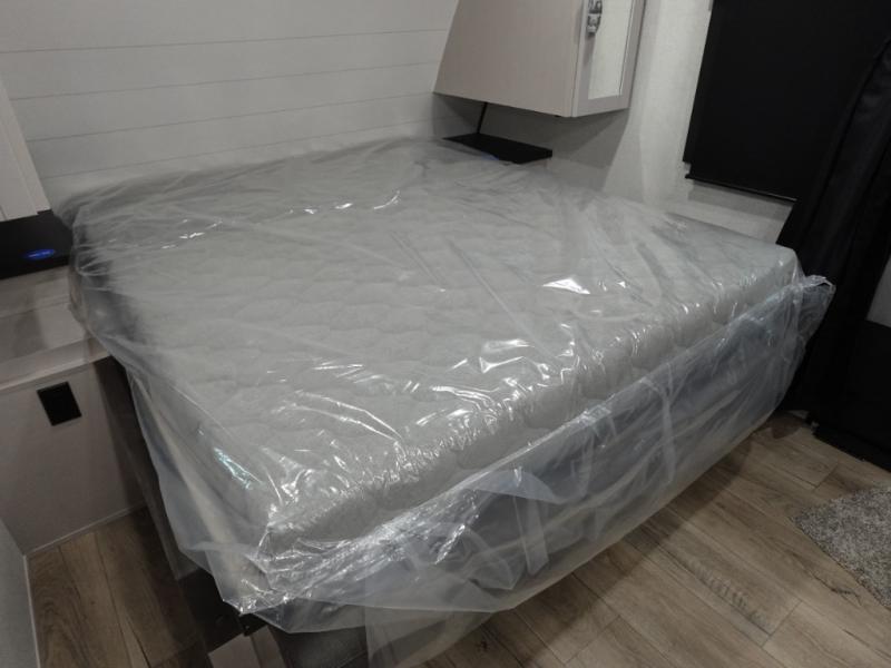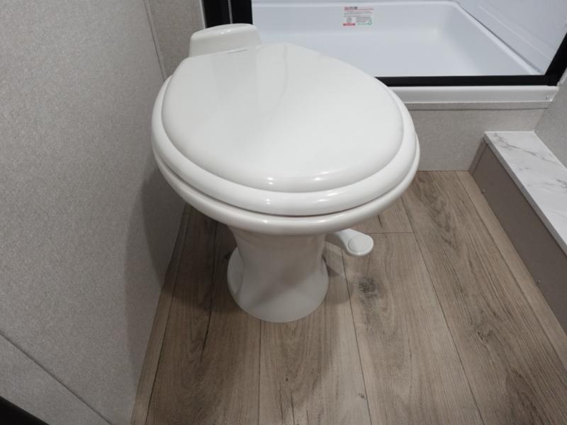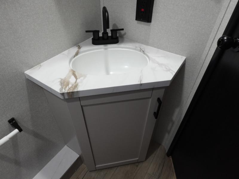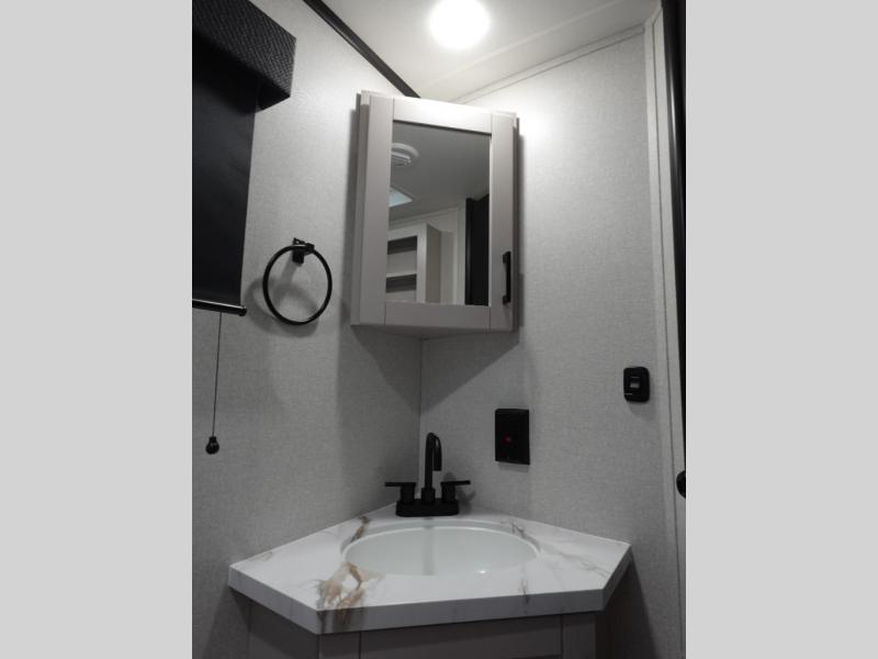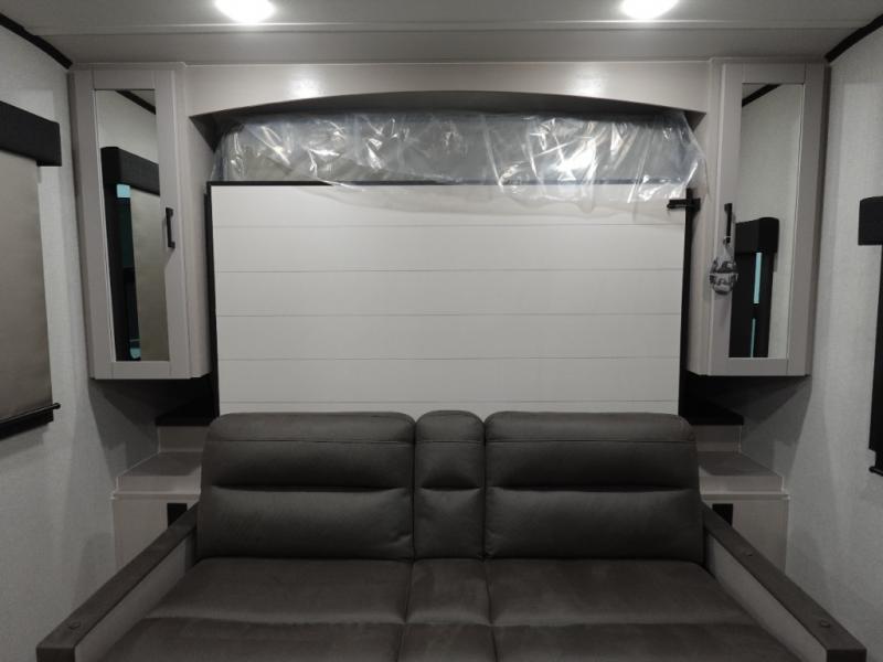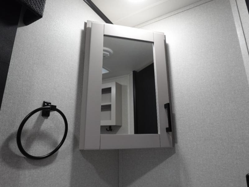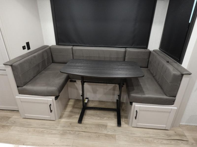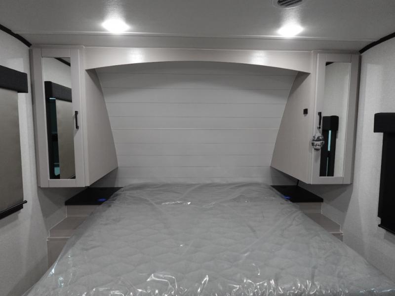 You'll be surprised how easy it will be to camp in this travel trailer for seven! The double-size bunks include flip-up storage and an exterior cargo door so you can easily pack in gear, plus there is front exterior storage as well. A Murphy bed up front means you can enjoy comfortable sleeping space at night, and cozy seating space during the day on the jack knife sofa. You'll also find a U-shaped dinette slide where you can dine together, and the pantry within the slide can hold snacks for everyone! This model includes an L-shaped kitchen counter, a microwave oven and three burner range to cook meals, plus an 11 cu. ft. 12V refrigerator for perishables! You may just find yourselves outdoor most of the time since there is a 19' power awning with LED lights and an outside kitchen!