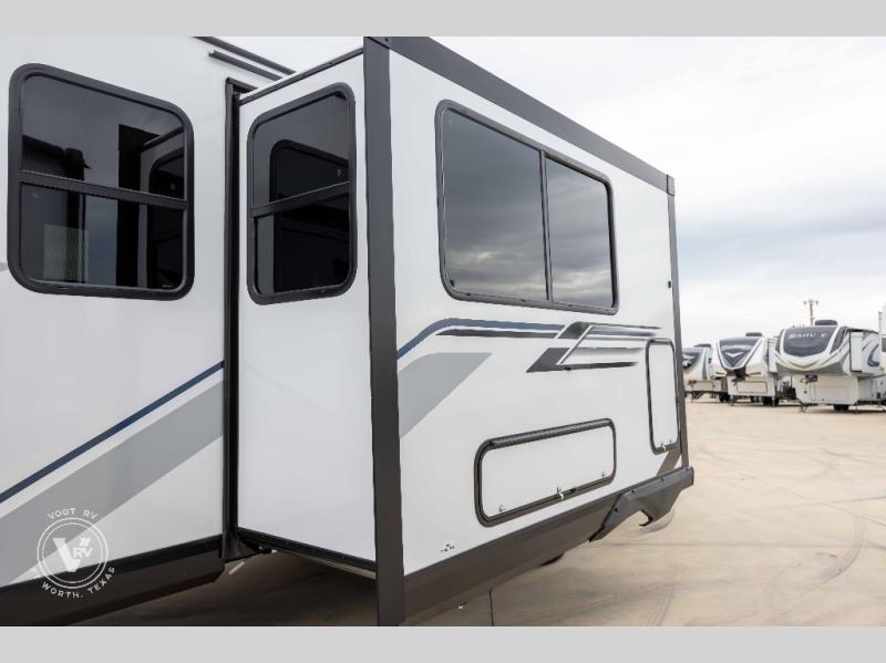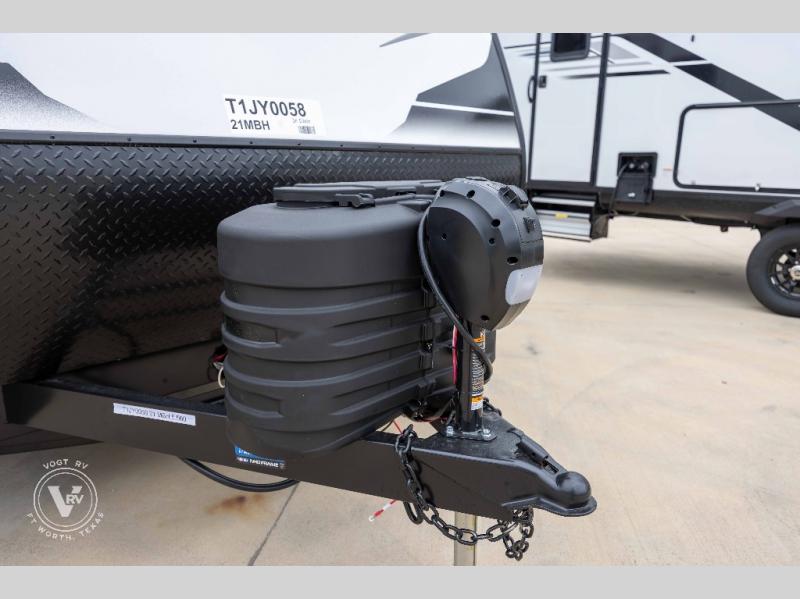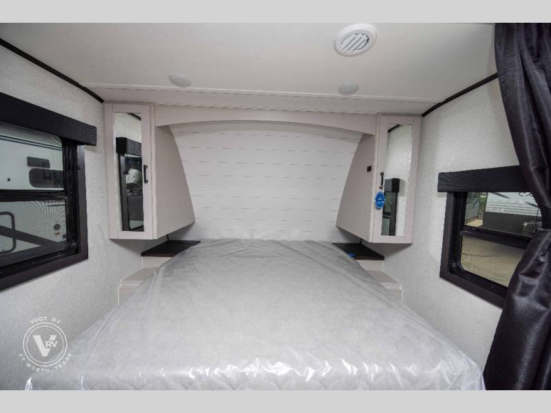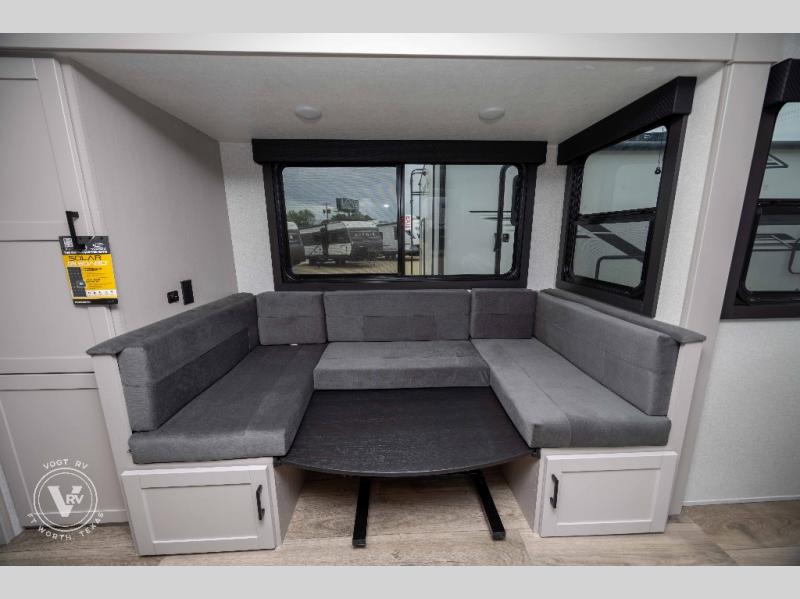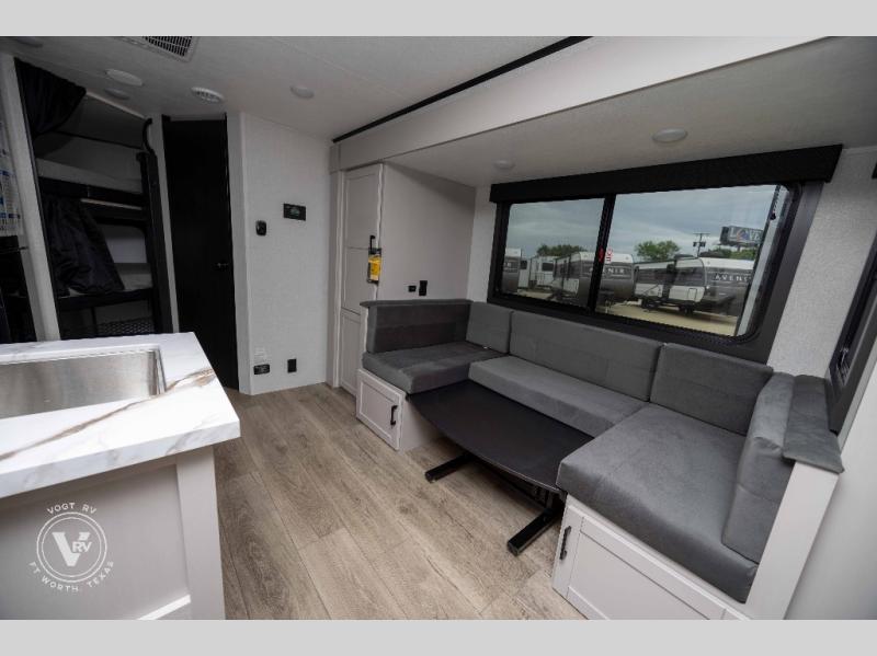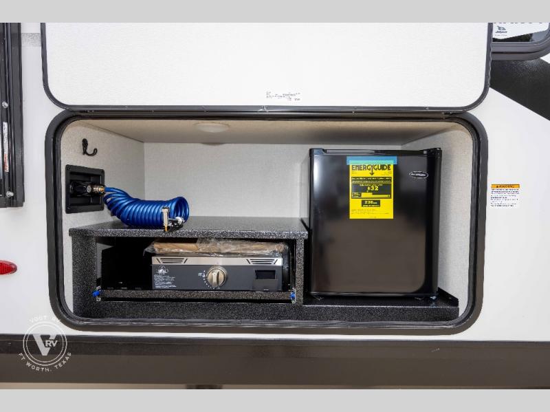 You'll be surprised how easy it will be to camp in this travel trailer for seven! The double-size bunks include flip-up storage and an exterior cargo door so you can easily pack in gear, plus there is front exterior storage as well. A Murphy bed up front means you can enjoy comfortable sleeping space at night, and cozy seating space during the day on the jack knife sofa. You'll also find a U-shaped dinette slide where you can dine together, and the pantry within the slide can hold snacks for everyone! This model includes an L-shaped kitchen counter, a microwave oven and three burner range to cook meals, plus an 11 cu. ft. 12V refrigerator for perishables! You may just find yourselves outdoor most of the time since there is a 19' power awning with LED lights and an outside kitchen!