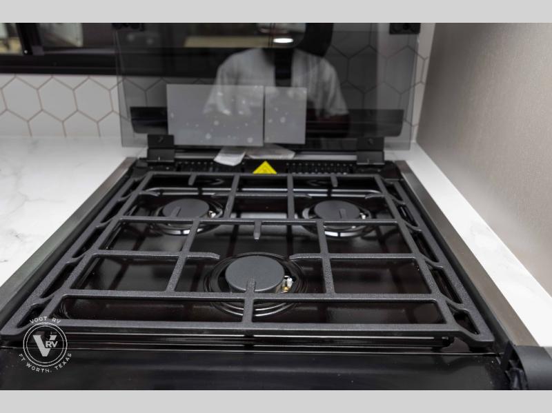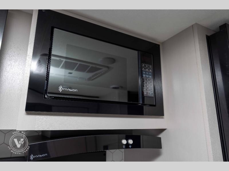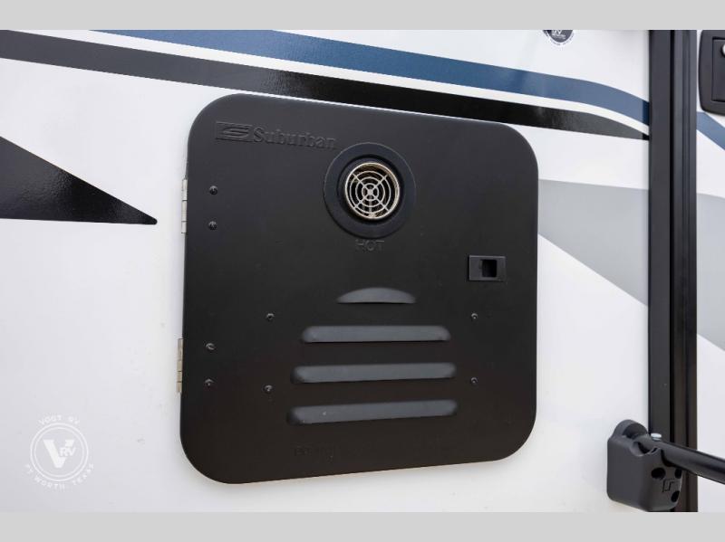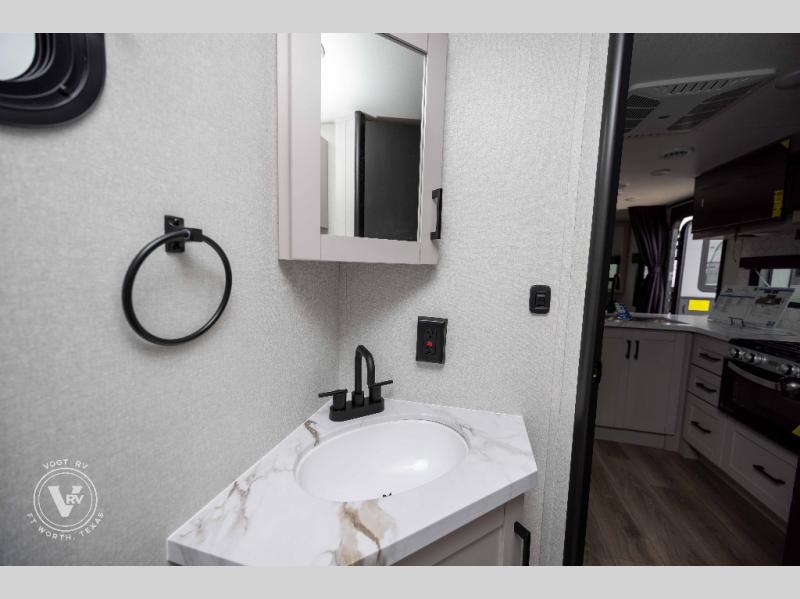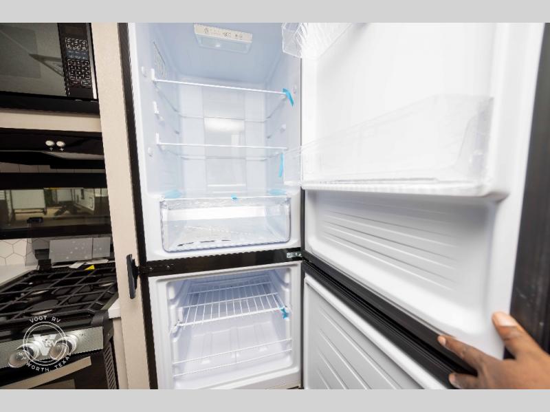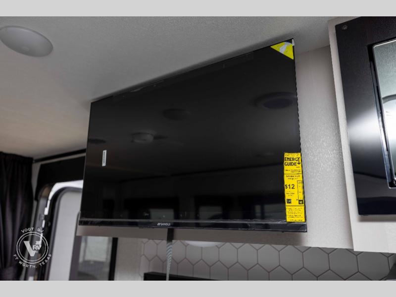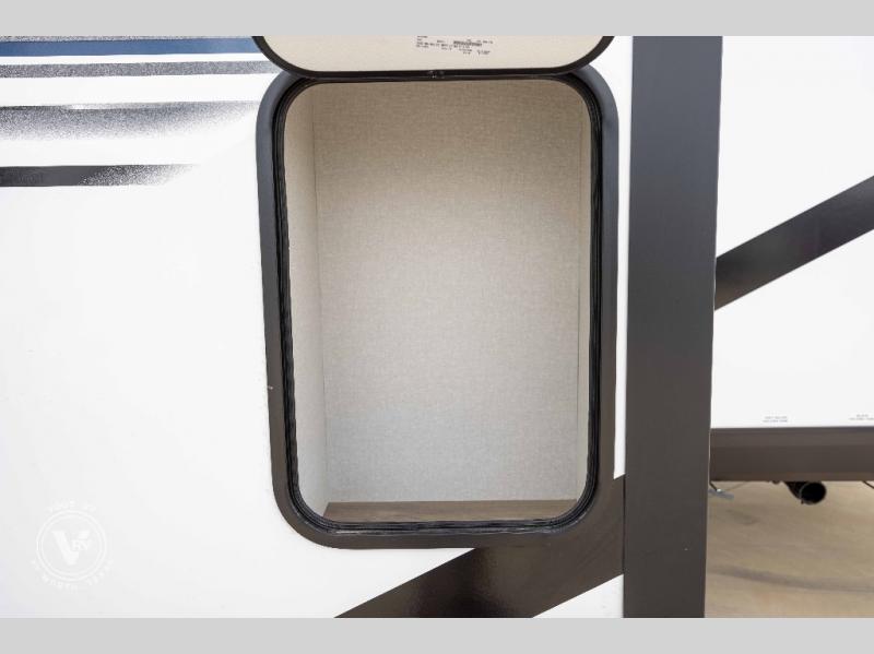 You'll be surprised how easy it will be to camp in this travel trailer for seven! The double-size bunks include flip-up storage and an exterior cargo door so you can easily pack in gear, plus there is front exterior storage as well. A Murphy bed up front means you can enjoy comfortable sleeping space at night, and cozy seating space during the day on the jack knife sofa. You'll also find a U-shaped dinette slide where you can dine together, and the pantry within the slide can hold snacks for everyone! This model includes an L-shaped kitchen counter, a microwave oven and three burner range to cook meals, plus an 11 cu. ft. 12V refrigerator for perishables! You may just find yourselves outdoor most of the time since there is a 19' power awning with LED lights and an outside kitchen!