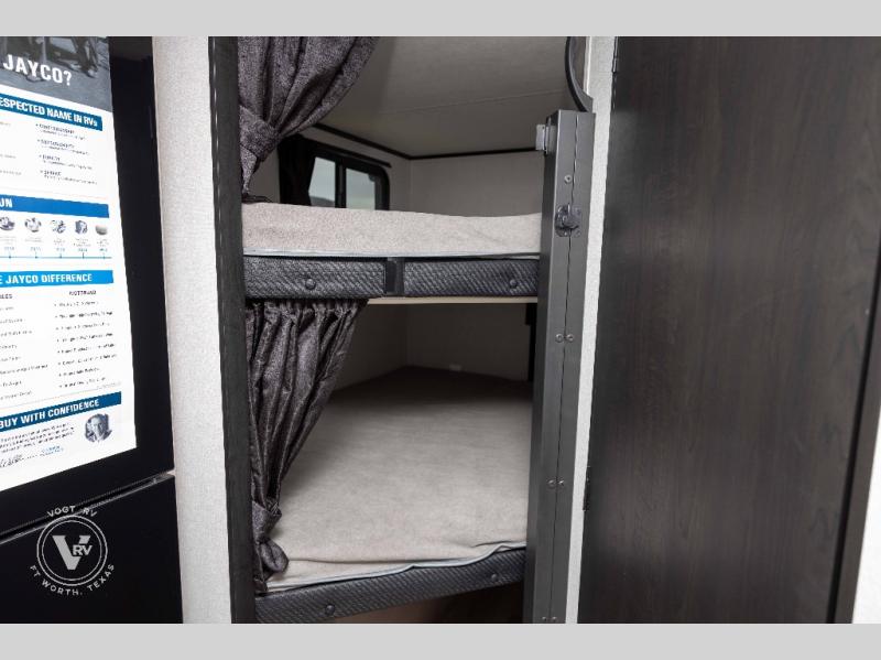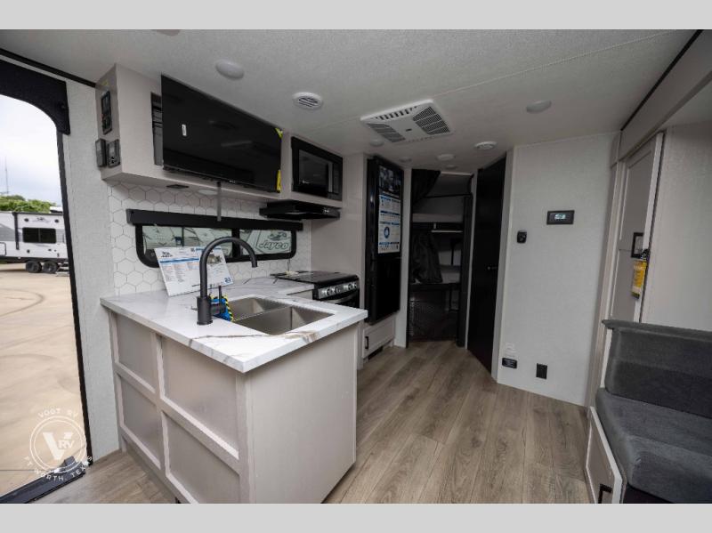 With any Jay Feather travel trailer by Jayco, you will enjoy lightweight towing, convenient exterior amenities, and at-home comforts inside! The Overlander 1 Solar Package included within the Jay Sport Package comes with a 200W solar panel and a 30-amp digital controller so you can enjoy some off-grid camping. There is also a modern graphics package with a dual-colored sidewall, LCI Solid Step fold-down aluminum tread steps on the main entry door, and Climate Shield 0 -100° F tested weather insulation package that will allow you to camp in all sorts of climates. The Customer Value Package will make time outdoors easier than ever with a power tongue jack and a Rock Solid stabilizer system, plus American-made nitro-filled Goodyear tires with self-adjusting electric brakes. More exterior features include a Keyed-Alike locking system, marine grade exterior speakers, a Magnum Truss roof system, and the list goes on! And we haven't even touched on the interior comforts, like the residential style seamless countertops and vinyl flooring throughout, decorative backsplash, handcrafted hardwood door/drawer fronts, and multiple USB charging ports to keep you going!