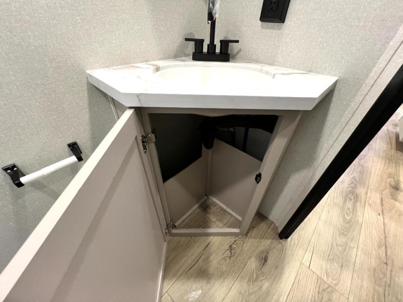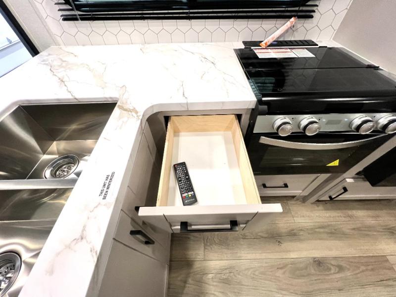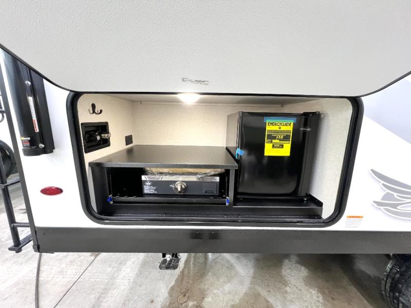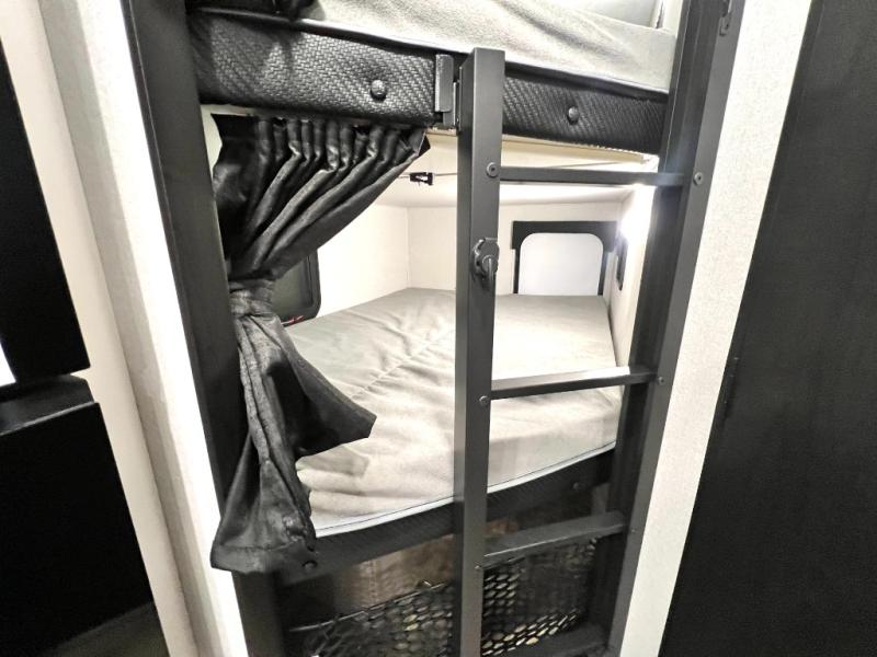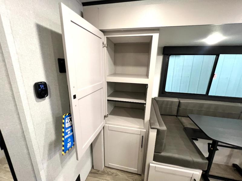 You'll be surprised how easy it will be to camp in this travel trailer for seven! The double-size bunks include flip-up storage and an exterior cargo door so you can easily pack in gear, plus there is front exterior storage as well. A Murphy bed up front means you can enjoy comfortable sleeping space at night, and cozy seating space during the day on the jack knife sofa. You'll also find a U-shaped dinette slide where you can dine together, and the pantry within the slide can hold snacks for everyone! This model includes an L-shaped kitchen counter, seamless countertops throughout and a three burner range to cook meals, plus an 11 cu. ft. 12V refrigerator for perishables! You may just find yourselves outdoor most of the time since there is a 19' power awning with LED lights.