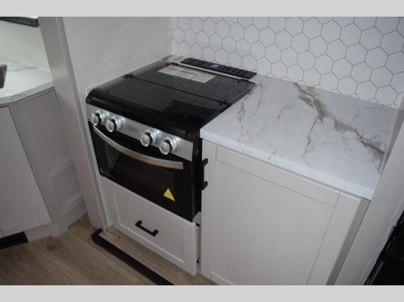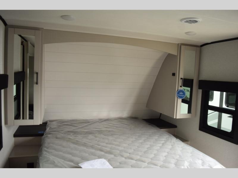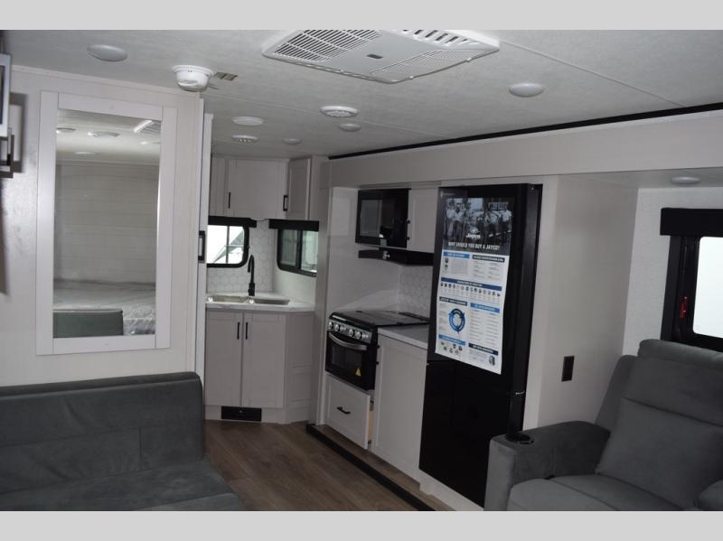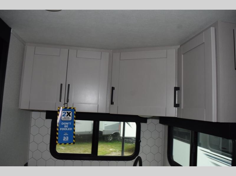 With any Jay Feather travel trailer by Jayco, you will enjoy lightweight towing, convenient exterior amenities, and at-home comforts inside! The Overlander 1 Solar Package included within the Jay Sport Package comes with a 200W solar panel and a 30-amp digital controller so you can enjoy some off-grid camping. There is also a modern graphics package with a dual-colored sidewall, LCI Solid Step fold-down aluminum tread steps on the main entry door, and Climate Shield 0 -100° F tested weather insulation package that will allow you to camp in all sorts of climates. The Customer Value Package will make time outdoors easier than ever with a power tongue jack and a Rock Solid stabilizer system, plus American-made nitro-filled Goodyear tires with self-adjusting electric brakes. More exterior features include a Keyed-Alike locking system, marine grade exterior speakers, a Magnum Truss roof system, and the list goes on! And we haven't even touched on the interior comforts, like the residential style seamless countertops and vinyl flooring throughout, decorative backsplash, handcrafted hardwood door/drawer fronts, and multiple USB charging ports to keep you going!