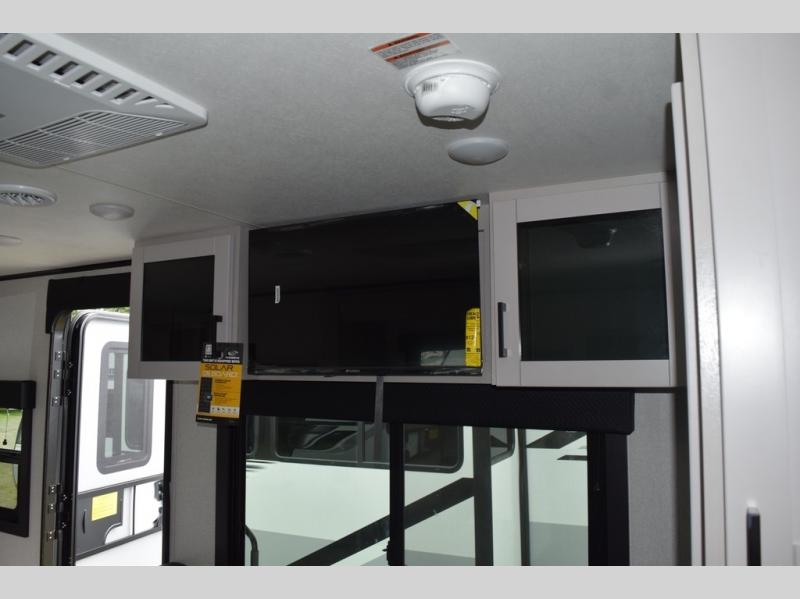If you wish to escape the hustle and bustle of everyday life then you need this travel trailer! It features a front 60" x 75" Murphy bed with wardrobes on either side for bedtime and a jackknife sofa during the day. You can play games at the booth dinette after enjoying a delicious meal prepared with the three burner cooktop or relax at the theater seating with table trays and enjoy the LED TV. The rear corner bathroom has a shower with a skylight for you to get cleaned up in, as well as a linen closet to store your towels. There is exterior storage space to keep your outdoor gear, a 15' power awning to protect you from the elements.