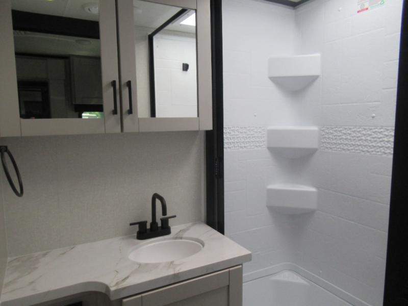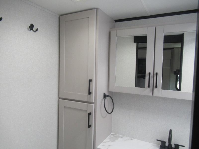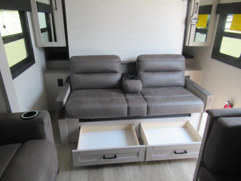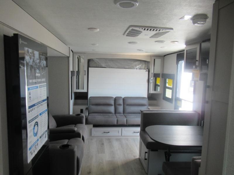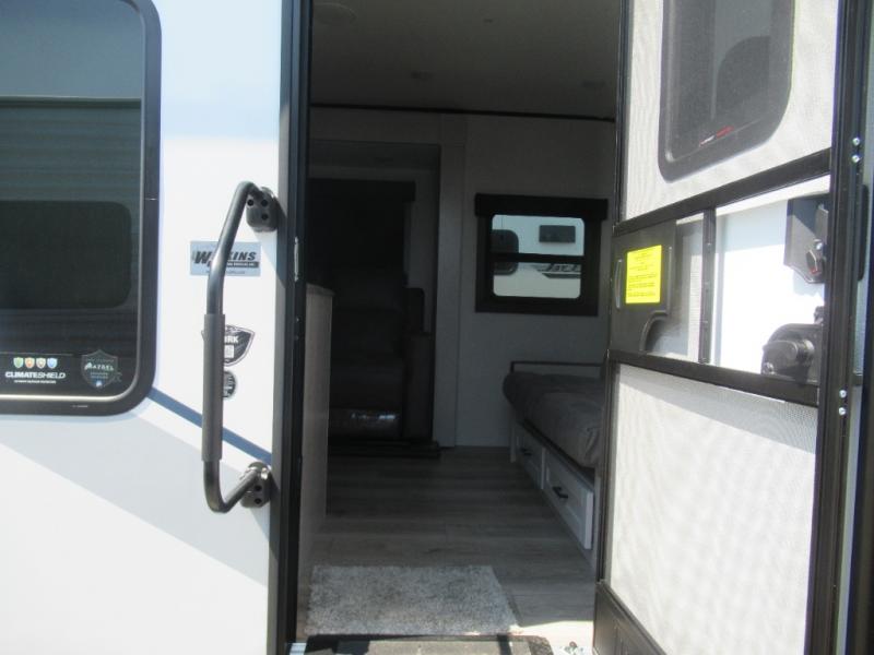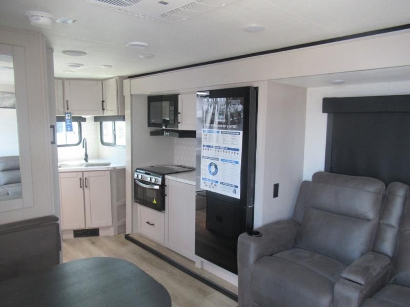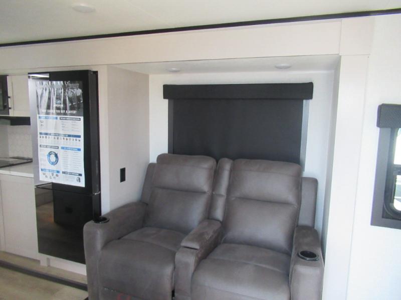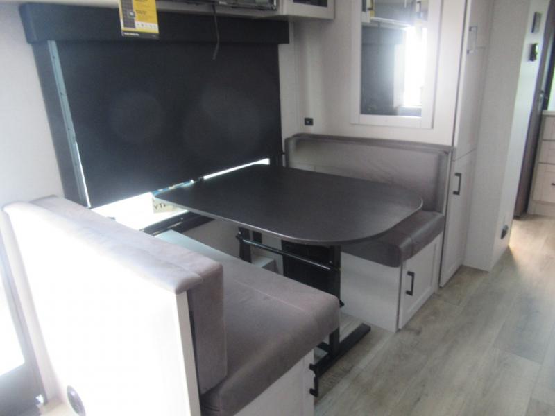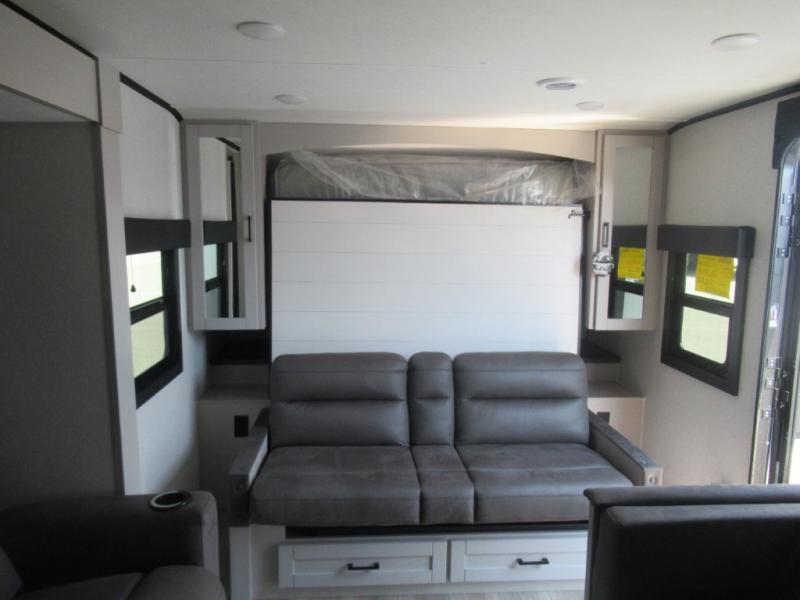 If you wish to escape the hustle and bustle of everyday life then you need this travel trailer! It features a front 60" x 75" Murphy bed with wardrobes on either side for bedtime and a jackknife sofa during the day. You can play games at the booth dinette after enjoying a delicious meal prepared with the three burner cooktop or relax at the theater seating with table trays and enjoy the LED TV. The rear corner bathroom has a shower with a skylight for you to get cleaned up in, as well as a linen closet to store your towels. There is exterior storage space to keep your outdoor gear, a 15' power awning to protect you from the elements.
