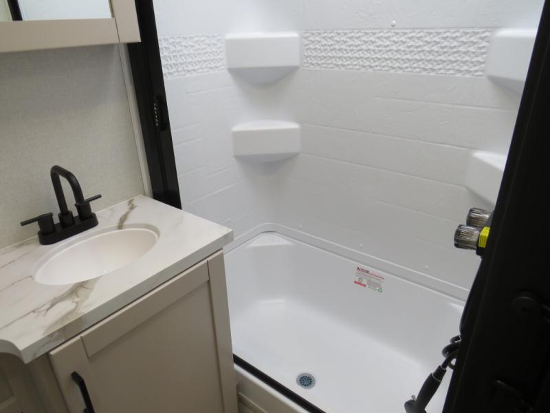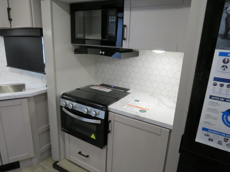 With any Jay Feather travel trailer by Jayco, you will enjoy lightweight towing, convenient exterior amenities, and at-home comforts inside! The Overlander 1 Solar Package included within the Jay Sport Package comes with a 200W solar panel and a 30-amp digital controller so you can enjoy some off-grid camping. There is also a modern graphics package with a dual-colored sidewall, LCI Solid Step fold-down aluminum tread steps on the main entry door, and Climate Shield 0 -100° F tested weather insulation package that will allow you to camp in all sorts of climates. The Customer Value Package will make time outdoors easier than ever with a power tongue jack and a Rock Solid stabilizer system, plus American-made nitro-filled Goodyear tires with self-adjusting electric brakes. More exterior features include a Keyed-Alike locking system, marine grade exterior speakers, a Magnum Truss roof system, and the list goes on! And we haven't even touched on the interior comforts, like the residential style seamless countertops and vinyl flooring throughout, decorative backsplash, handcrafted hardwood door/drawer fronts, and multiple USB charging ports to keep you going!