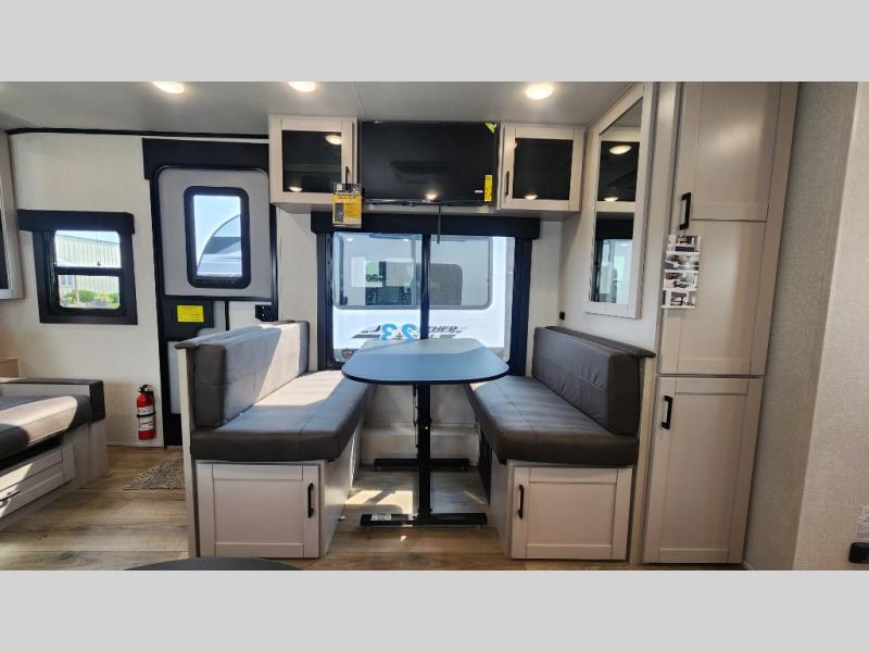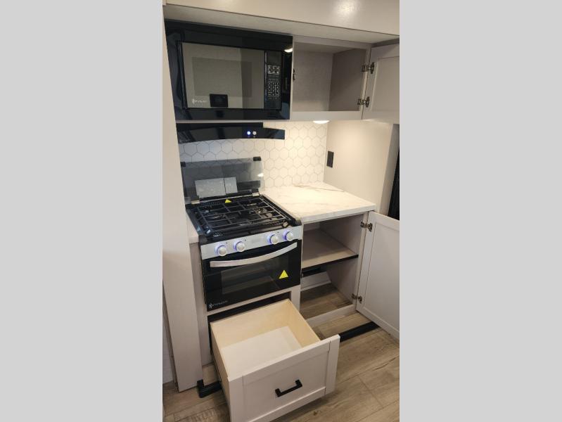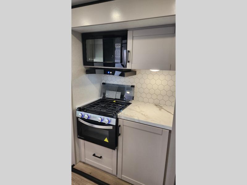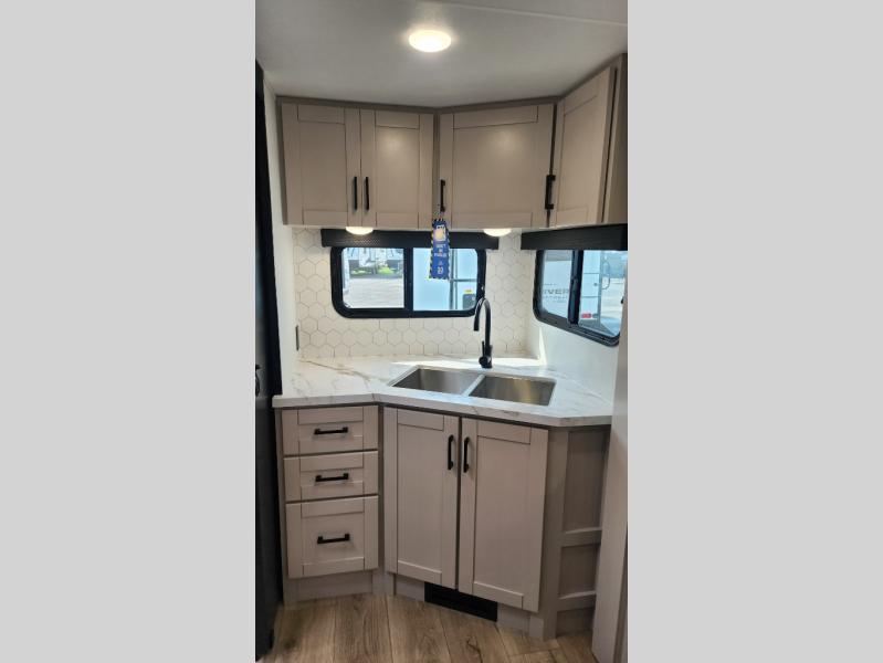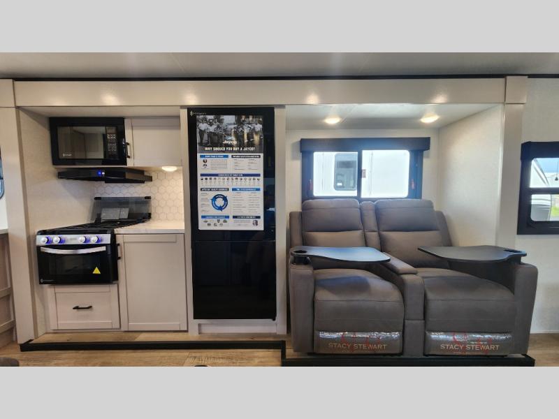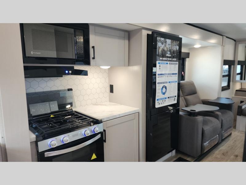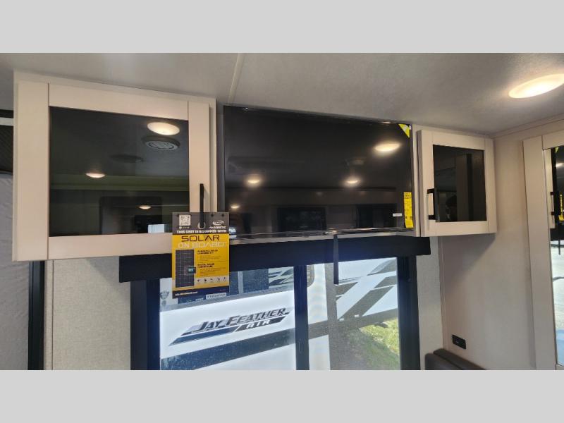 With any Jay Feather travel trailer by Jayco, you will enjoy lightweight towing, convenient exterior amenities, and at-home comforts inside! The Overlander 1 Solar Package included within the Jay Sport Package comes with a 200W solar panel and a 30-amp digital controller so you can enjoy some off-grid camping. There is also a modern graphics package with a dual-colored sidewall, LCI Solid Step fold-down aluminum tread steps on the main entry door, and Climate Shield 0 -100° F tested weather insulation package that will allow you to camp in all sorts of climates. The Customer Value Package will make time outdoors easier than ever with a power tongue jack and a Rock Solid stabilizer system, plus American-made nitro-filled Goodyear tires with self-adjusting electric brakes. More exterior features include a Keyed-Alike locking system, marine grade exterior speakers, a Magnum Truss roof system, and the list goes on! And we haven't even touched on the interior comforts, like the residential style seamless countertops and vinyl flooring throughout, decorative backsplash, handcrafted hardwood door/drawer fronts, and multiple USB charging ports to keep you going!