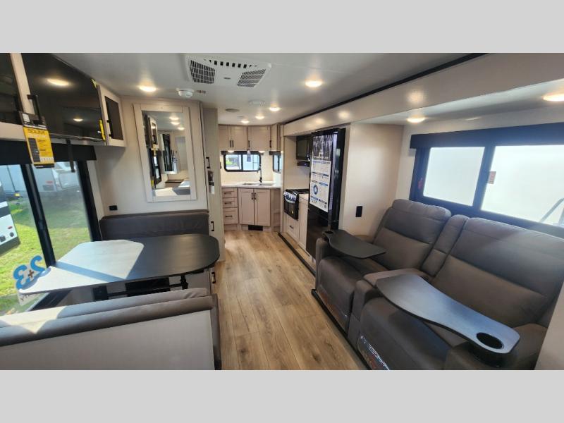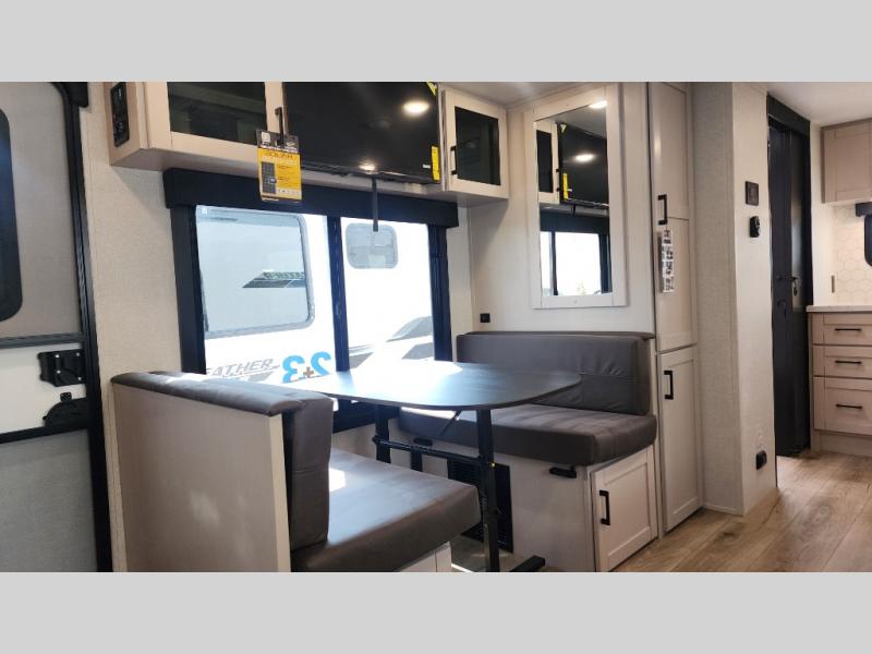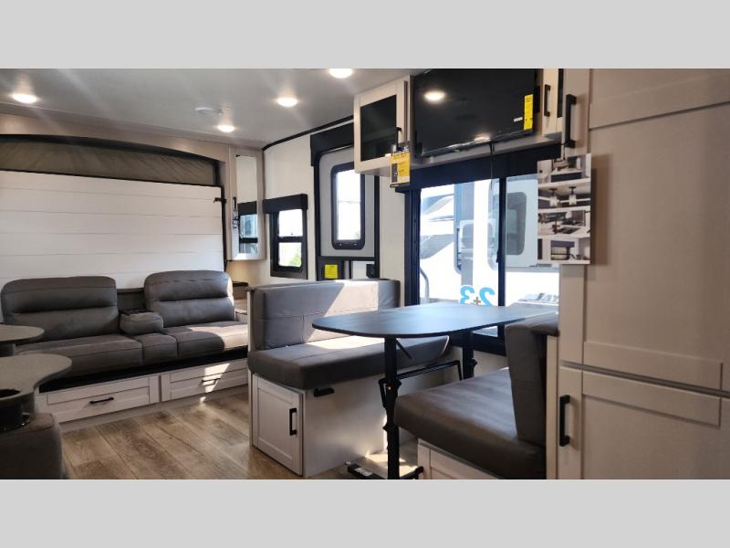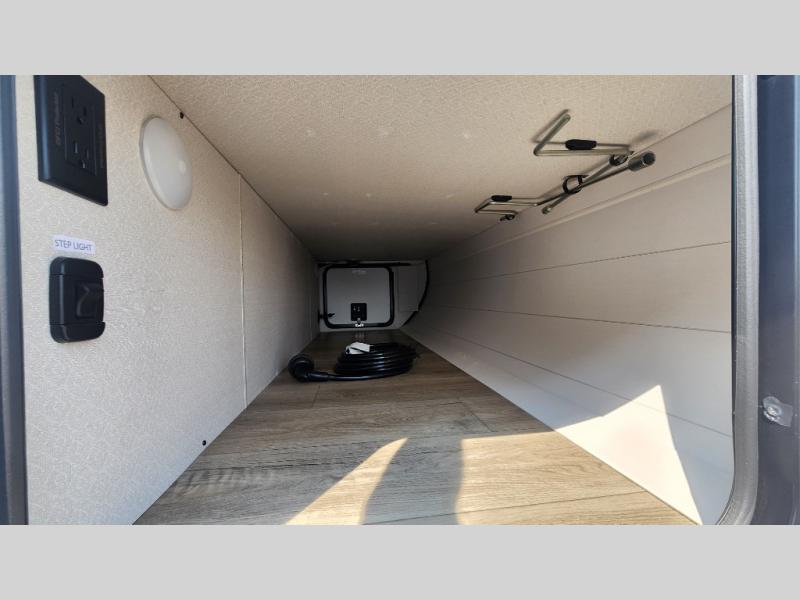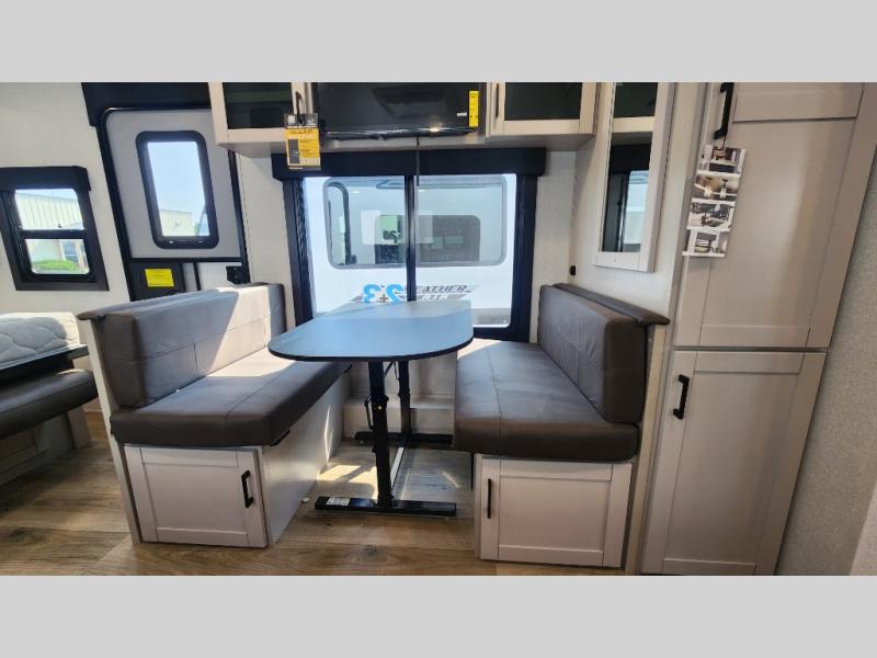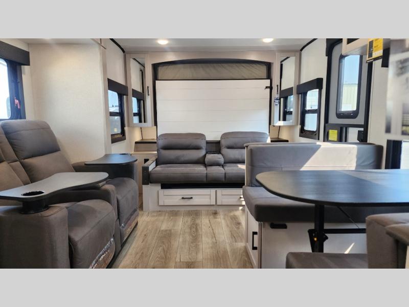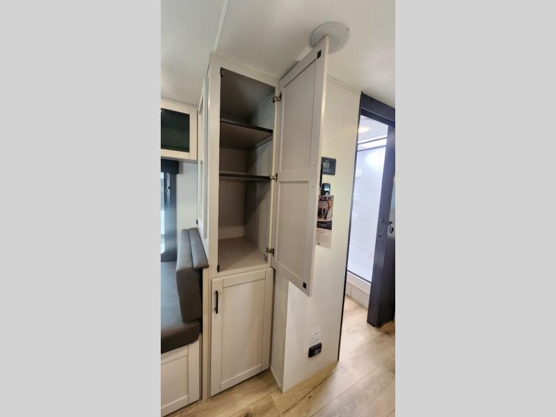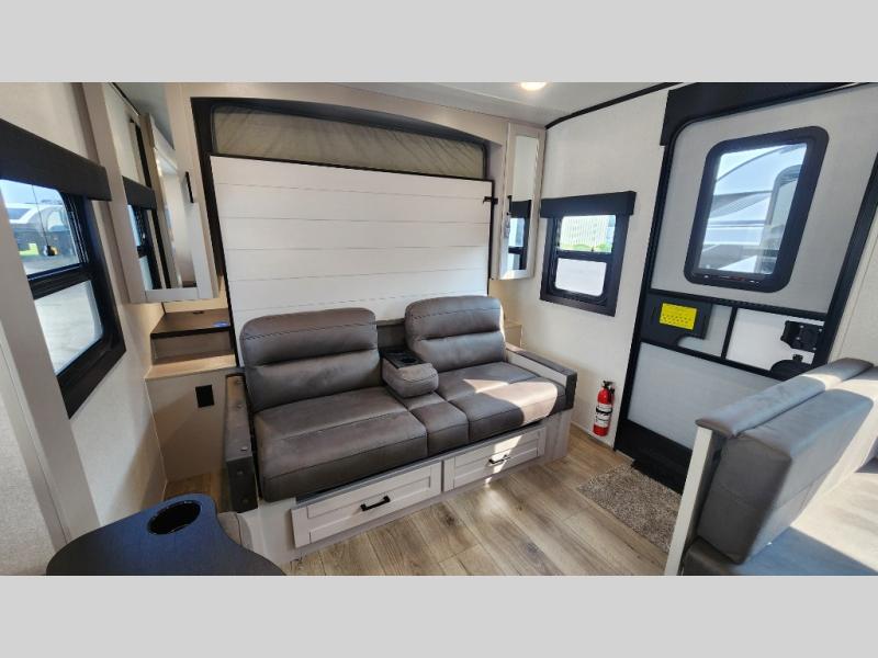 If you wish to escape the hustle and bustle of everyday life then you need this travel trailer! It features a front 60" x 75" Murphy bed with wardrobes on either side for bedtime and a jackknife sofa during the day. You can play games at the booth dinette after enjoying a delicious meal prepared with the three burner cooktop or relax at the theater seating with table trays and enjoy the LED TV. The rear corner bathroom has a shower with a skylight for you to get cleaned up in, as well as a linen closet to store your towels. There is exterior storage space to keep your outdoor gear, a 15' power awning to protect you from the elements.