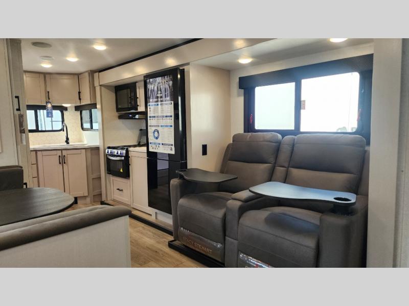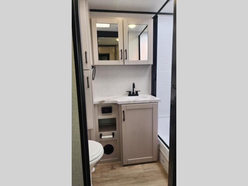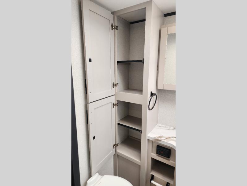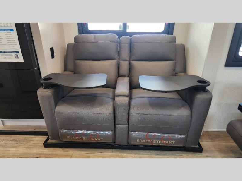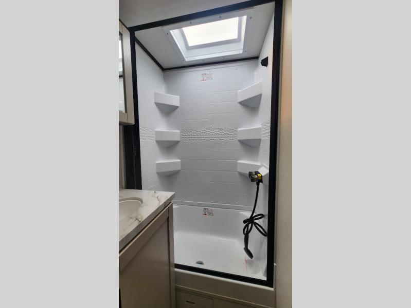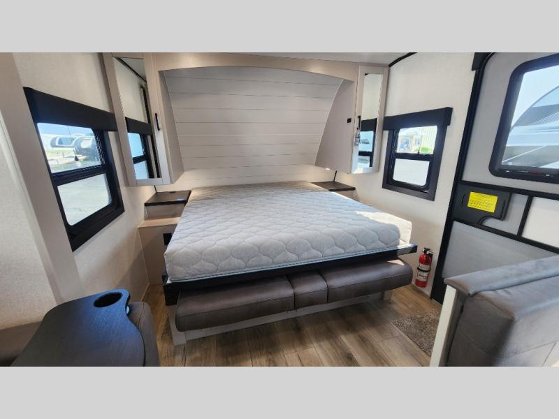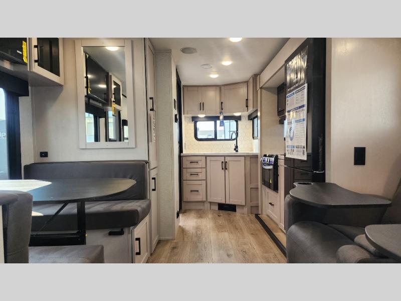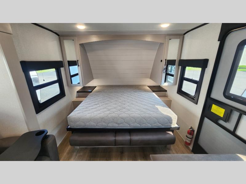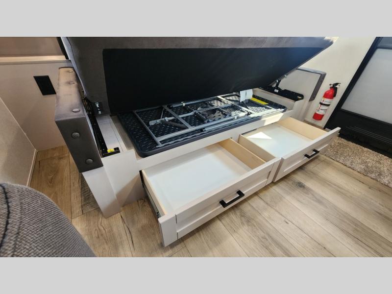If you wish to escape the hustle and bustle of everyday life then you need this travel trailer! It features a front 60" x 75" Murphy bed with wardrobes on either side for bedtime and a jackknife sofa during the day. You can play games at the booth dinette after enjoying a delicious meal prepared with the three burner cooktop or relax at the theater seating with table trays and enjoy the LED TV. The rear corner bathroom has a shower with a skylight for you to get cleaned up in, as well as a linen closet to store your towels. There is exterior storage space to keep your outdoor gear, a 15' power awning to protect you from the elements.