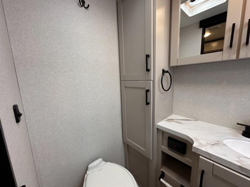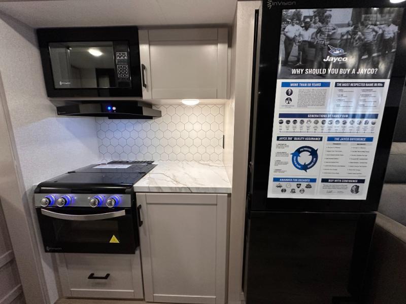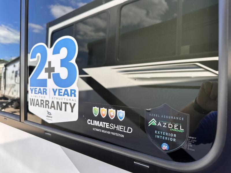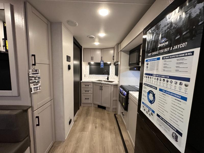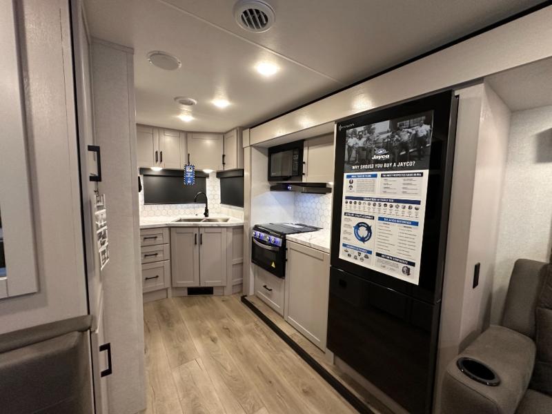 With any Jay Feather travel trailer by Jayco, you will enjoy lightweight towing, convenient exterior amenities, and at-home comforts inside! The Overlander 1 Solar Package included within the Jay Sport Package comes with a 200W solar panel and a 30-amp digital controller so you can enjoy some off-grid camping. There is also a modern graphics package with a dual-colored sidewall, LCI Solid Step fold-down aluminum tread steps on the main entry door, and Climate Shield 0 -100° F tested weather insulation package that will allow you to camp in all sorts of climates. The Customer Value Package will make time outdoors easier than ever with a power tongue jack and a Rock Solid stabilizer system, plus American-made nitro-filled Goodyear tires with self-adjusting electric brakes. More exterior features include a Keyed-Alike locking system, marine grade exterior speakers, a Magnum Truss roof system, and the list goes on! And we haven't even touched on the interior comforts, like the residential style seamless countertops and vinyl flooring throughout, decorative backsplash, handcrafted hardwood door/drawer fronts, and multiple USB charging ports to keep you going!