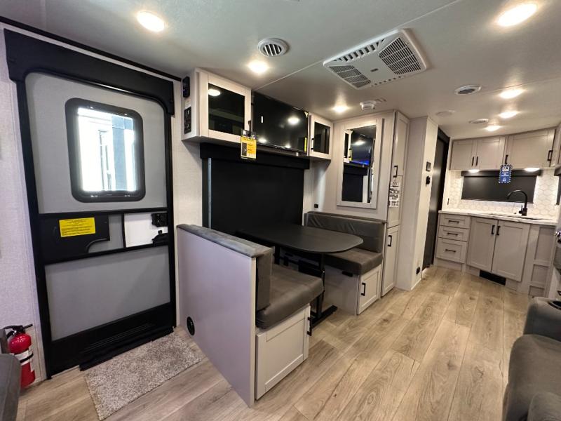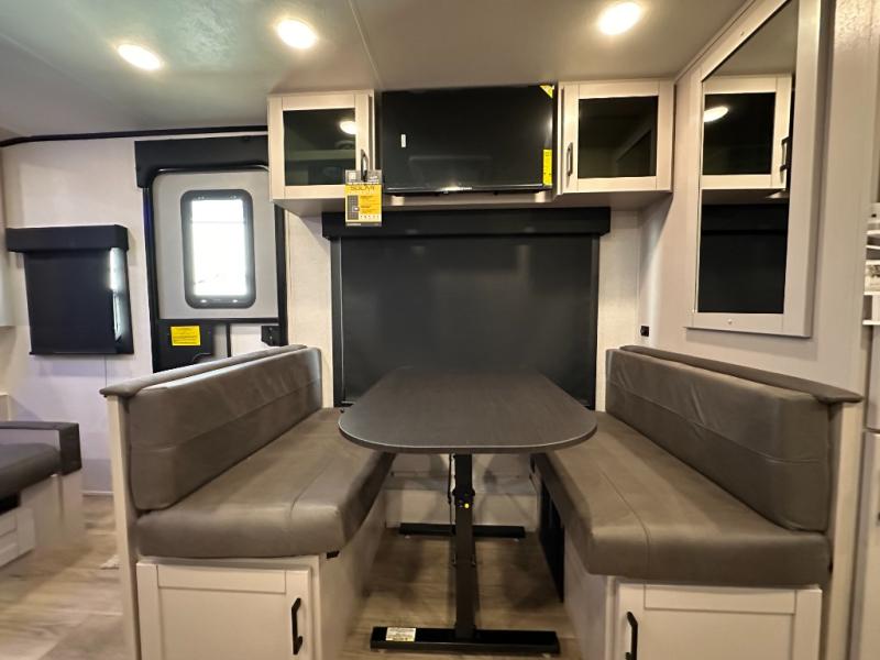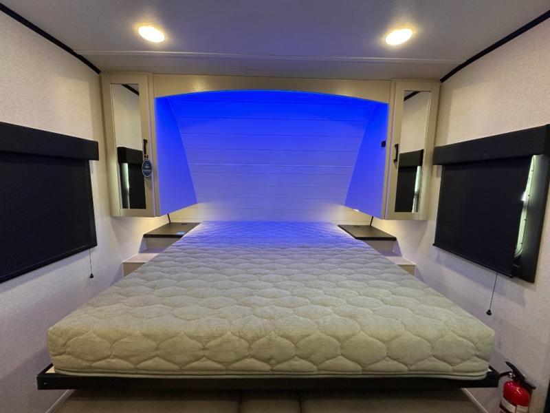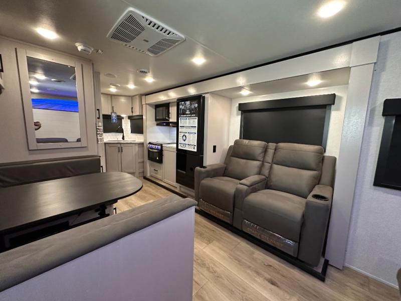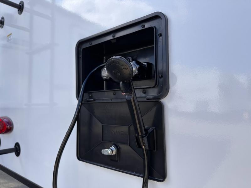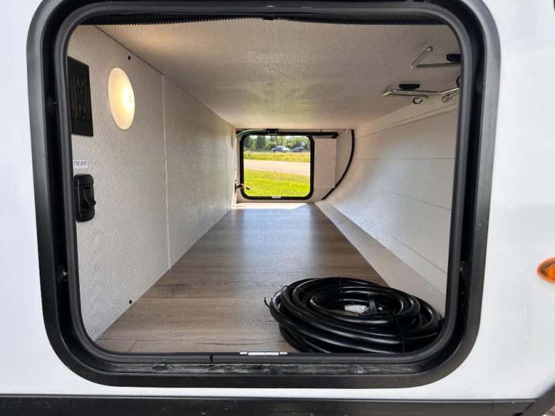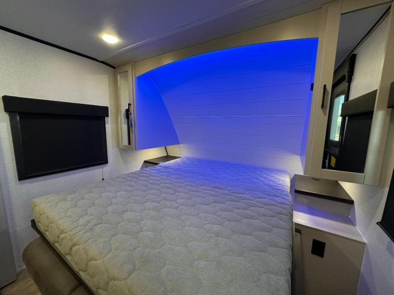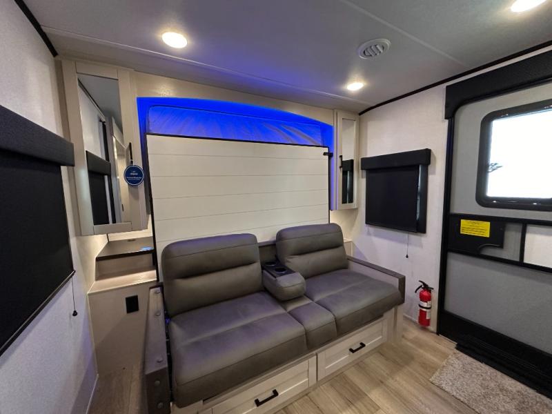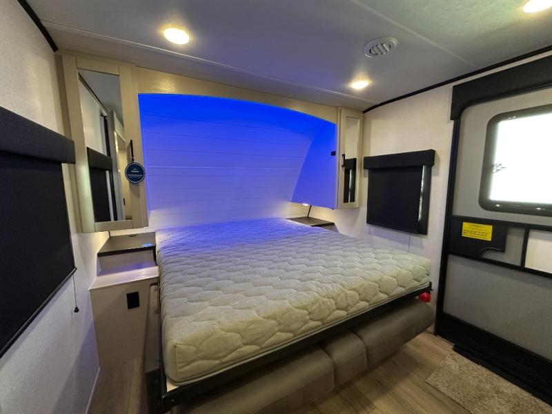 If you wish to escape the hustle and bustle of everyday life then you need this travel trailer! It features a front 60" x 75" Murphy bed with wardrobes on either side for bedtime and a jackknife sofa during the day. You can play games at the booth dinette after enjoying a delicious meal prepared with the three burner cooktop or relax at the theater seating with table trays and enjoy the LED TV. The rear corner bathroom has a shower with a skylight for you to get cleaned up in, as well as a linen closet to store your towels. There is exterior storage space to keep your outdoor gear, a 15' power awning to protect you from the elements.