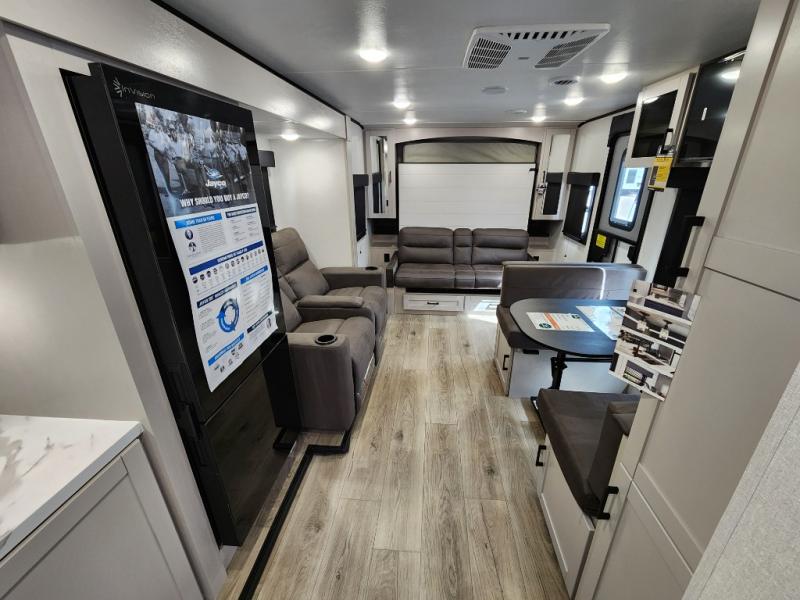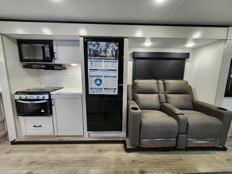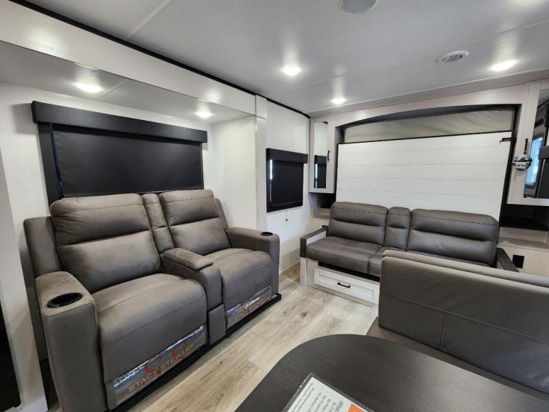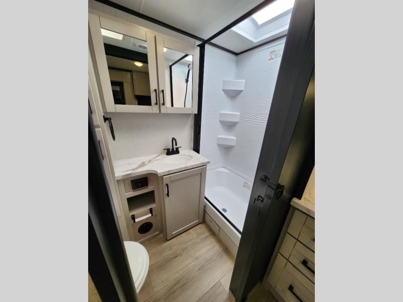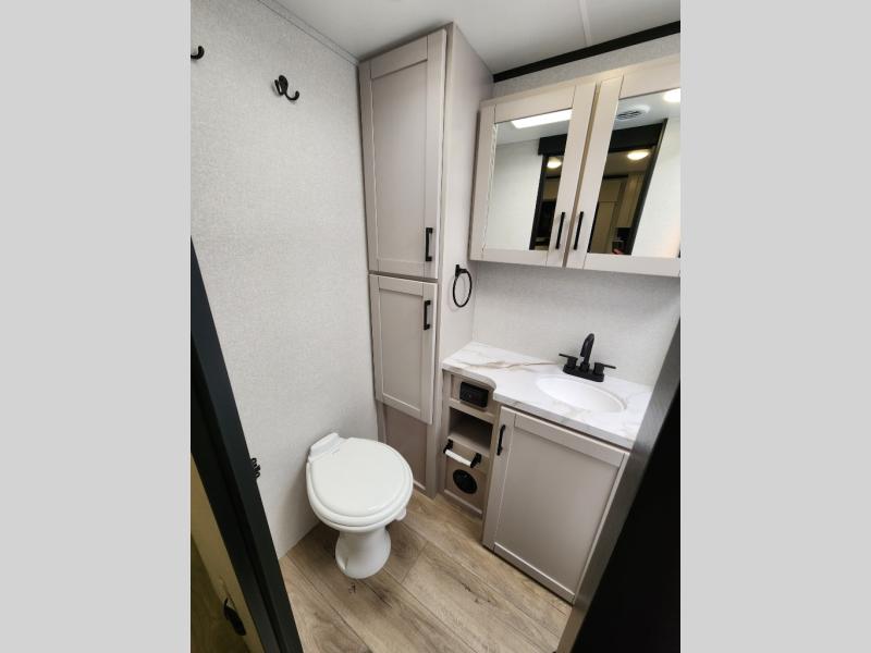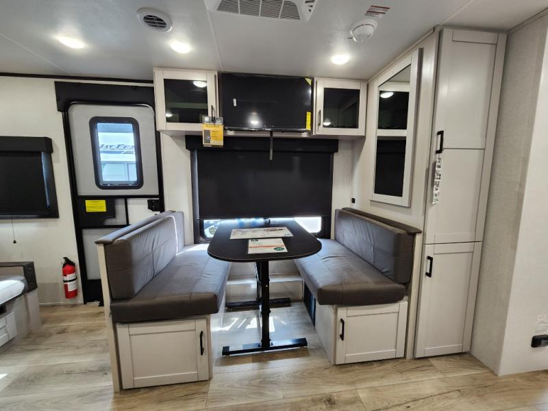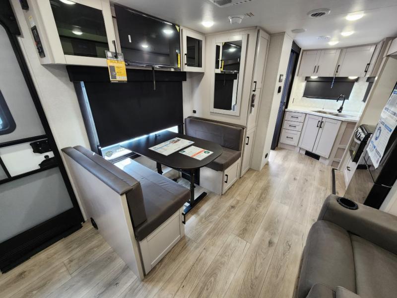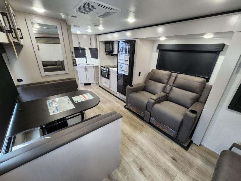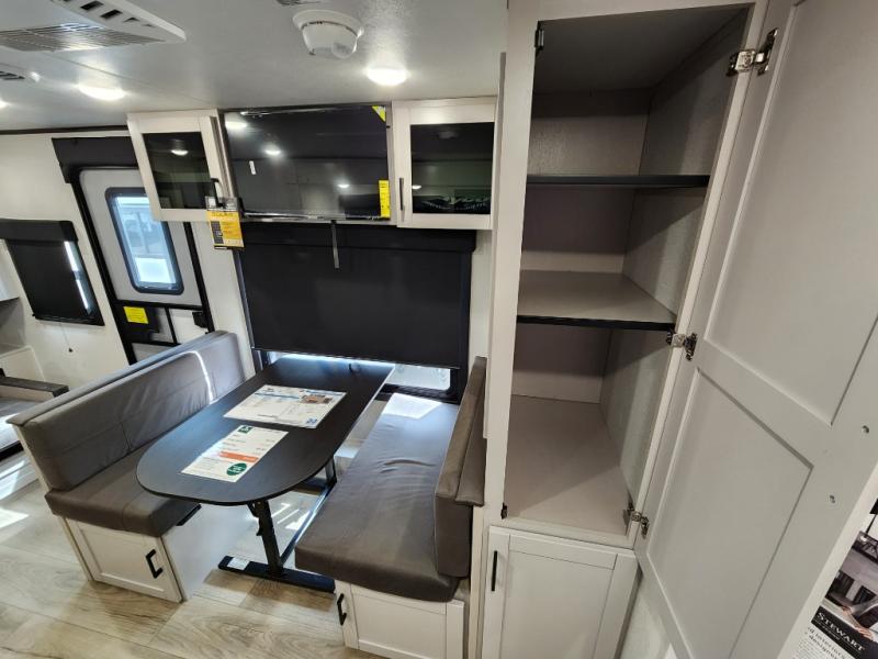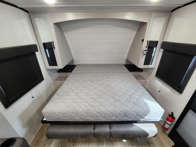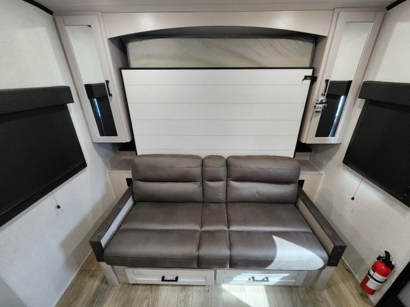 If you wish to escape the hustle and bustle of everyday life then you need this travel trailer! It features a front 60" x 75" Murphy bed with wardrobes on either side for bedtime and a jackknife sofa during the day. You can play games at the booth dinette after enjoying a delicious meal prepared with the three burner cooktop or relax at the theater seating with table trays and enjoy the LED TV. The rear corner bathroom has a shower with a skylight for you to get cleaned up in, as well as a linen closet to store your towels. There is exterior storage space to keep your outdoor gear, a 15' power awning to protect you from the elements.