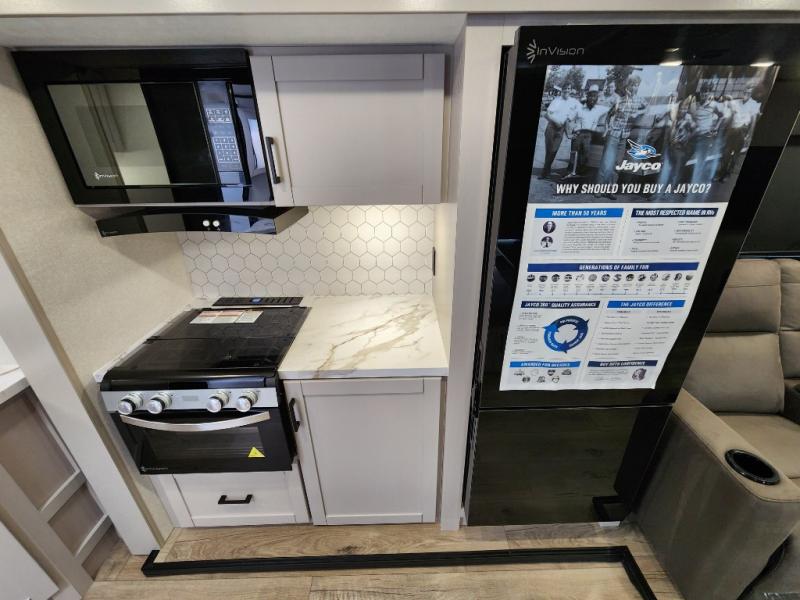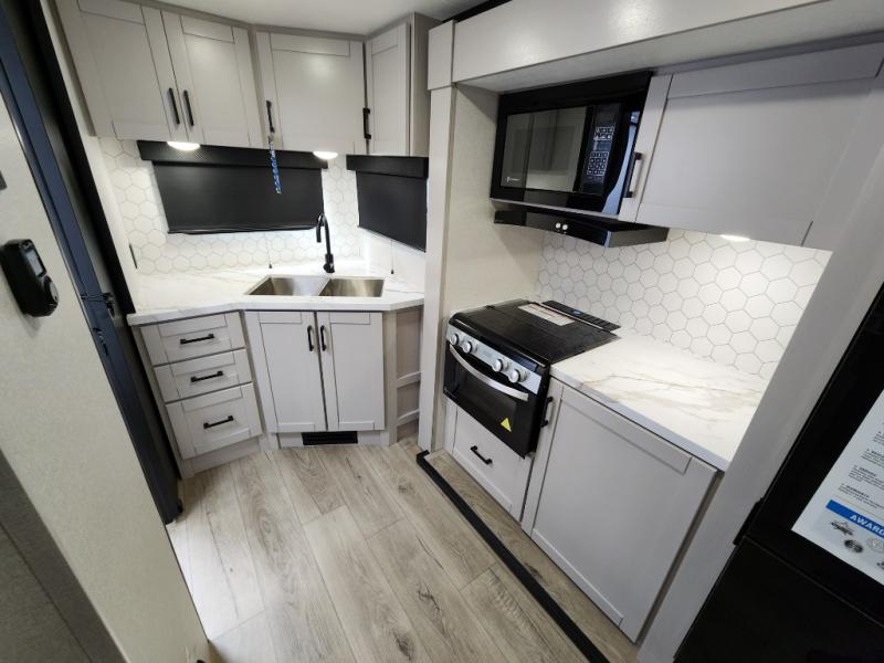 With any Jay Feather travel trailer by Jayco, you will enjoy lightweight towing, convenient exterior amenities, and at-home comforts inside! The Overlander 1 Solar Package included within the Jay Sport Package comes with a 200W solar panel and a 30-amp digital controller so you can enjoy some off-grid camping. There is also a modern graphics package with a dual-colored sidewall, LCI Solid Step fold-down aluminum tread steps on the main entry door, and Climate Shield 0 -100° F tested weather insulation package that will allow you to camp in all sorts of climates. The Customer Value Package will make time outdoors easier than ever with a power tongue jack and a Rock Solid stabilizer system, plus American-made nitro-filled Goodyear tires with self-adjusting electric brakes. More exterior features include a Keyed-Alike locking system, marine grade exterior speakers, a Magnum Truss roof system, and the list goes on! And we haven't even touched on the interior comforts, like the residential style seamless countertops and vinyl flooring throughout, decorative backsplash, handcrafted hardwood door/drawer fronts, and multiple USB charging ports to keep you going!