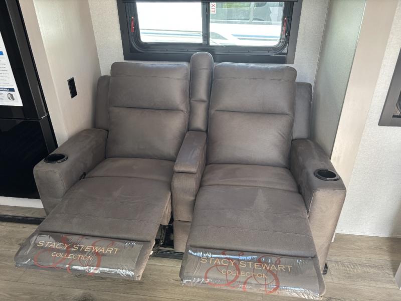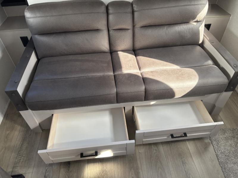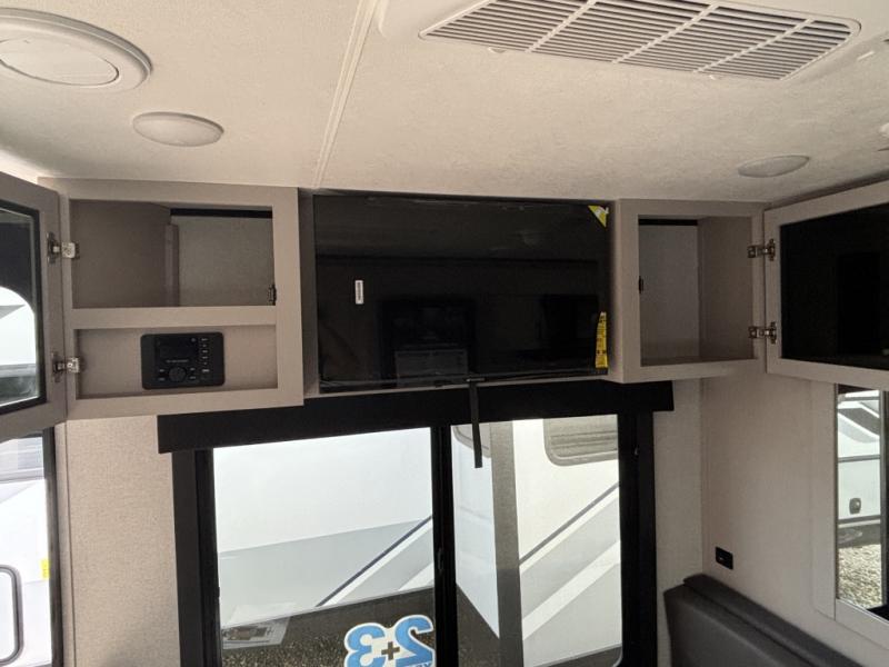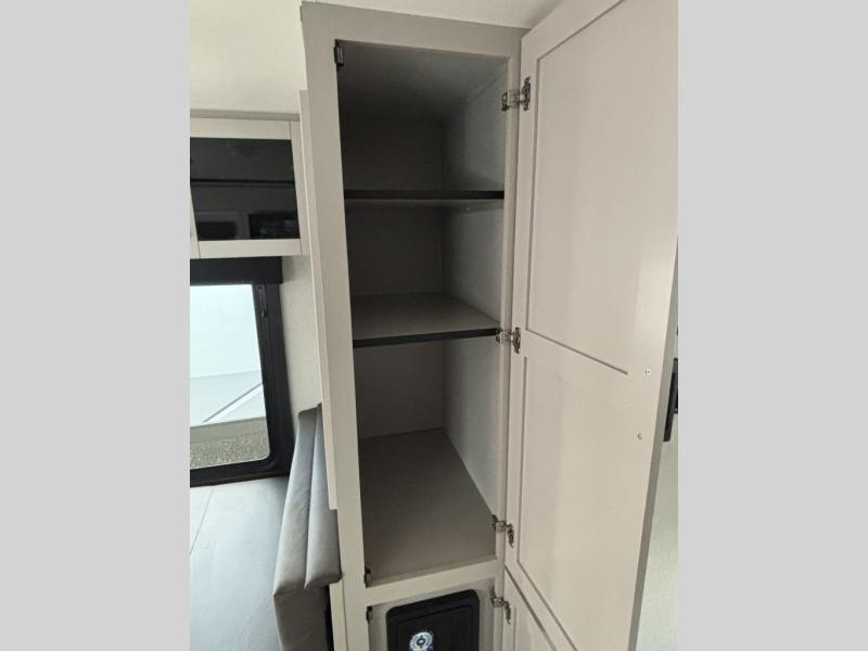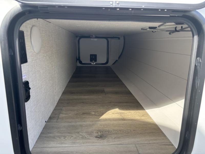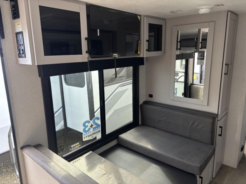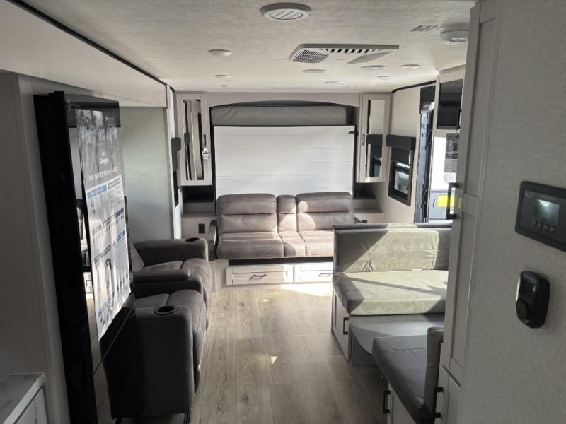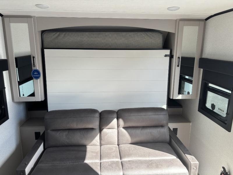 If you wish to escape the hustle and bustle of everyday life then you need this travel trailer! It features a front 60" x 75" Murphy bed with wardrobes on either side for bedtime and a jackknife sofa during the day. You can play games at the booth dinette after enjoying a delicious meal prepared with the three burner cooktop or relax at the theater seating with table trays and enjoy the LED TV. The rear corner bathroom has a shower with a skylight for you to get cleaned up in, as well as a linen closet to store your towels. There is exterior storage space to keep your outdoor gear, a 15' power awning to protect you from the elements.