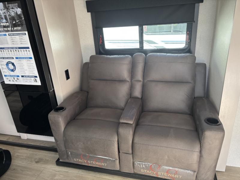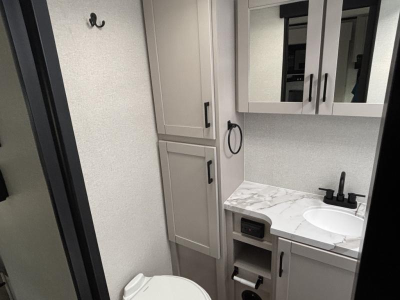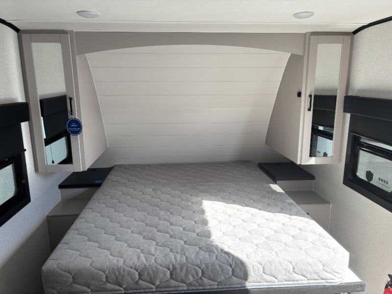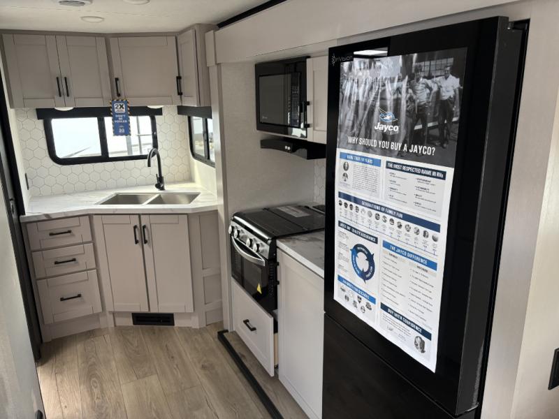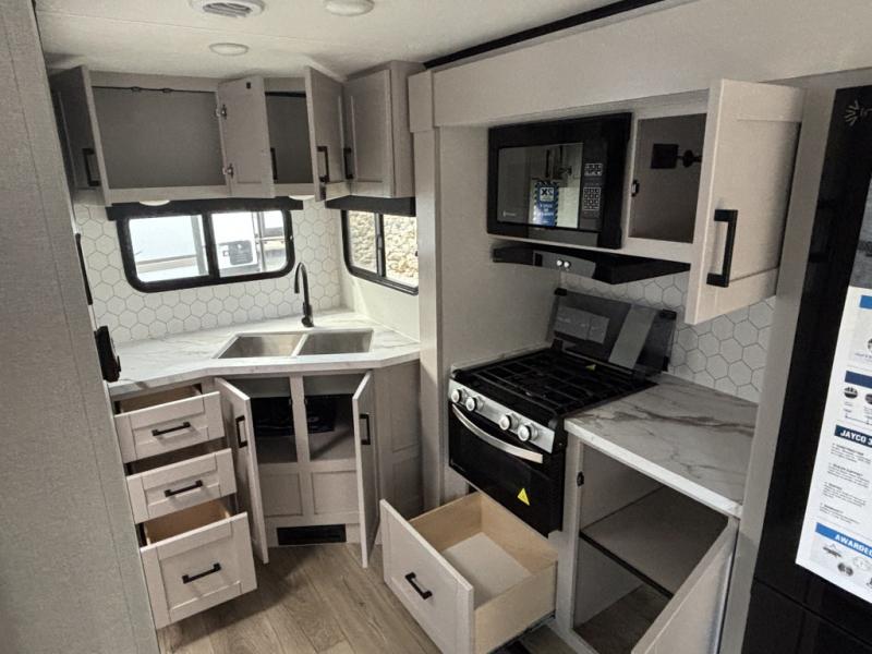 With any Jay Feather travel trailer by Jayco, you will enjoy lightweight towing, convenient exterior amenities, and at-home comforts inside! The Overlander 1 Solar Package included within the Jay Sport Package comes with a 200W solar panel and a 30-amp digital controller so you can enjoy some off-grid camping. There is also a modern graphics package with a dual-colored sidewall, LCI Solid Step fold-down aluminum tread steps on the main entry door, and Climate Shield 0 -100° F tested weather insulation package that will allow you to camp in all sorts of climates. The Customer Value Package will make time outdoors easier than ever with a power tongue jack and a Rock Solid stabilizer system, plus American-made nitro-filled Goodyear tires with self-adjusting electric brakes. More exterior features include a Keyed-Alike locking system, marine grade exterior speakers, a Magnum Truss roof system, and the list goes on! And we haven't even touched on the interior comforts, like the residential style seamless countertops and vinyl flooring throughout, decorative backsplash, handcrafted hardwood door/drawer fronts, and multiple USB charging ports to keep you going!