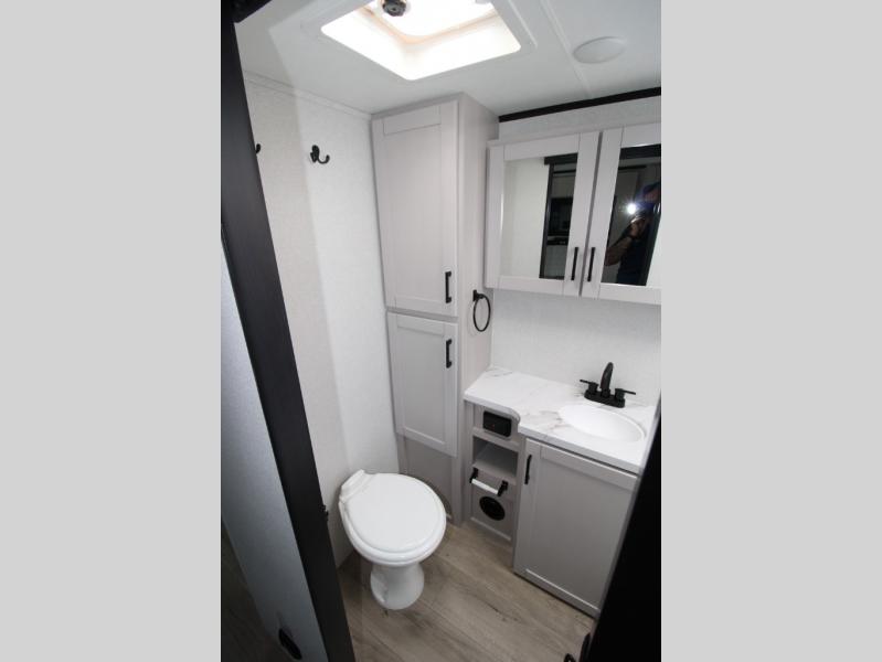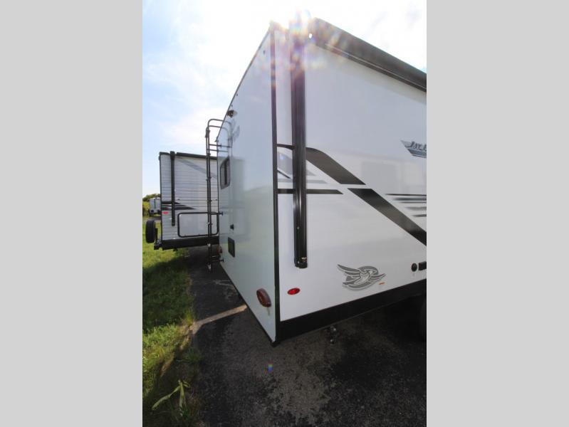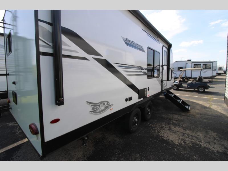 With any Jay Feather travel trailer by Jayco, you will enjoy lightweight towing, convenient exterior amenities, and at-home comforts inside! The Overlander 1 Solar Package included within the Jay Sport Package comes with a 200W solar panel and a 30-amp digital controller so you can enjoy some off-grid camping. There is also a modern graphics package with a dual-colored sidewall, LCI Solid Step fold-down aluminum tread steps on the main entry door, and Climate Shield 0 -100° F tested weather insulation package that will allow you to camp in all sorts of climates. The Customer Value Package will make time outdoors easier than ever with a power tongue jack and a Rock Solid stabilizer system, plus American-made nitro-filled Goodyear tires with self-adjusting electric brakes. More exterior features include a Keyed-Alike locking system, marine grade exterior speakers, a Magnum Truss roof system, and the list goes on! And we haven't even touched on the interior comforts, like the residential style seamless countertops and vinyl flooring throughout, decorative backsplash, handcrafted hardwood door/drawer fronts, and multiple USB charging ports to keep you going!