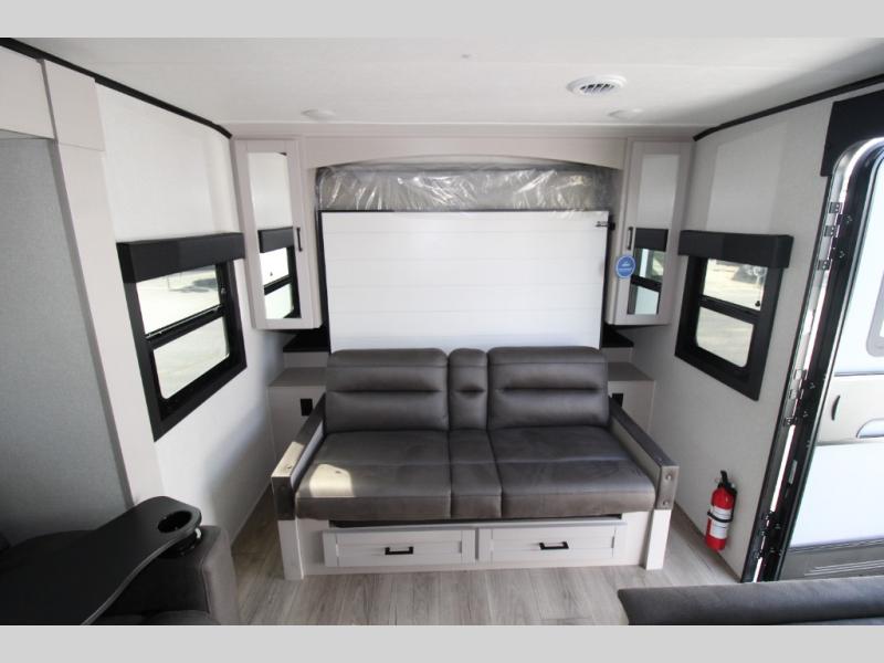 If you wish to escape the hustle and bustle of everyday life then you need this travel trailer! It features a front 60" x 75" Murphy bed with wardrobes on either side for bedtime and a jackknife sofa during the day. You can play games at the booth dinette after enjoying a delicious meal prepared with the three burner cooktop or relax at the theater seating with table trays and enjoy the LED TV. The rear corner bathroom has a shower with a skylight for you to get cleaned up in, as well as a linen closet to store your towels. There is exterior storage space to keep your outdoor gear, a 15' power awning to protect you from the elements.