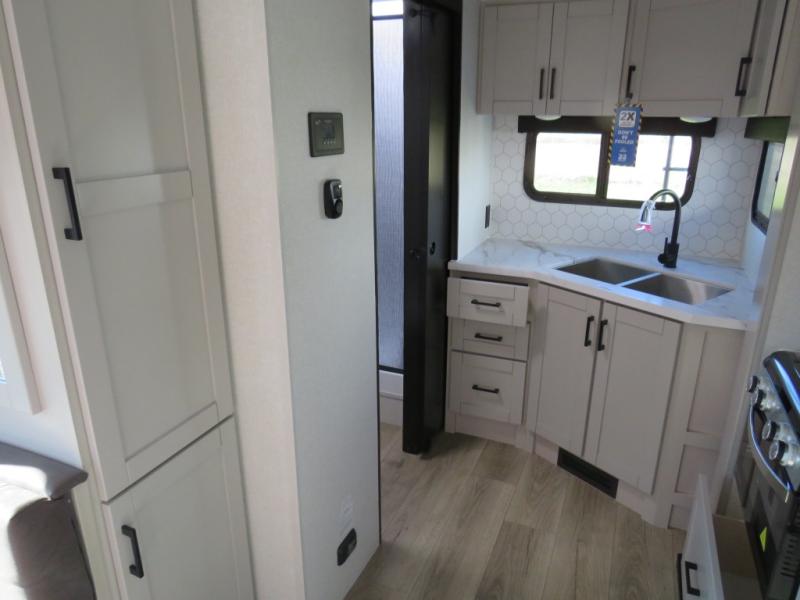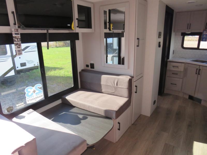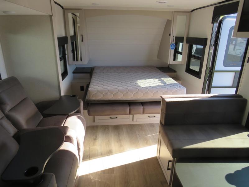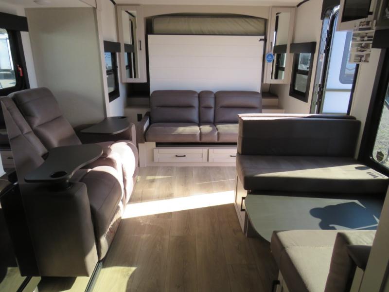 If you wish to escape the hustle and bustle of everyday life, then you need this travel trailer! It features a front Murphy bed with wardrobes on either side for bedtime and a jack-knife sofa during the day. You can play games at the booth dinette after enjoying a delicious meal prepared with the three burner cooktop or relax at the theater seating and enjoy the LED TV. The rear corner bathroom has a shower with a skylight for you to get cleaned up in, as well as a linen closet to store your towels. There is exterior storage space to keep your outdoor gear, a 15' power awning to protect you from the elements.