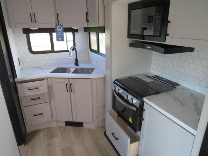 With any Jay Feather travel trailer by Jayco, you will enjoy lightweight towing, convenient exterior amenities, and at-home comforts inside! The Overlander 1 Solar Package included within the Jay Sport Package comes with a 200W solar panel and a 30-amp digital controller so you can enjoy some off-grid camping. There is also a modern graphics package, Solid fold-down step with aluminum tread steps on the main entry doorstep, and Climate Shield 0 -100° F tested weather insulation package that will allow you to camp in various types of climates. The Customer Value Package will make time outdoors easier than ever with a power tongue jack and Automotive-style aluminum rims, plus radial tires with self-adjusting electric brakes. More exterior features include a Keyed-Alike doors, a Magnum Truss roof system, and the list goes on! And we haven't even touched on the interior comforts, like the seamless countertops and Residential vinyl flooring throughout, decorative kitchen backsplash, handcrafted hardwood door/drawer fronts, and multiple USB charging ports to keep you going!