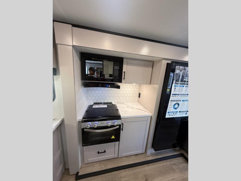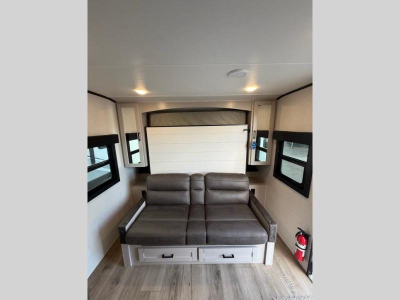 If you wish to escape the hustle and bustle of everyday life, then you need this travel trailer! It features a front Murphy bed with wardrobes on either side for bedtime and a jack-knife sofa during the day. You can play games at the booth dinette after enjoying a delicious meal prepared with the three burner cooktop or relax at the theater seating and enjoy the LED TV. The rear corner bathroom has a shower with a skylight for you to get cleaned up in, as well as a linen closet to store your towels. There is exterior storage space to keep your outdoor gear, a 15' power awning to protect you from the elements.