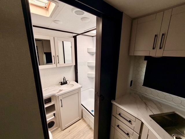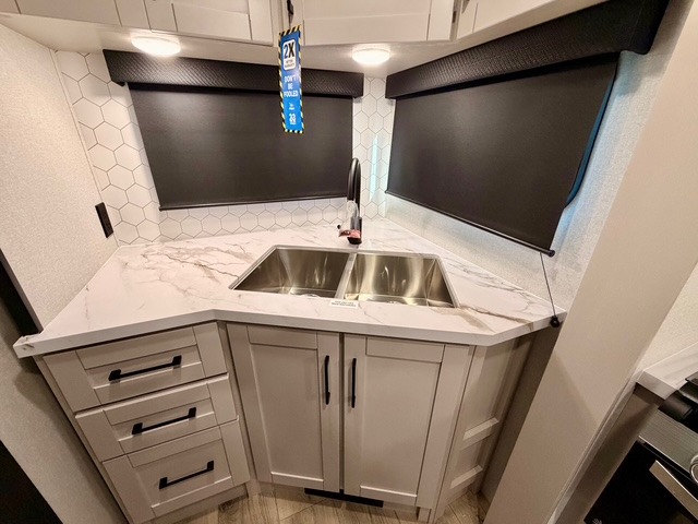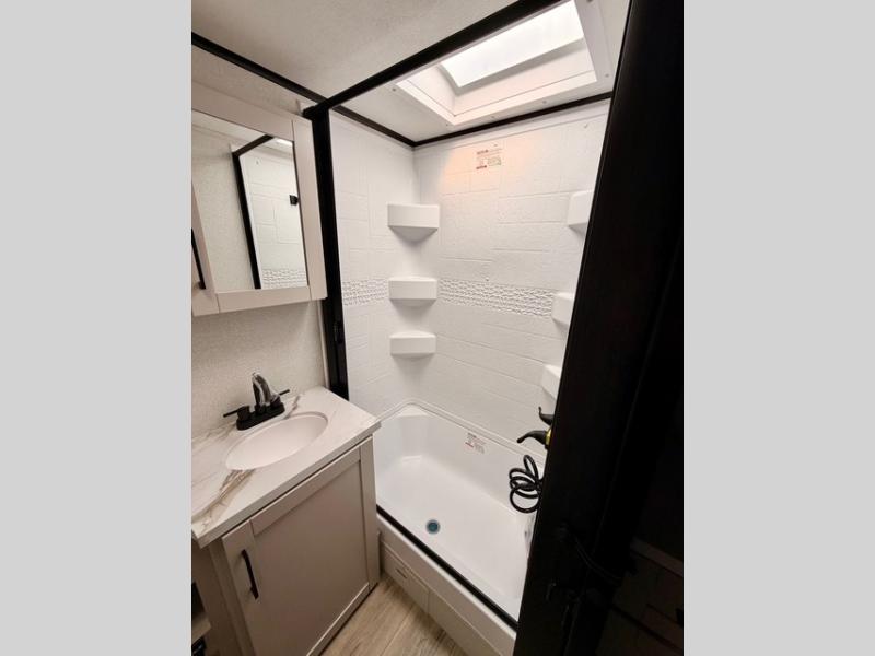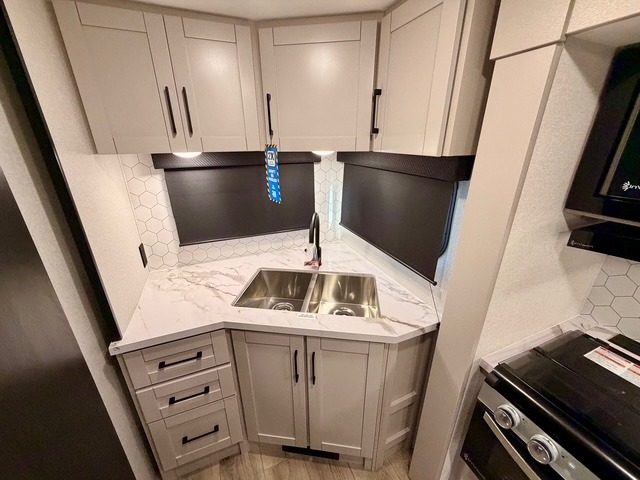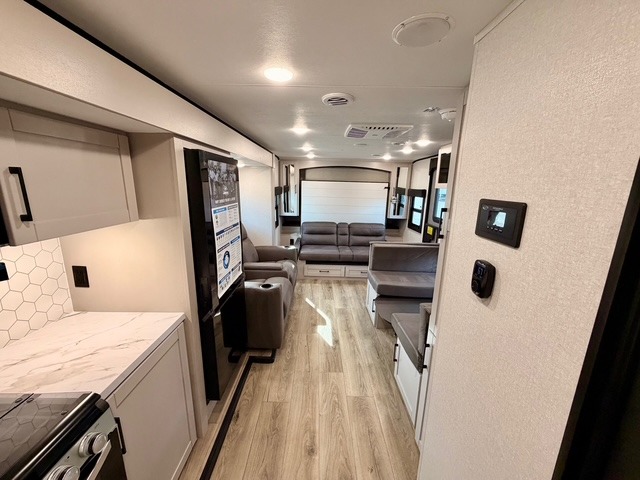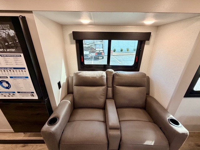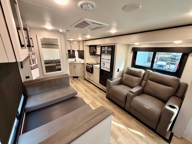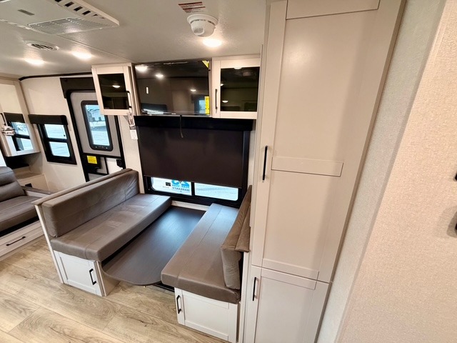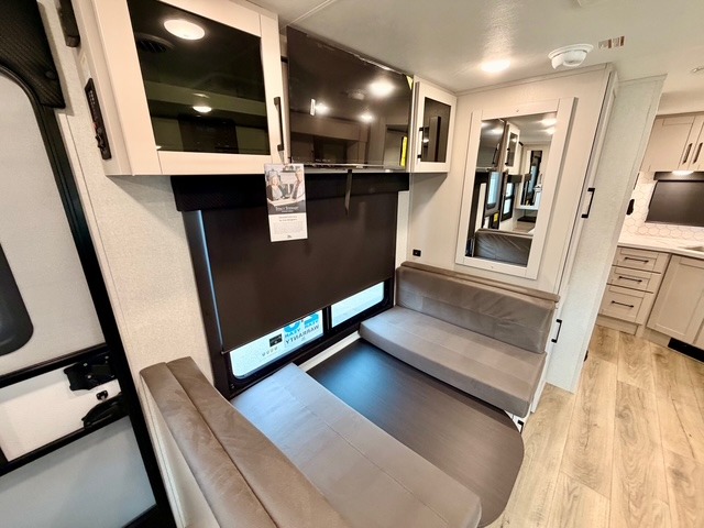 The kitchen is fully equipped for any culinary task, boasting a three-burner cooktop, oven, and seamless countertops with a decorative backsplash. You can enjoy your meals at the booth dinette or relax in the theater seats to catch a movie on the LED TV. The rear corner bathroom is bright and airy thanks to a large skylight in the shower, and it includes a dedicated linen closet to keep your towels and toiletries organized.