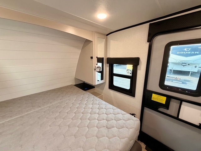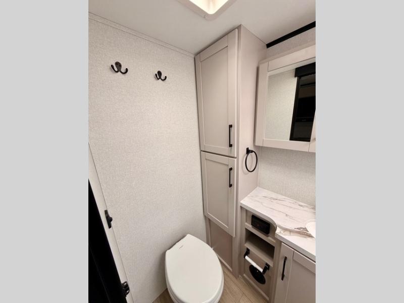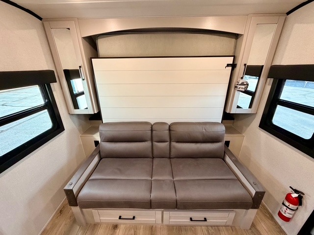 If you are looking to escape the hustle and bustle without sacrificing living space, the 21MML is the perfect solution. It features a brilliant front Murphy bed system that offers a comfortable walk-around queen bed at night and folds away to reveal a jack-knife sofa for daytime lounging. This dual-purpose design, combined with the theater seating in the slide-out, gives this 25' trailer the interior feel of a much larger coach.