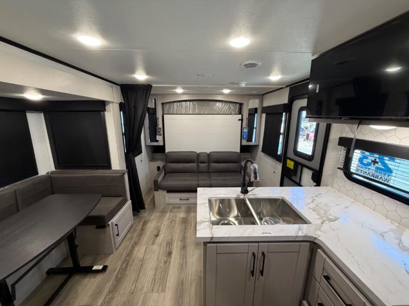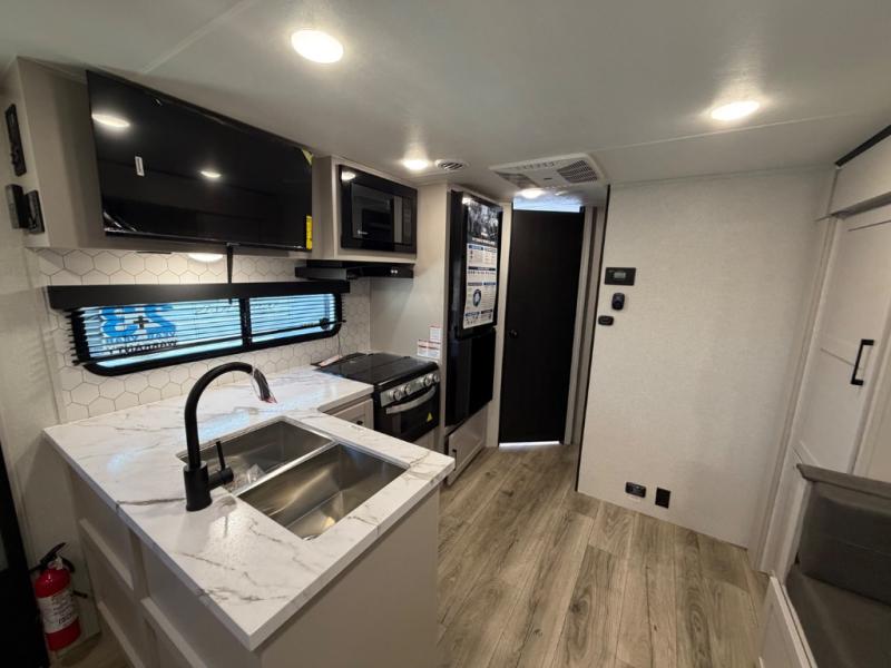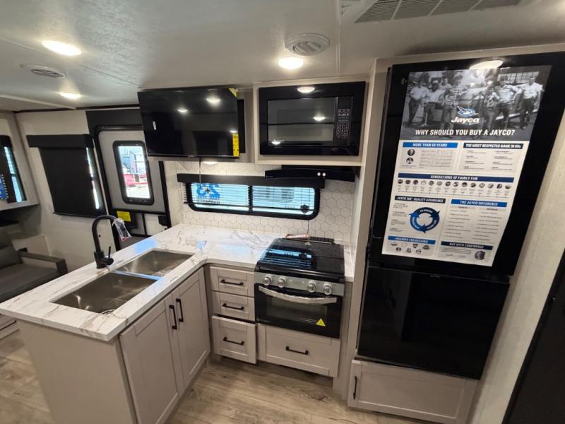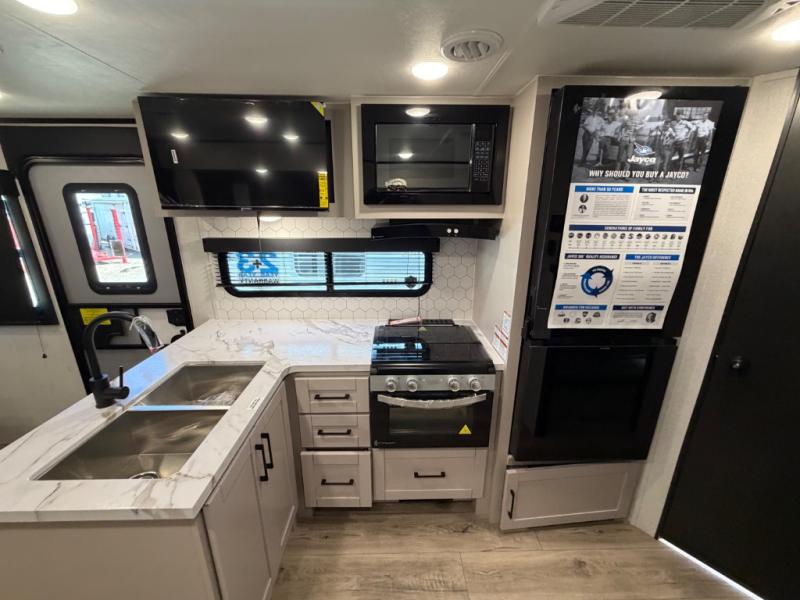 With any Jay Feather travel trailer by Jayco, you will enjoy lightweight towing, convenient exterior amenities, and at-home comforts inside! The Overlander 1 Solar Package included within the Jay Sport Package comes with a 200W solar panel and a 30-amp digital controller so you can enjoy some off-grid camping. There is also a modern graphics package, Solid fold-down step with aluminum tread steps on the main entry doorstep, and Climate Shield 0 -100° F tested weather insulation package that will allow you to camp in various types of climates. The Customer Value Package will make time outdoors easier than ever with a power tongue jack and Automotive-style aluminum rims, plus radial tires with self-adjusting electric brakes. More exterior features include a Keyed-Alike doors, a Magnum Truss roof system, and the list goes on! And we haven't even touched on the interior comforts, like the seamless countertops and residential vinyl flooring throughout, decorative kitchen backsplash, handcrafted hardwood door/drawer fronts, and multiple USB charging ports to keep you going!