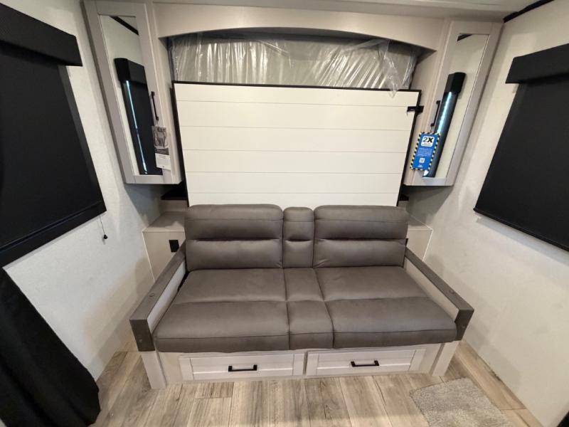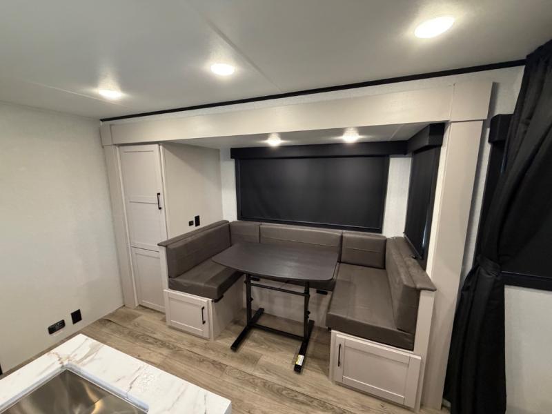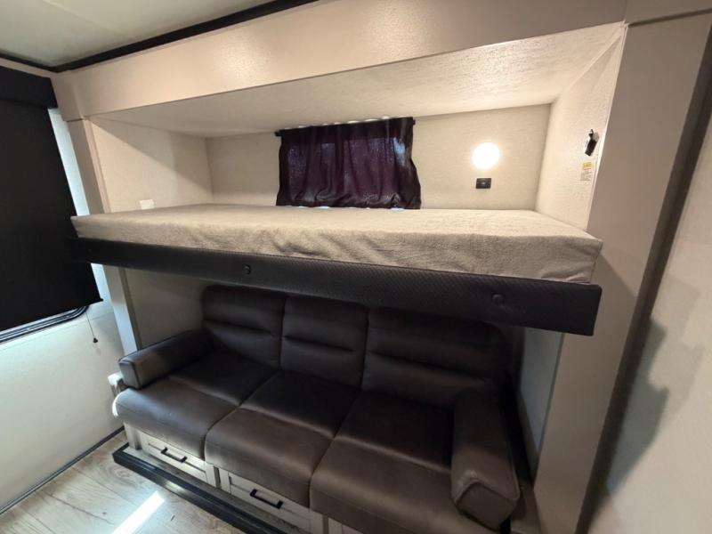 There is sleeping space for six in this spacious travel trailer, so let the grandkids invite friends or bring along neighbors! The rear corner bunkhouse includes a dresser for clothes and a 30" x 75" flip-up bunk above a jack-knife sofa below, both of which are housed in a slide out for more space. The adjacent full bath includes one of the dual entry doors to the unit for added convenience, and you'll find the other entrance up front near the bedroom. Here, a queen-size Murphy bed can be folded up in the morning, allowing you space to relax on the jack-knife sofa. Additional seating and sleeping space can be found on the U-shaped dinette, which is in a slide out for more space here as well. The chef of your group will have a three-burner cooktop and microwave oven to make meals, along with a 12V refrigerator and a wardrobe/pantry for food and necessities!