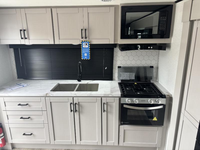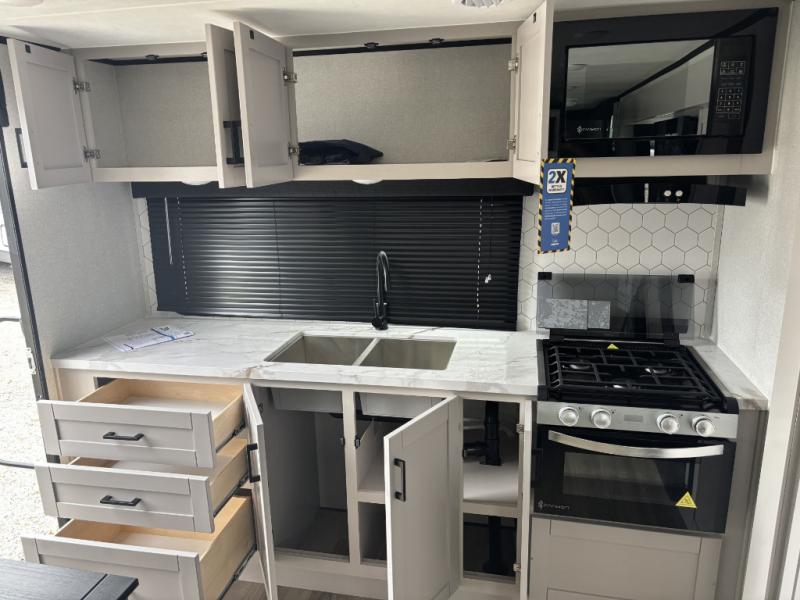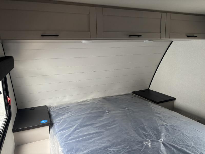 With any Jay Feather travel trailer by Jayco, you will enjoy lightweight towing, convenient exterior amenities, and at-home comforts inside! The Overlander 1 Solar Package included within the Jay Sport Package comes with a 200W solar panel and a 30-amp digital controller so you can enjoy some off-grid camping. There is also a modern graphics package with a dual-colored sidewall, LCI Solid Step fold-down aluminum tread steps on the main entry door, and Climate Shield 0 -100° F tested weather insulation package that will allow you to camp in all sorts of climates. The Customer Value Package will make time outdoors easier than ever with a power tongue jack and a Rock Solid stabilizer system, plus American-made nitro-filled Goodyear tires with self-adjusting electric brakes. More exterior features include a Keyed-Alike locking system, marine grade exterior speakers, a Magnum Truss roof system, and the list goes on! And we haven't even touched on the interior comforts, like the residential style seamless countertops and vinyl flooring throughout, decorative backsplash, handcrafted hardwood door/drawer fronts, and multiple USB charging ports to keep you going!